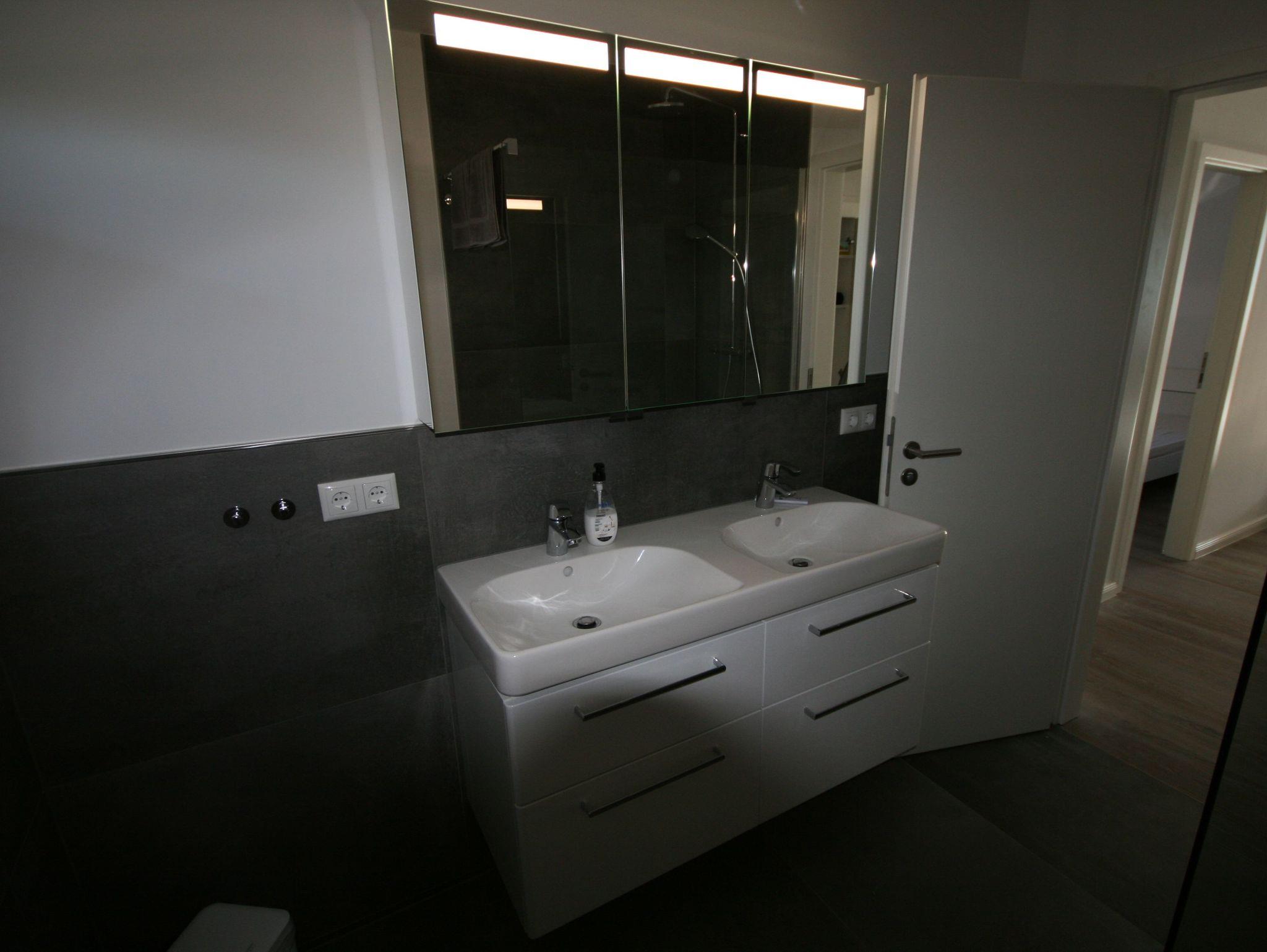 Bad mit ebenerdiger Dusche und Doppelwaschbecken