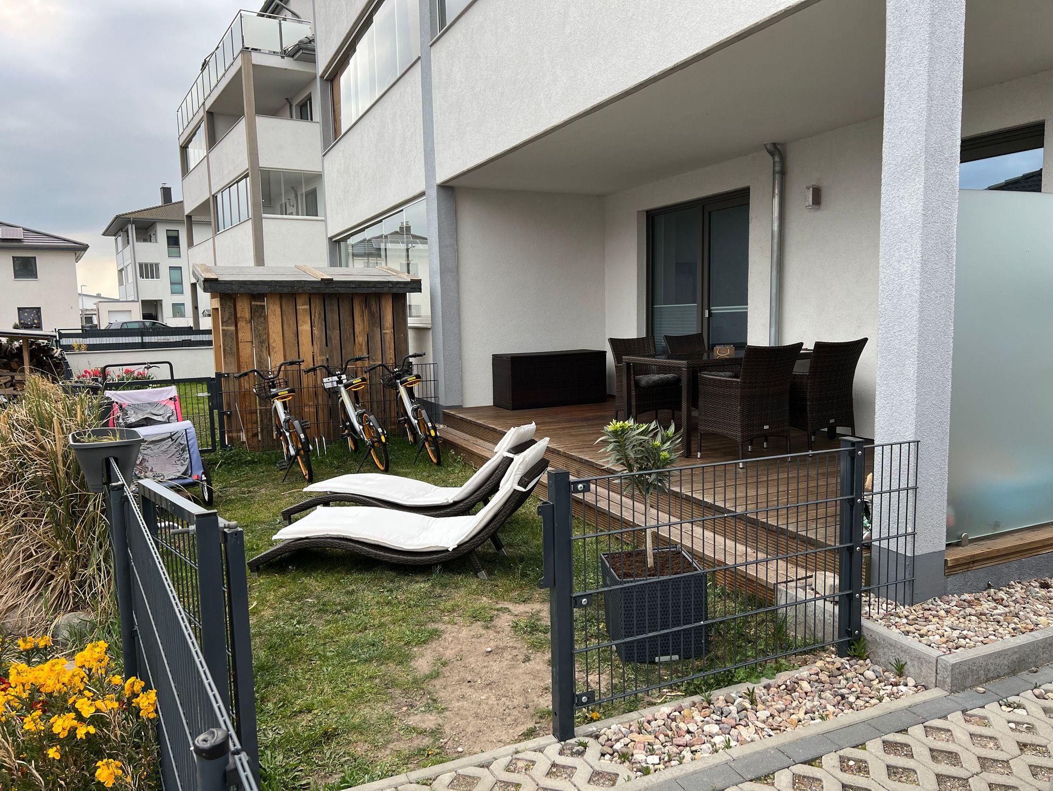 Auf der zur Wohnung gehörenden Terrasse mit Gartenmöbeln können Sie mit einem gemütlichen Frühstück in den Tag starten oder den Tag bei einem schönen Glas Wein ausklingen lassen. Der kleine Garten ist komplett umzäunt und bietet auch eine Abstellmöglichkeit für Fahrräder. Das Grillen ist auf der Terrasse gestattet. Ein Grill ist nicht vorhanden.