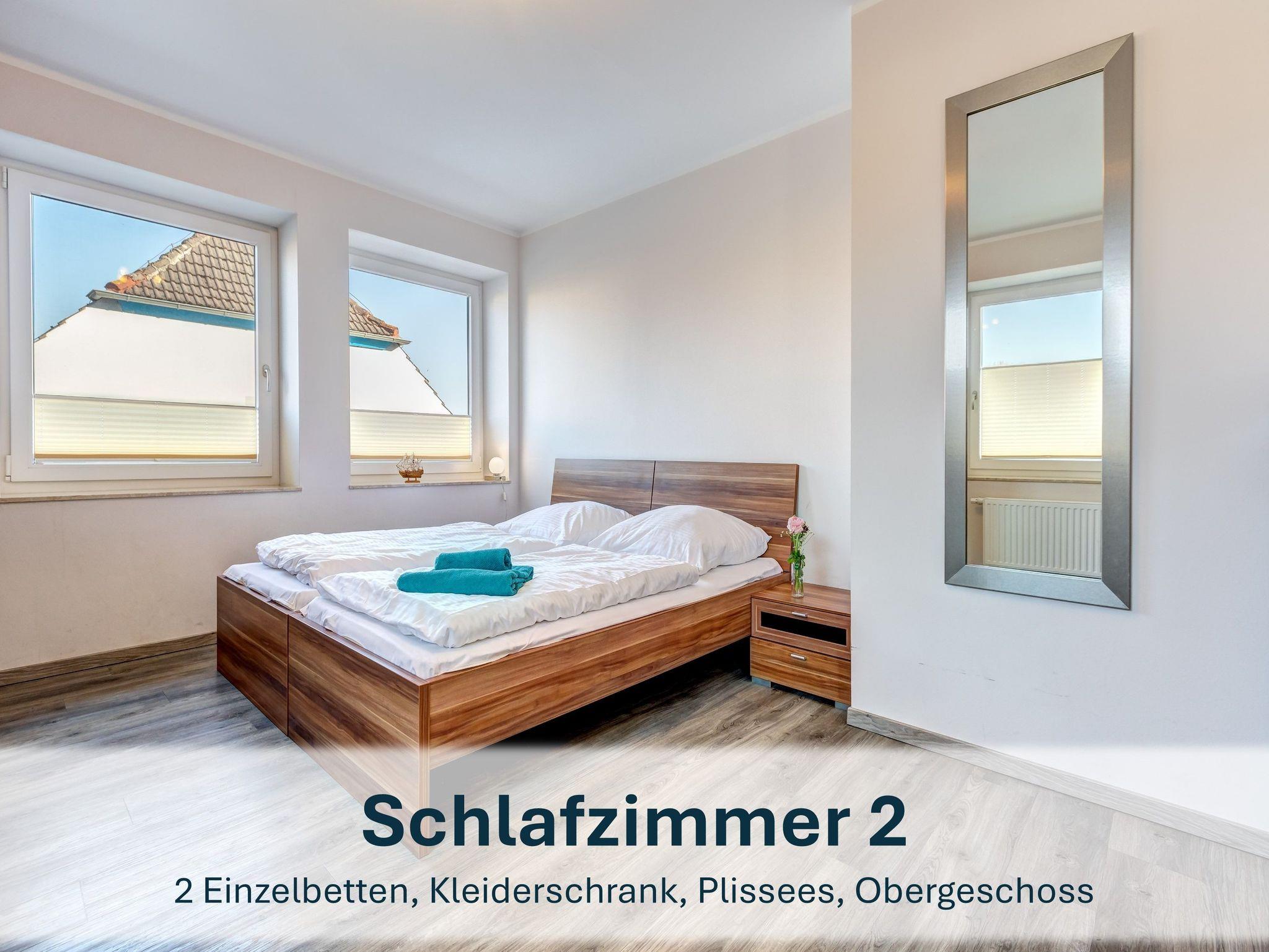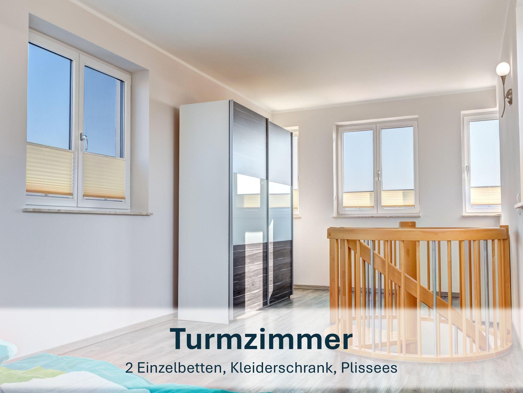 Im Obergeschoss befindet sich ein Schlafzimmer mit zwei Einzelbetten, die zusammengeschoben werden können. Über eine Wendeltreppe erreichen Sie das zweite Schlafzimmer im Turmzimmer ? ebenfalls mit zwei Einzelbetten. Beide Zimmer verfügen über Kleiderschränke.