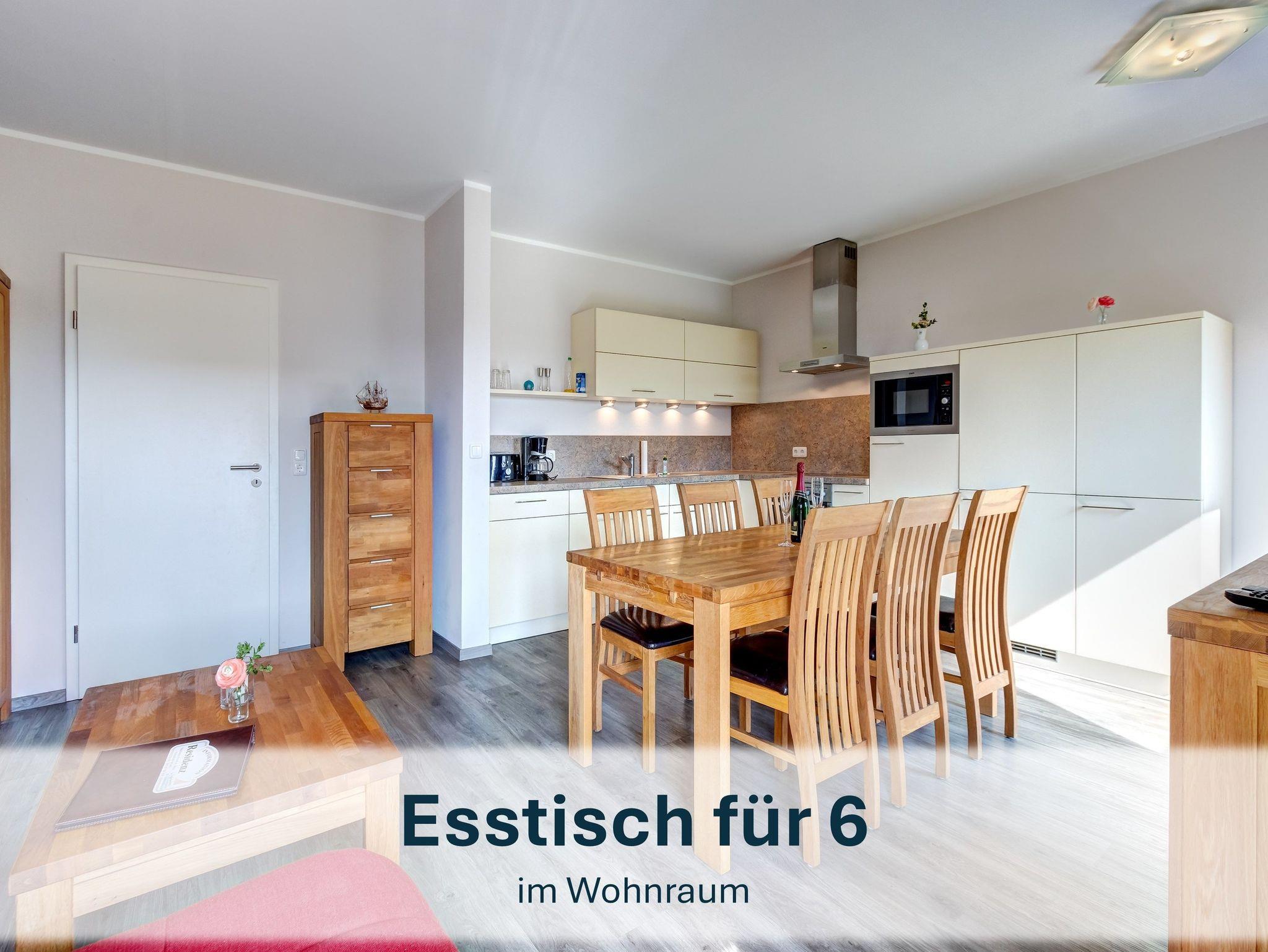 Zwei komfortable Schlafzimmer sorgen für erholsame Nächte: eines mit Doppelbett, das andere mit zwei flexibel stellbaren Einzelbetten. Der gemütliche Wohnbereich mit Schlafcouch, Flat-TV und Esstisch lädt zum Entspannen ein. Die angrenzende, voll ausgestattete Küche verfügt über Spülmaschine, Cerankochfeld, Backofen, Mikrowelle, Kühlschrank mit Gefrierfach, Kaffeemaschine, Toaster und Wasserkocher ? perfekt für gemeinsame Kochabende.