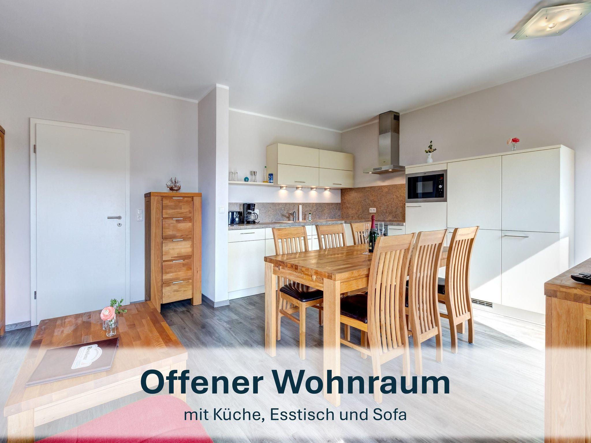 Im großzügigen Wohnbereich erwarten Sie eine Schlafcouch, ein Flat-TV sowie kostenfreies WLAN. Die angrenzende, offene Küche ist voll ausgestattet ? inklusive Spülmaschine, Ceranfeld, Backofen, Mikrowelle, Kühlschrank mit Gefrierfach, Kaffeemaschine, Wasserkocher und Toaster. Das moderne Bad verfügt über eine ebenerdige Dusche. Die möblierte Sonnenterrasse lädt zum Verweilen im Freien ein.