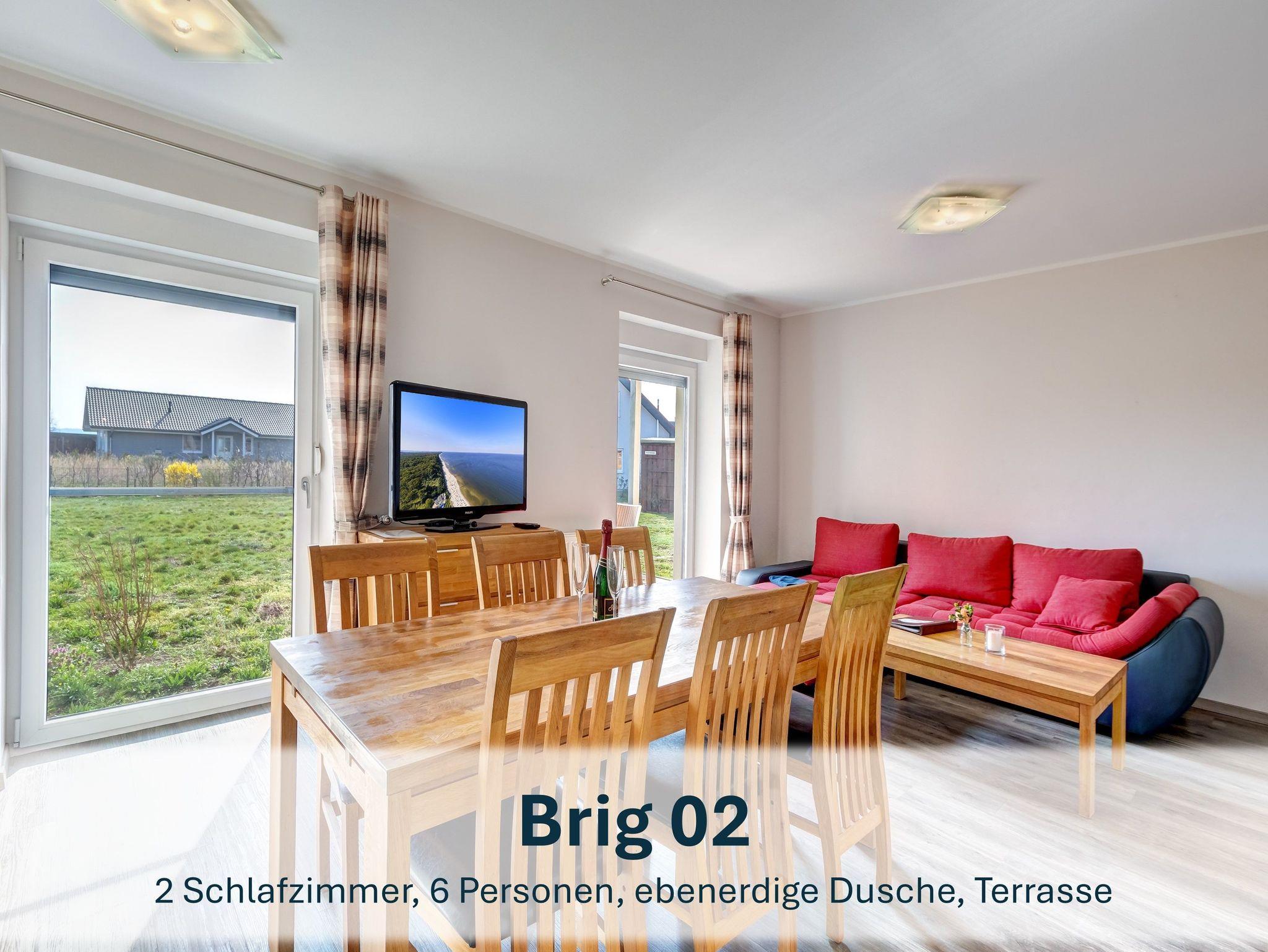 Die Ferienwohnung „Brig 02“ befindet sich im Erdgeschoss und bietet auf 83m² Wohnfläche Platz für bis zu 5 Erwachsene und ein Kleinkind bis 3 Jahre. Ein separater, ebenerdiger Zugang macht die Wohnung besonders komfortabel. Sie verfügt über zwei Schlafzimmer ? eines mit Doppelbett, das andere mit zwei Einzelbetten, die bei Bedarf zusammengeschoben werden können.