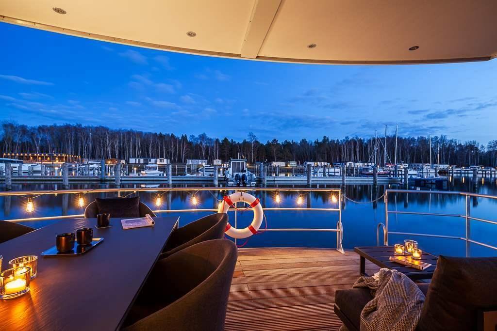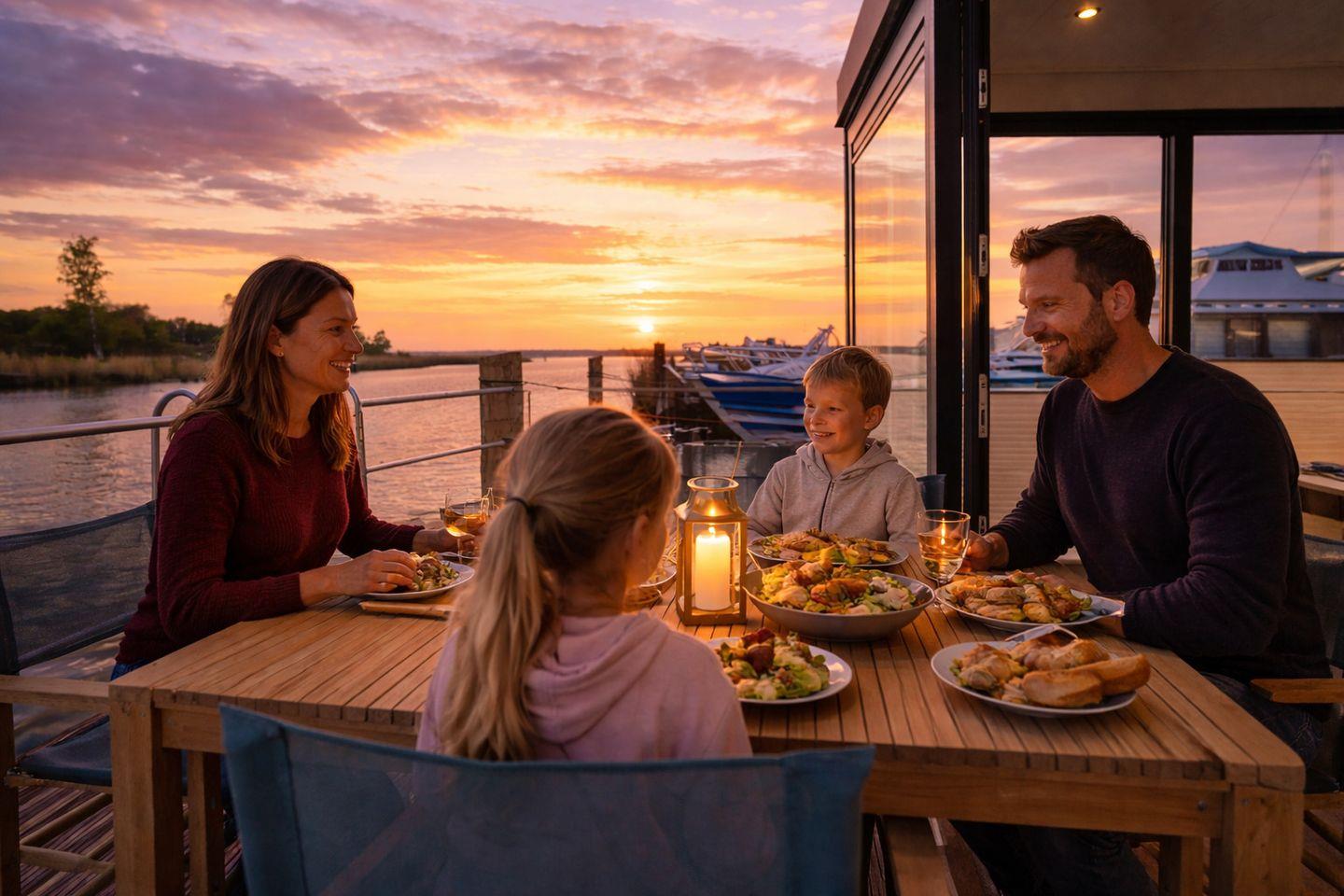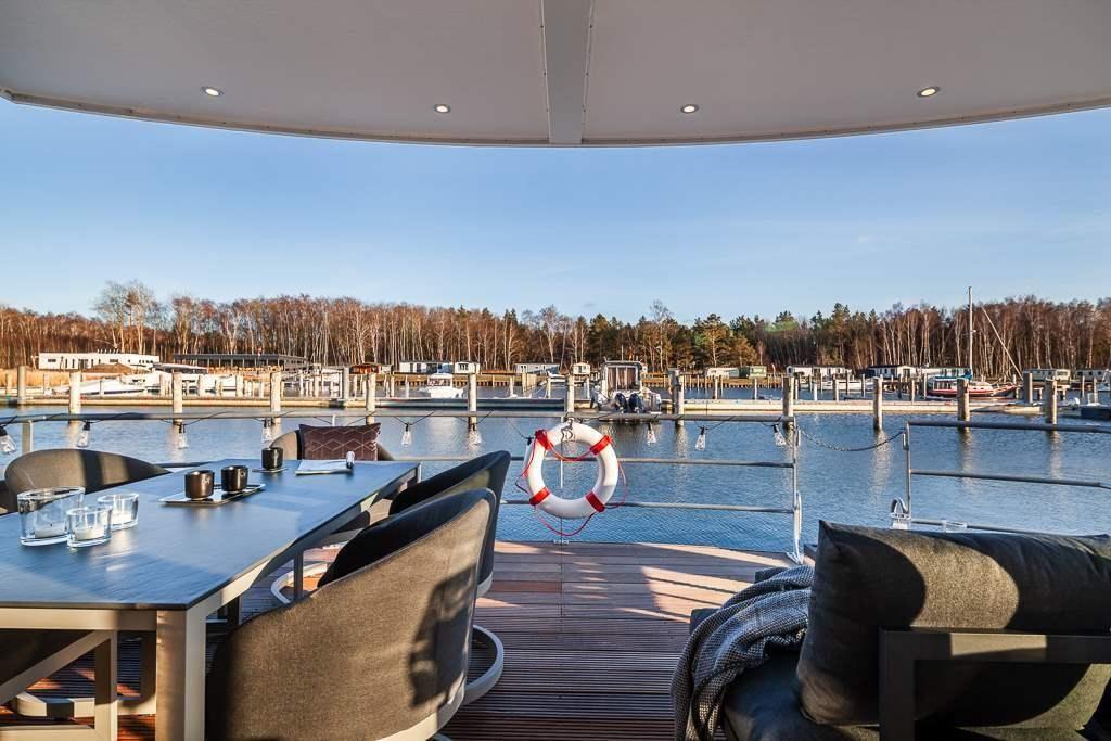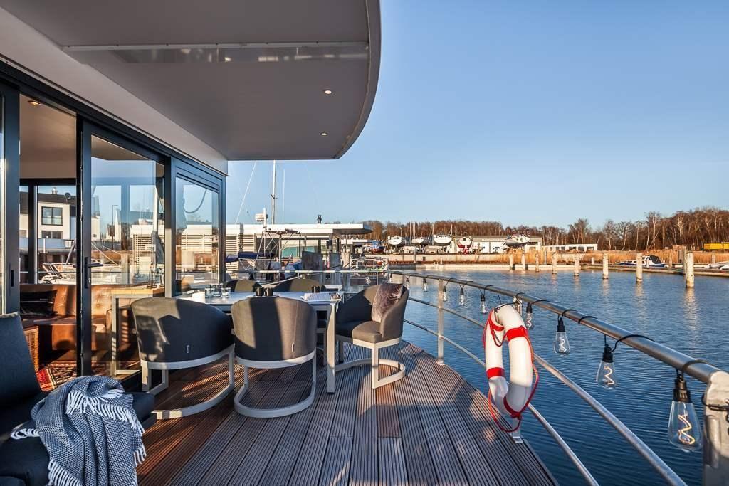 Draußen laden eine überdachte Terrasse mit Gartenmöbeln, Sonnenliegen und Sonnenschutz zum Verweilen ein. Ein Elektrogrill ergänzt die Möglichkeiten für gemeinsame Mahlzeiten im Freien – mit Blick auf das Wasser und die Umgebung.