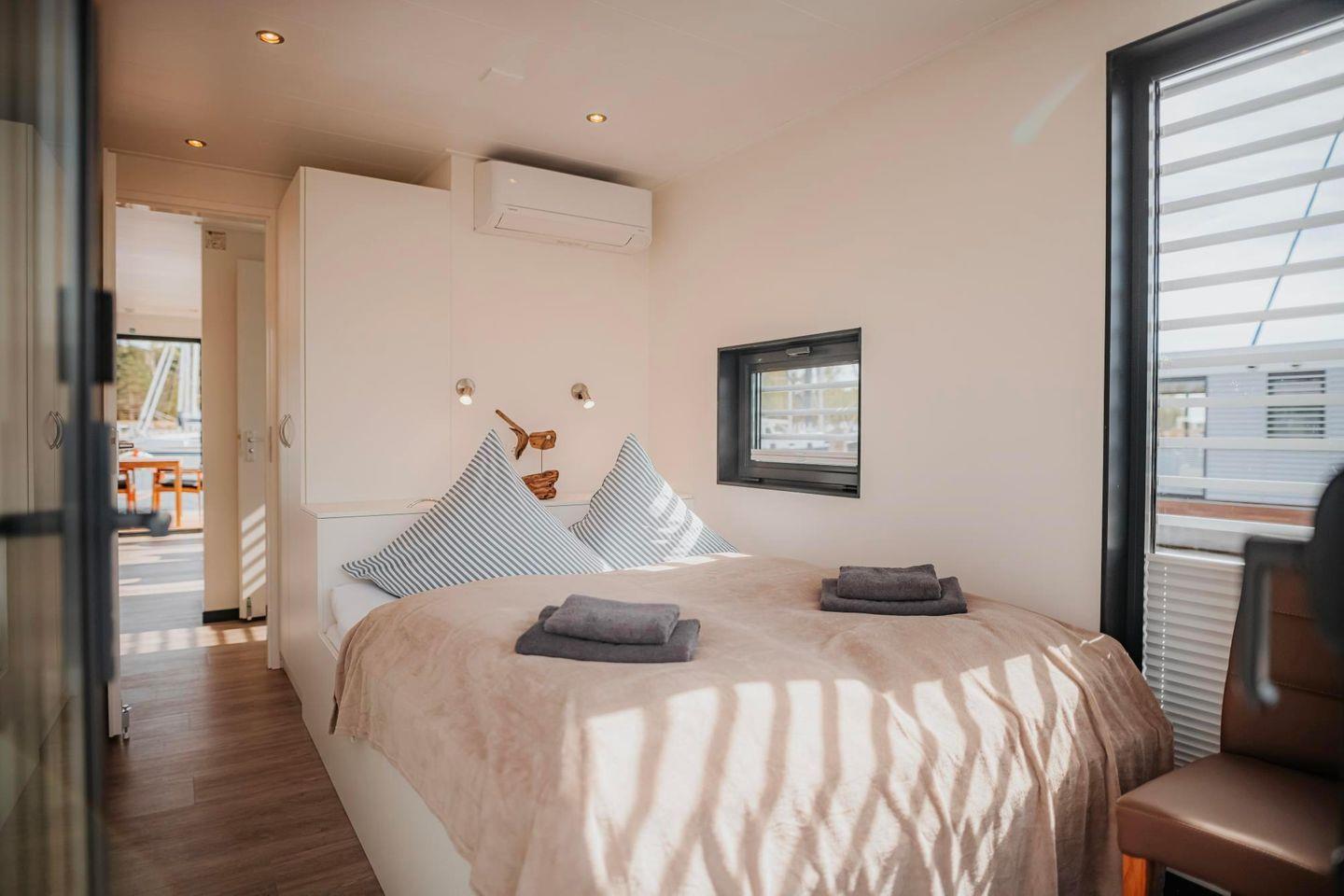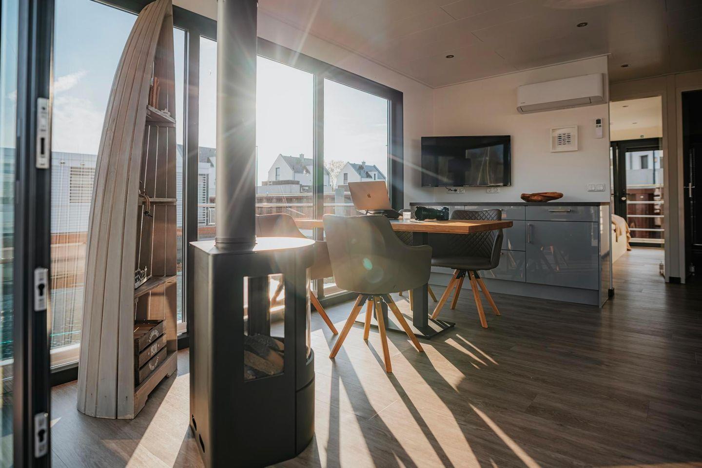 Auf 44 m² erwarten Sie insgesamt 3 Zimmer, darunter 2 Schlafzimmer und 1 Badezimmer. Das Floatinghouse ist für bis zu 4 Schlafmöglichkeiten ausgelegt und eignet sich bereits ab 1 Person. Der Wohnbereich ist als gemütliches Zentrum gestaltet: mit Sofa, Sofaecke, Essbereich und Esstisch – perfekt für gemeinsame Mahlzeiten oder entspannte Abende. Für zusätzlichen Komfort sorgen Heizung, Klimaanlage sowie ein Kamin-/Ofen. Sichtschutz an allen Fenstern und Fliegengitter unterstützen ein angenehmes Wohngefühl.