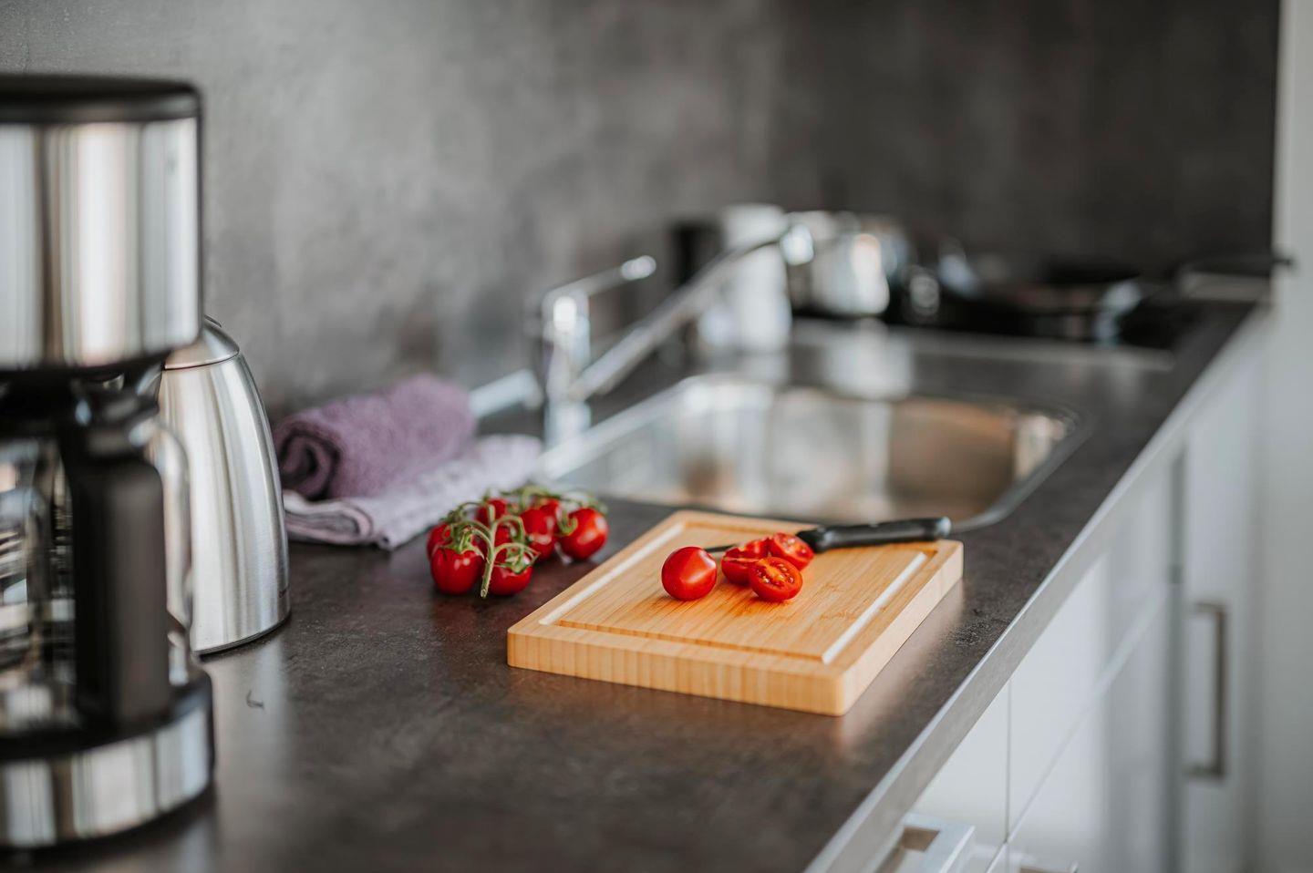 Die offene Küche ist zum Wohnzimmer hin gestaltet und vollständig ausgestattet: Ceran-Herd, Kühlschrank mit Gefrierfach, Spülmaschine sowie Küchenutensilien, Geschirr und Besteck. Für Ihren Start stehen zudem Erstausstattung, Geschirrhandtücher, Kaffeemaschine, Wasserkocher und Toaster bereit. Auch an praktische Details wie Abfalleimer wurde gedacht.