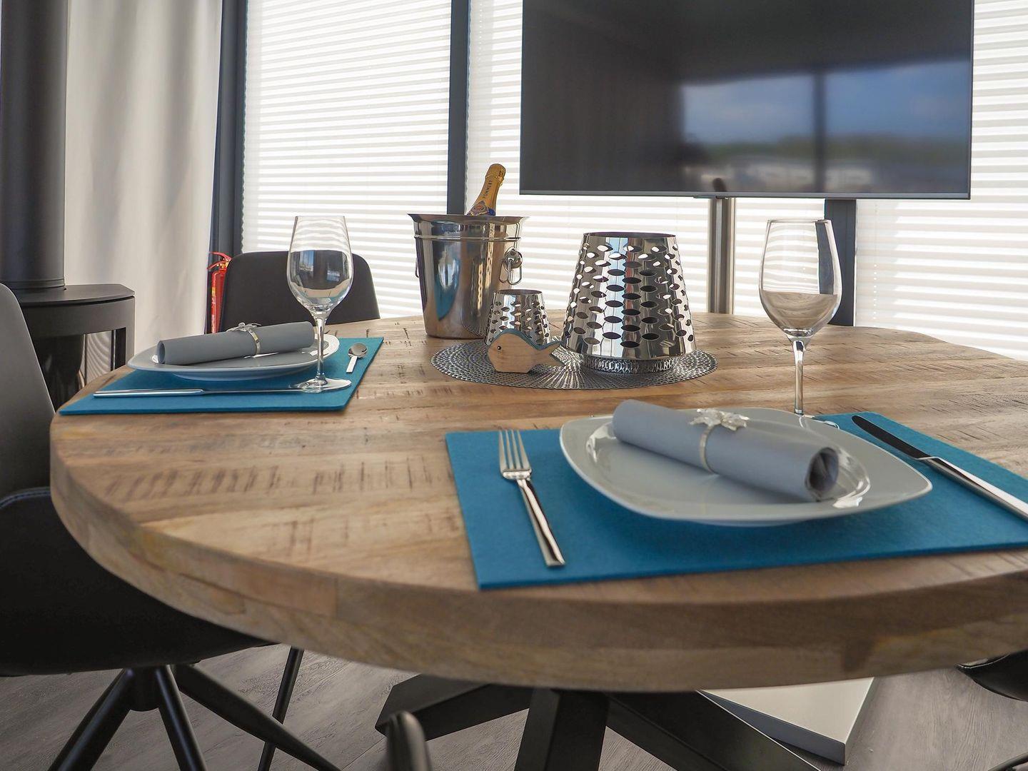 Die offene Küche zum Wohnzimmer ist vollständig ausgestattet und ideal für die Selbstversorgung: Ceran-Herd, Kühlschrank mit Gefrierfach, Spülmaschine, Kaffeemaschine, Wasserkocher, Toaster sowie Küchenutensilien, Geschirr und Besteck stehen bereit; auch Geschirrhandtücher und ein Abfalleimer sind vorhanden. Für entspannte Mahlzeiten im Freien können Sie den Elektrogrill auf der Terrasse nutzen.
