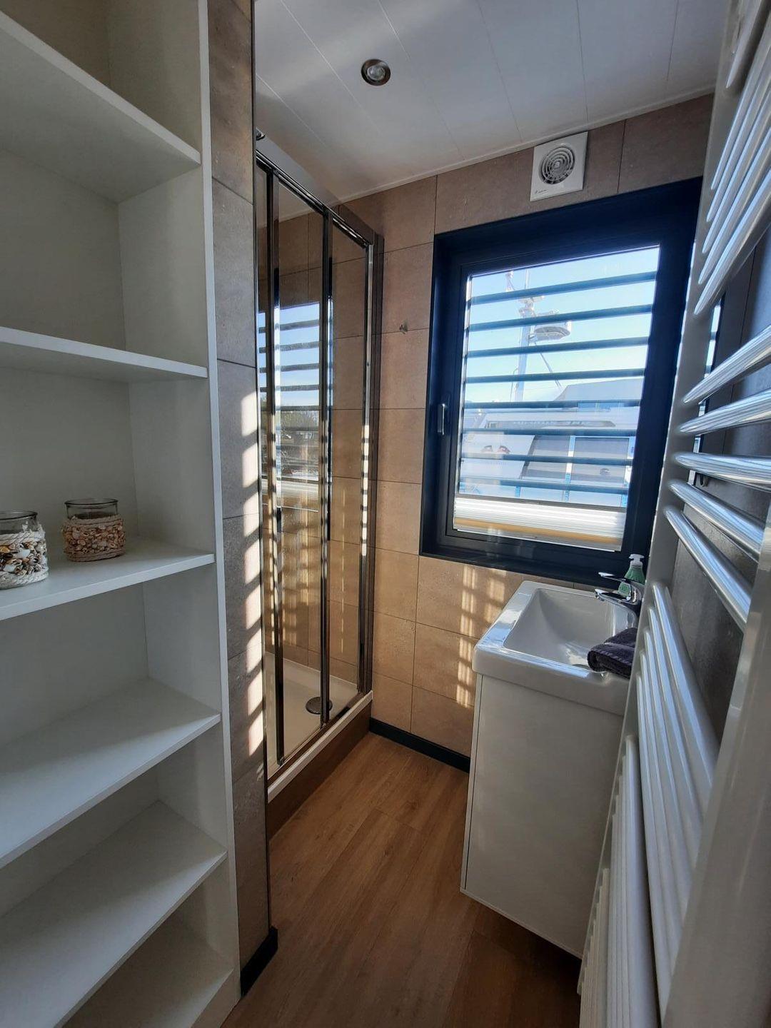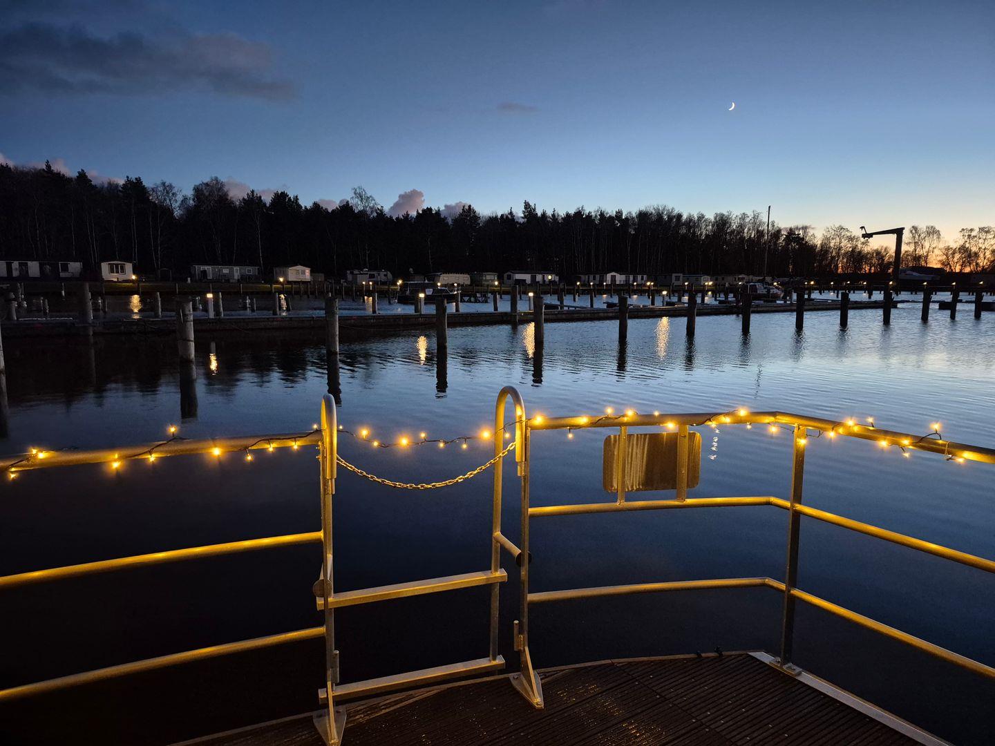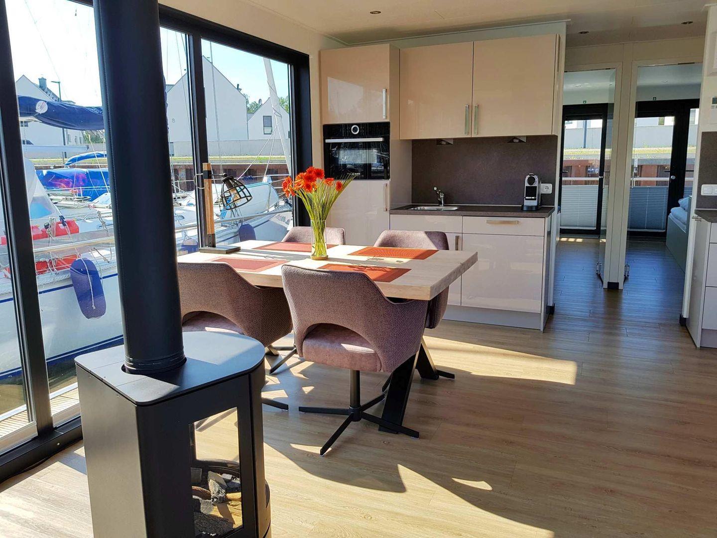 Der Wohnbereich ist komfortabel ausgestattet und verbindet sich mit einer offenen Küche zum Wohnzimmer. Für entspannte Abende stehen Ihnen eine Sofaecke, ein Esstisch, TV, Radio sowie WLAN zur Verfügung. An kühleren Tagen sorgt eine Heizung und zusätzlich ein Kamin-/Ofen für behagliche Wärme, während eine Klimaanlage das Raumklima unterstützt. Sichtschutz an allen Fenstern sowie Fliegengitter erhöhen den Komfort. Praktische Details wie Garderobe, Staubsauger und eine Erstausstattung sind ebenfalls vorhanden. Das gesamte Floatinghouse ist ein Nichtraucherobjekt, Kinder sind willkommen.