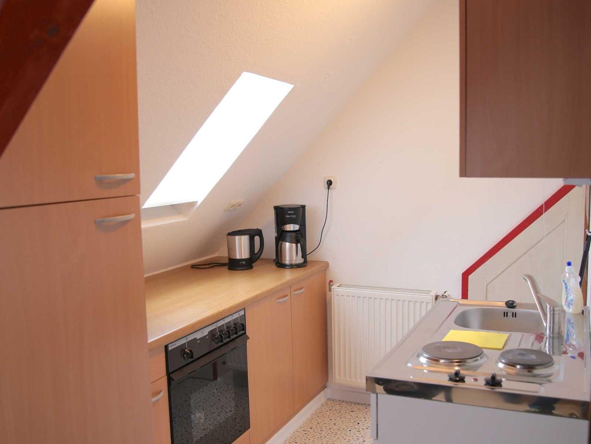 Die kleine Küche ist mit Herd, Backofen, sowie Kühlschrank mit Gefrierfach, Mikrowelle, Kaffeemaschine, Wasserkocher und dem notwendigen Geschirr sowie Geschirrtüchern ausgestattet.