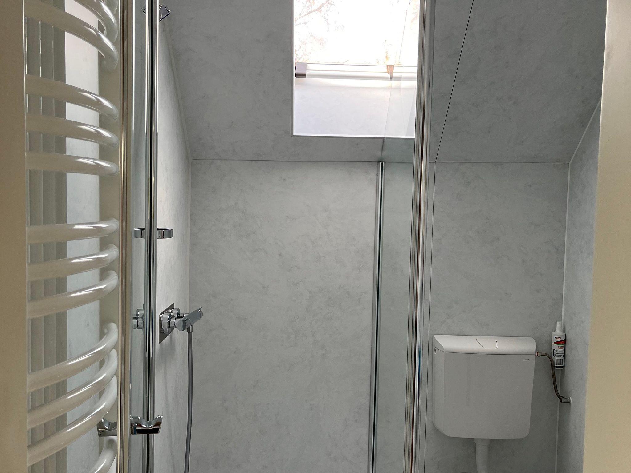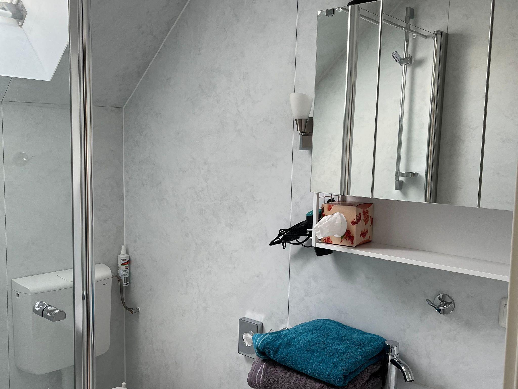 Das Badezimmer ist mit einer Dusche, WC und Waschbecken sowie ausreichend Ablagemöglichkeiten ausgestattet.