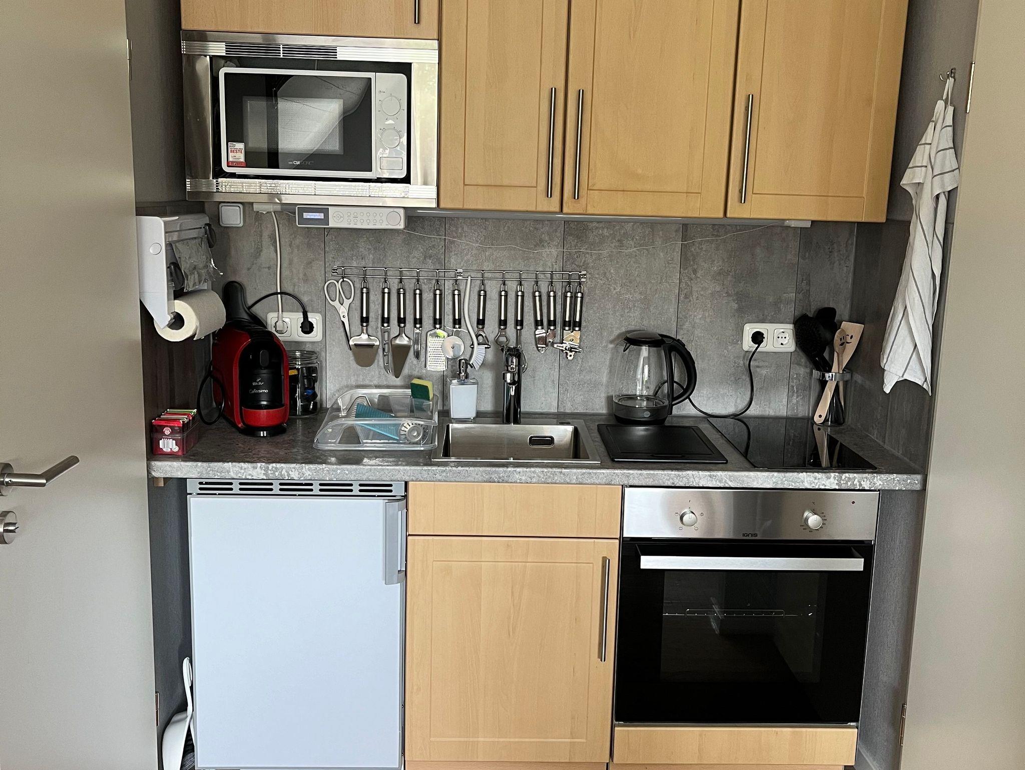 Die kleine Küche ist mit Herd, Backofen, sowie Kühlschrank mit Gefrierfach, Mikrowelle, Kaffeemaschine, Wasserkocher und dem notwendigen Geschirr sowie Geschirrtüchern ausgestattet.