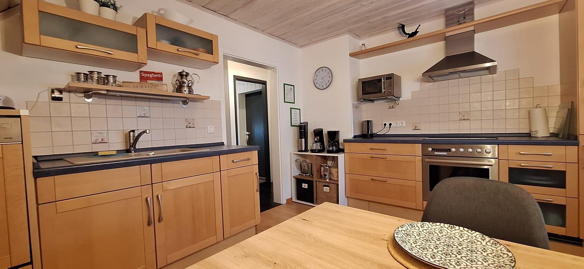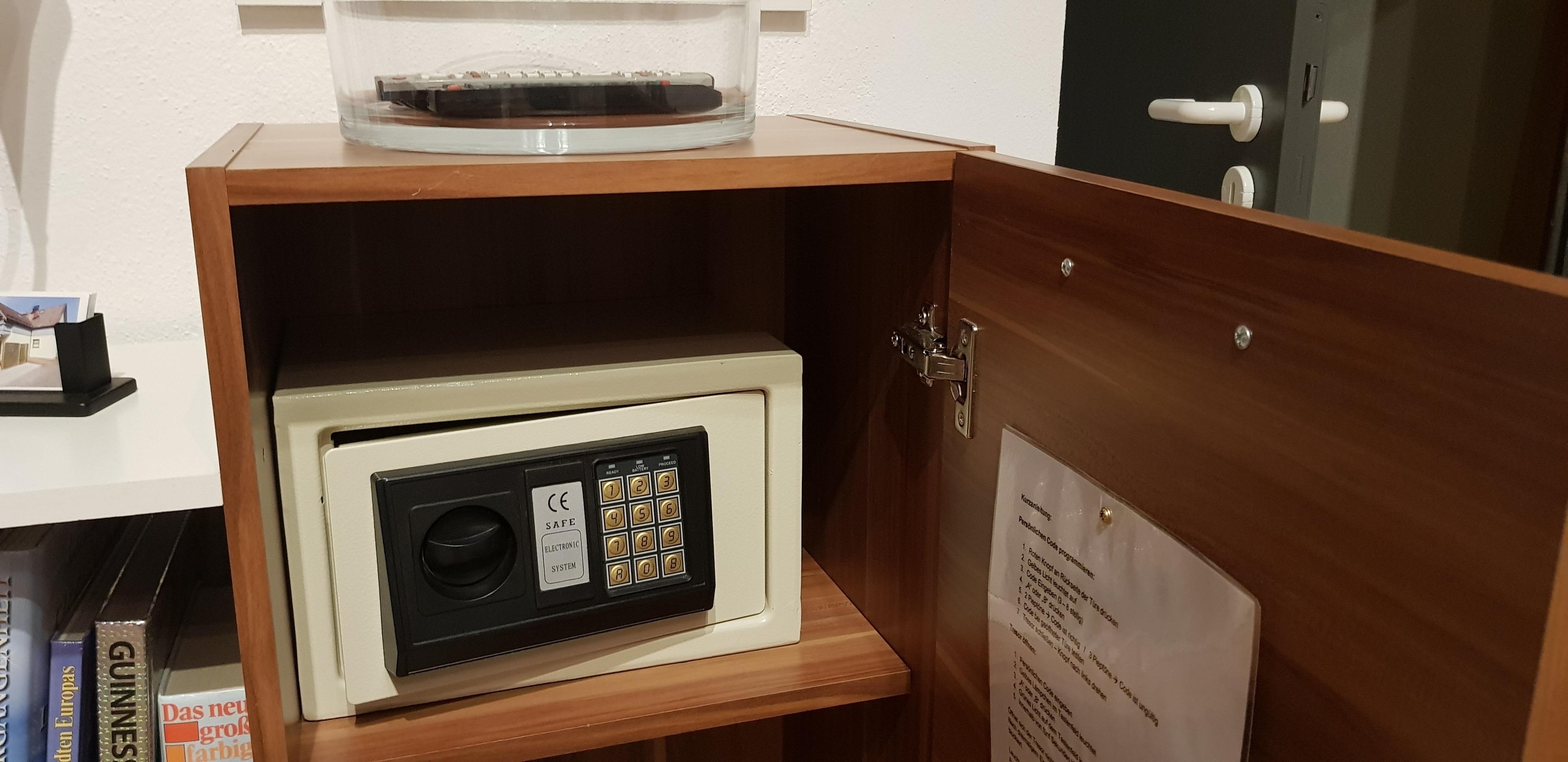 Um Wertsachen aufbewahren zu können, steht ein Tresor zur Verfügung. Für Gäste, die gerne lesen, ist ein gemütlicher Relax-Stuhl mit Leselampe im Wohnzimmer zu finden. Die Couch kann zu einem komfortablen Gästebett (1,6x2m) umgebaut werden. Außerdem befindet sich der kleine Balkon nach Süden am Wohnzimmer. Das Doppelbett im Schlafzimmer ist 2x2m groß, der Lattenrost kann am Kopf- und Fußteil in der Höhe verstellt werden. In der gemütlichen Küche befindet sich die Essgruppe, eine moderne Einbauküche ist mit Geschirrspüler, Mikrowelle und allem Nötigen ausgestattet. Neben der Küche liegt das Bad mit Dusche/WC (Fön vorhanden). Bettwäsche und Handtücher stellen wir unseren Gästen zur Verfügung. Ein SAT-TV steht Ihnen im Wohnzimmer und im Schlafzimmer zur Verfügung.