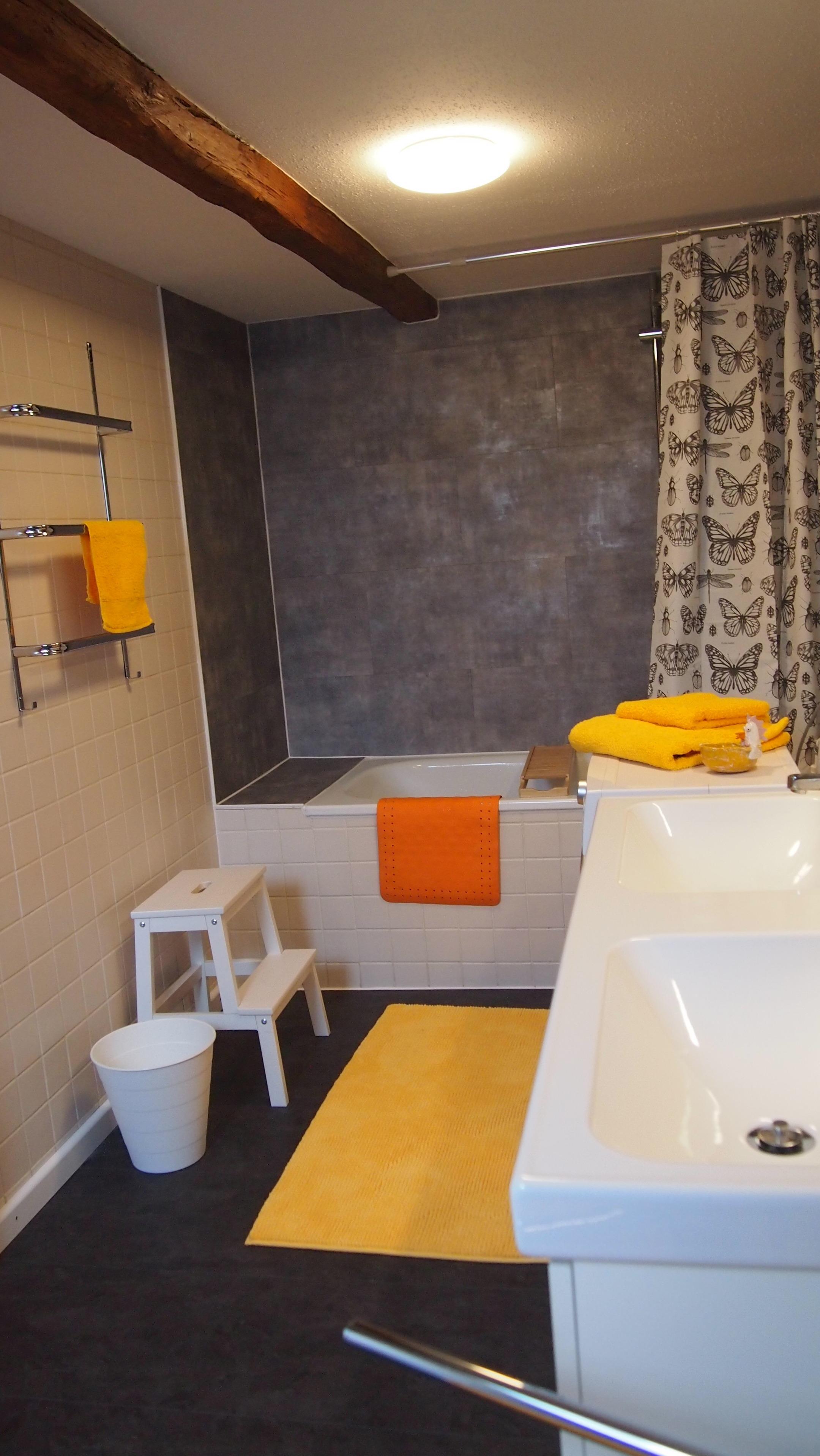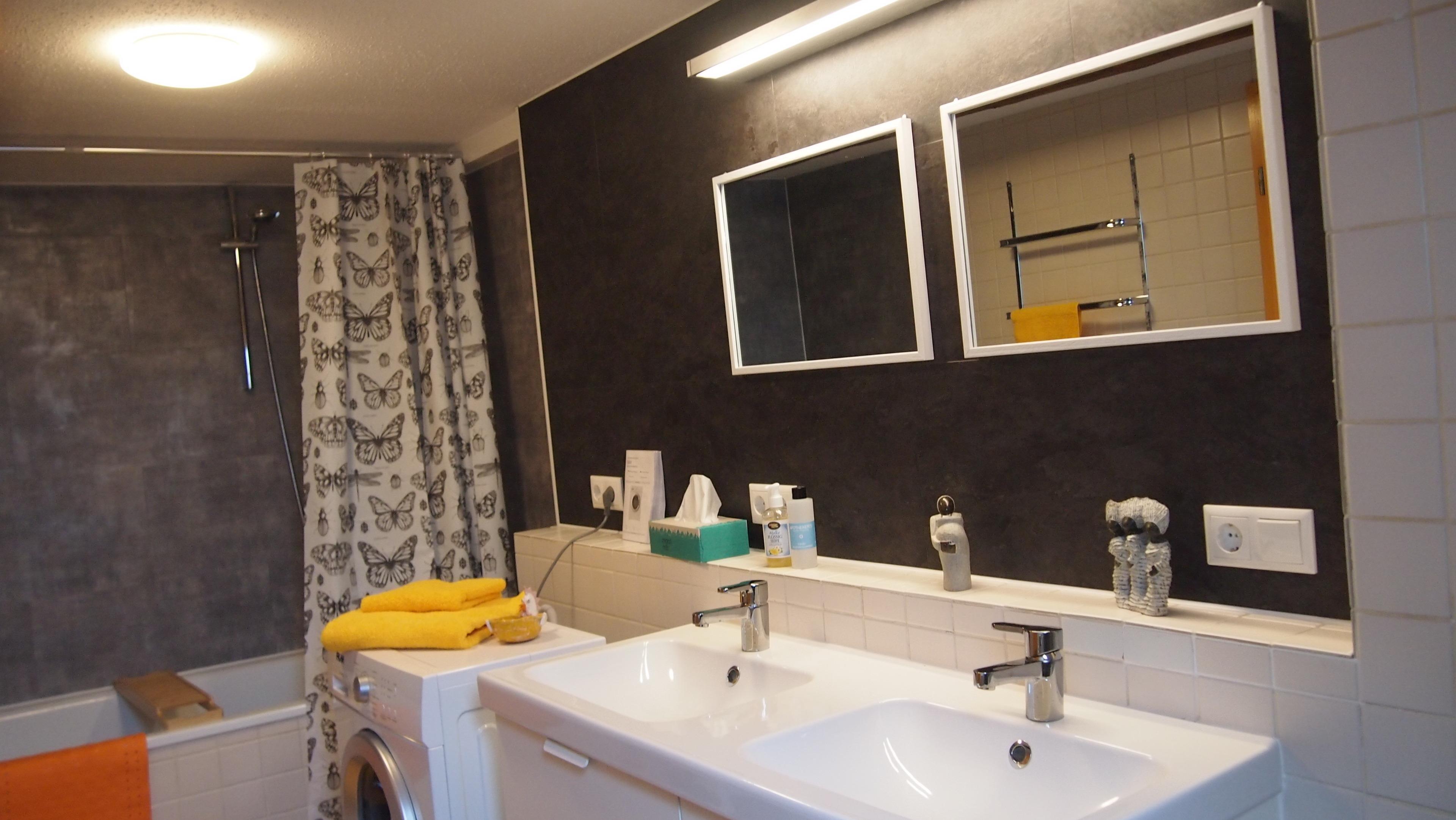 Badewanne mit Dusche, WC, Doppelwaschtisch, Waschmaschine, Fön