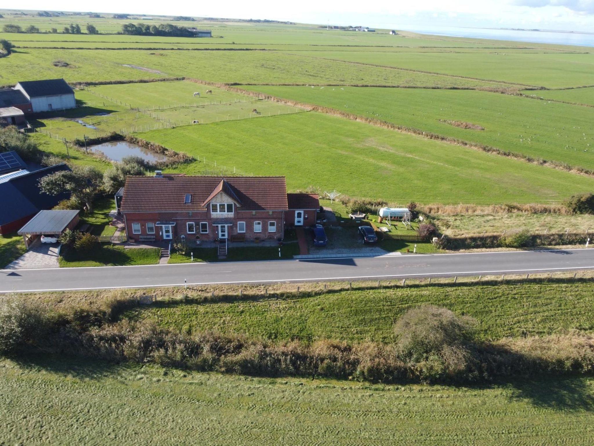 The outdoor area boasts its own terrace, which is equipped with comfortable garden furniture, a beach chair and loungers. Here you can let your gaze wander over wide meadows and fields, populated by sheep and horses, all the way to the dyke 1 km away.