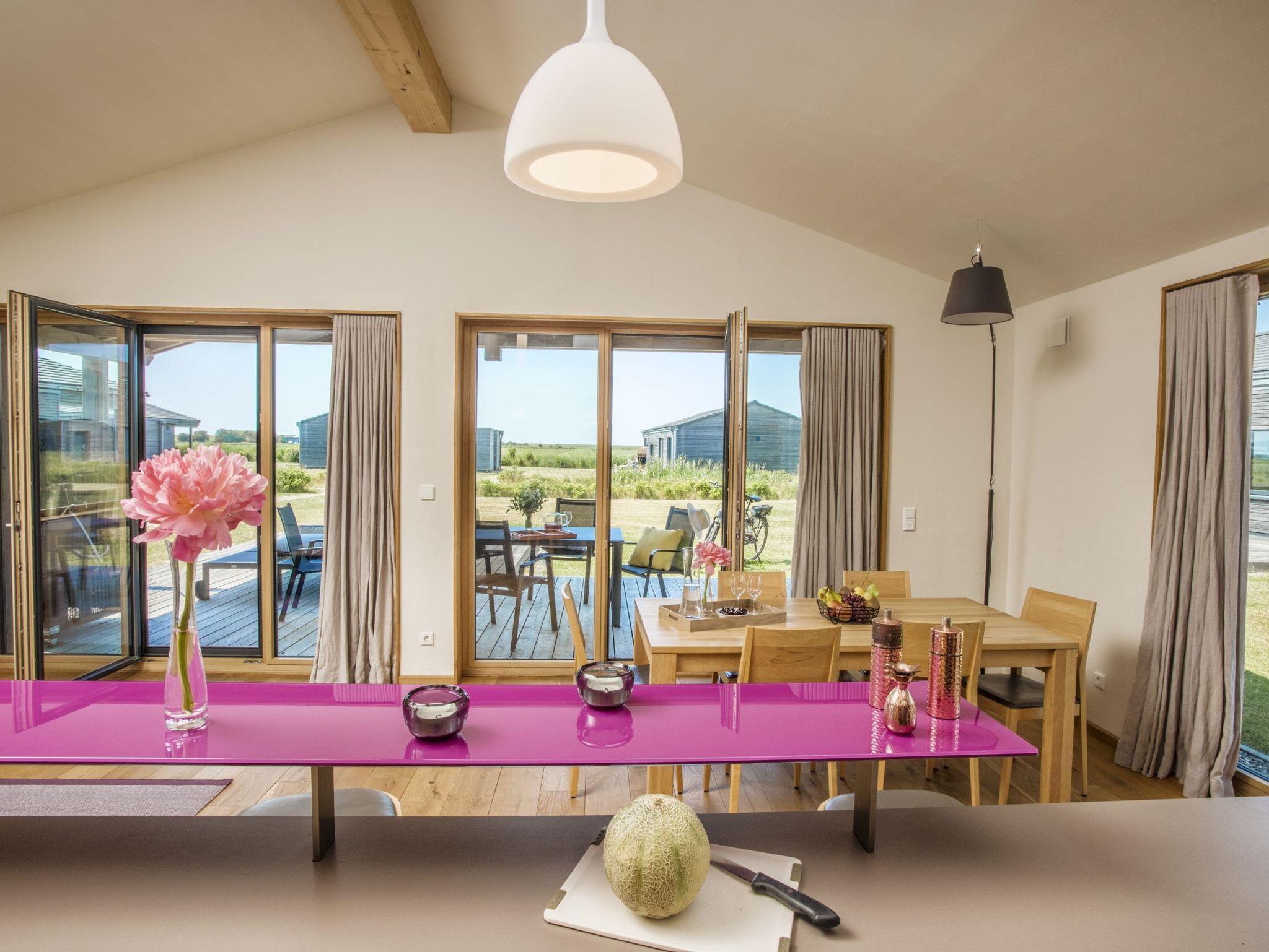 Der großzügige Wohnraum (40 m²) mit Essbereich, offener Küche und Tresen verfügt über einen 40-TV mit SONOS Soundbar. Die Soundanlage kann über Ihr Smartphone mittels SONOS-App gesteuert werden. Die zwei Schlafzimmer verfügen jeweils über ein Doppelbett (160x200) und einen großen Einbauschrank. Bei Bedarf kann ein Zustellbett (80x200, gegen Gebühr) ergänzt werden. Ein Schlafraum ist mit einem 32-TV ausgestattet. Alle Küchengeräte wie Induktionsherd, Spülmaschine und Kühlschrank mit 4-Sterne-Gefrierfach sowie Waschmaschine und Trockner stammen aus dem Hause Miele. Dank eines hochmodernen Glasfaseranschlusses (250 MBit) ist eine leistungsstarke Internetverbindung vorhanden (z.B. für Streaming). Das WLAN im Haus kann auf Wunsch deaktiviert werden.