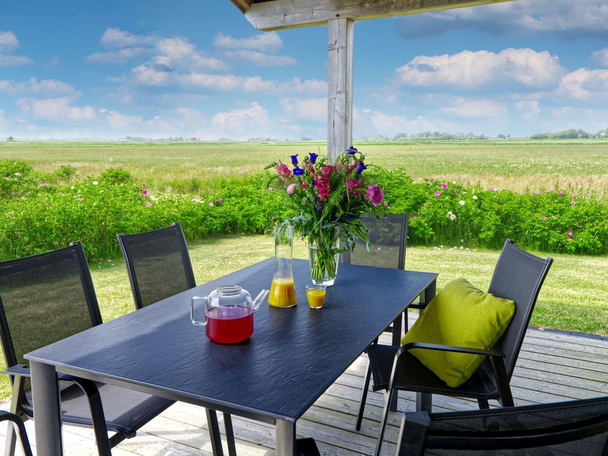 Ihre Mahlzeiten können Sie ganz in Ruhe auf einer der großen Terrassenflächen (teilweise überdacht) einnehmen. Ein Terrassentisch und 6 Stühle sind dafür vorhanden. Zwei Liegen laden auf der Sonnenterrasse zum ausgiebigen Sonnenbaden ein. Der Garten bietet viel Erholungs- und Spielfläche. Auch in den kühleren Monaten ergänzen sich Natur und Haus perfekt. Machen Sie es sich nach ausgiebigen Deichwanderungen in frischer Meeresluft einfach mit einem guten Buch in der Sauna oder auf dem Sofa gemütlich oder geben Sie sich dem hin, was hier am besten funktioniert: dem gepflegten Nichtstun!