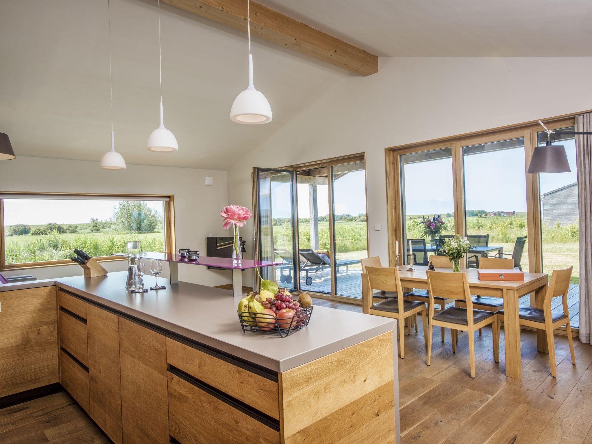 Der großzügige Wohnraum (40 m²) mit Essbereich, offener Küche und Tresen verfügt über einen 40“-TV mit SONOS Soundbar. Die Soundanlage kann über Ihr Smartphone mittels SONOS-App gesteuert werden. Die zwei Schlafzimmer verfügen jeweils über ein Doppelbett (160x200) und einen großen Einbauschrank. Bei Bedarf kann ein Zustellbett (80x200, gegen Gebühr) ergänzt werden. Ein Schlafraum ist mit einem 32“-TV ausgestattet. Alle Küchengeräte wie Induktionsherd, Spülmaschine und Kühlschrank mit 4-Sterne-Gefrierfach sowie Waschmaschine und Trockner stammen aus dem Hause Miele. Dank eines hochmodernen Glasfaseranschlusses (250 MBit) ist eine leistungsstarke Internetverbindung vorhanden (z.B. für Streaming). Das WLAN im Haus kann auf Wunsch deaktiviert werden.
