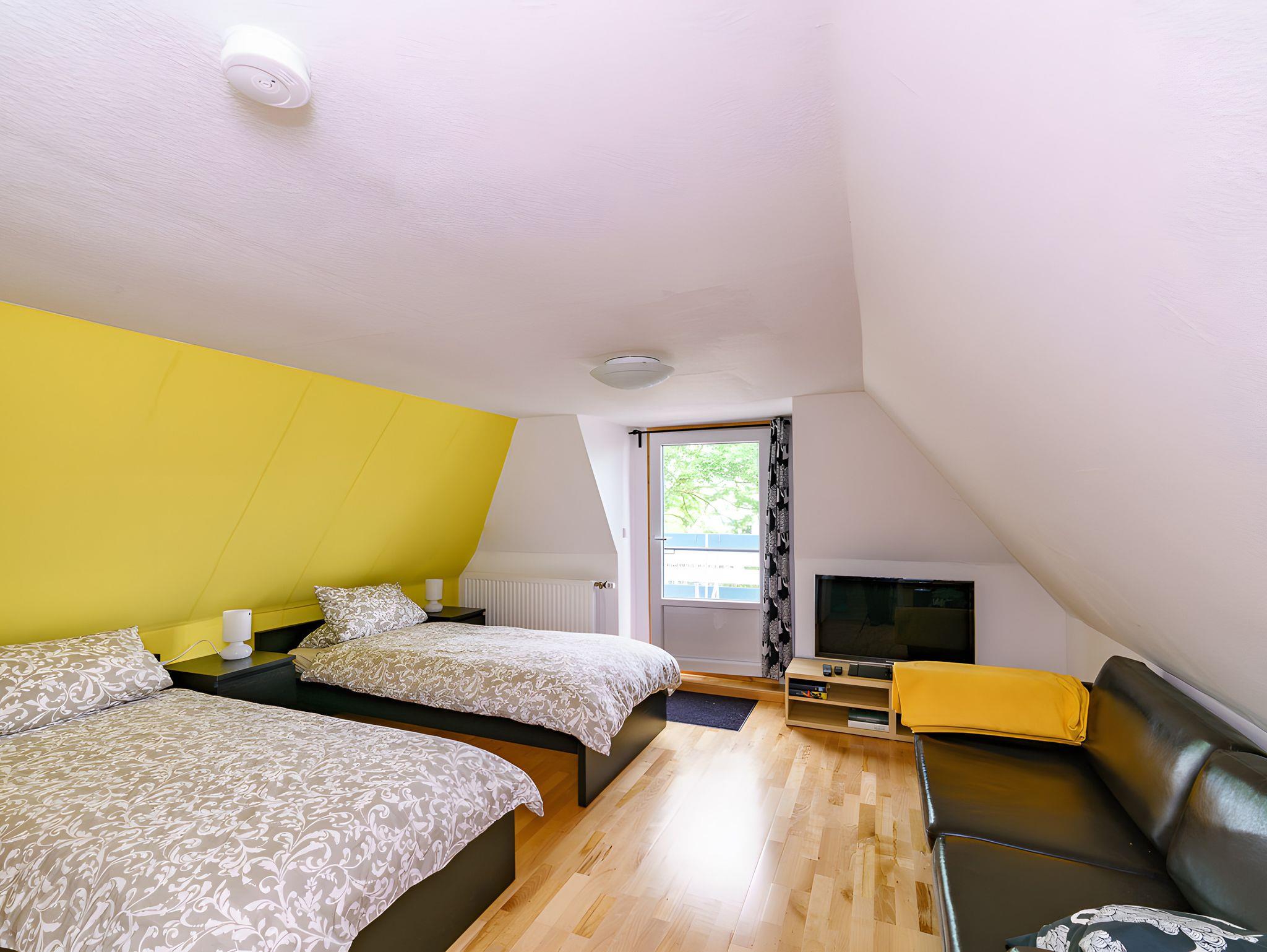 Das Obergeschoss erreichen Sie über eine schmale Treppe. Dort befindet sich eine Galerie mit einem Arbeitsplatz mit LAN-Anschluss und Blick in den Norden der Insel. Im oberen Schlafzimmer gibt es zwei Einzelbetten, ein Sofa mit Tisch und einen Flachbild-TV. Von dort aus gelangen Sie auf den Balkon mit einer weiteren Sitzmöglichkeit.