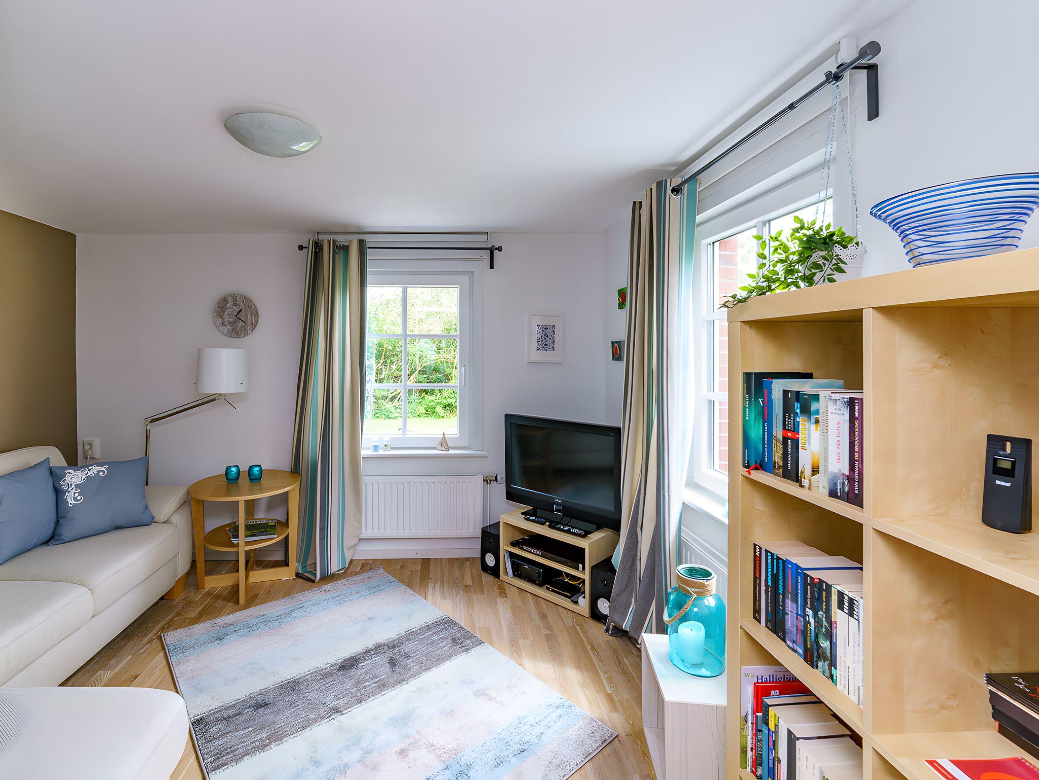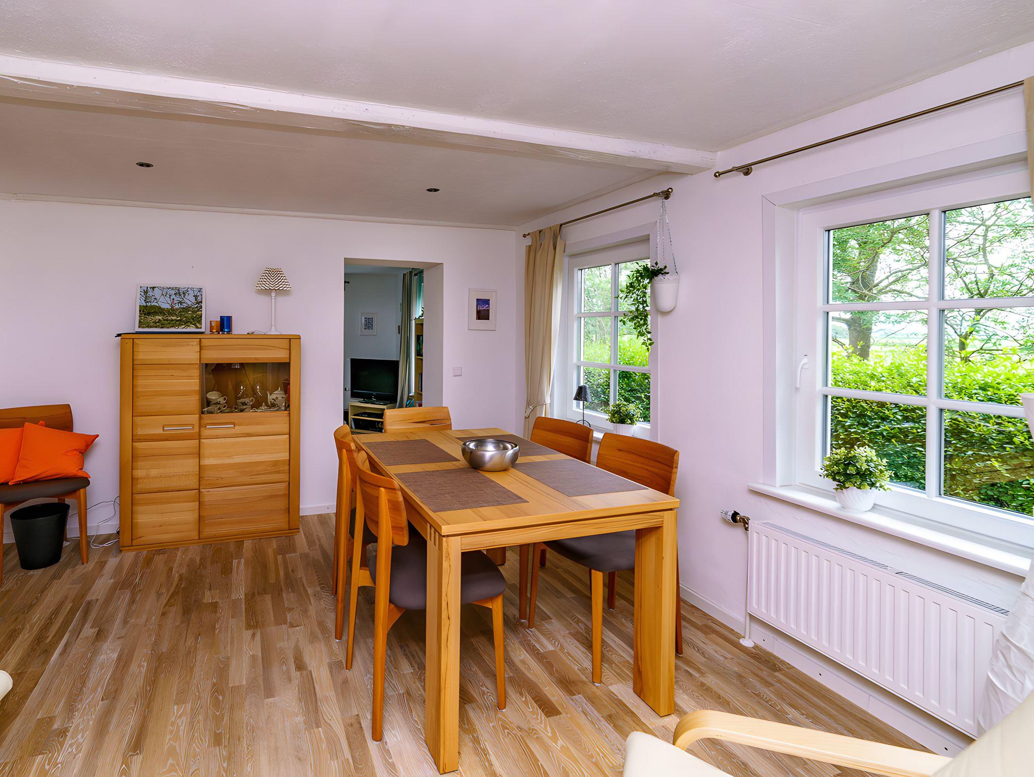 Im Erdgeschoss befinden sich ein Flur mit Garderobe und Schuhschrank sowie ein gemütliches Wohnzimmer mit Sofagarnitur, Flachbild-TV, Musikanlage und DVD-Player. Eine Auswahl an Büchern und DVDs steht zur Verfügung. Es gibt ausreichend Leselampen und Platz für einen Laptop. Im Esszimmer finden Sie einen großen Esstisch für bis zu 6 Personen sowie zwei gemütliche Sessel vor dem Kaminofen.