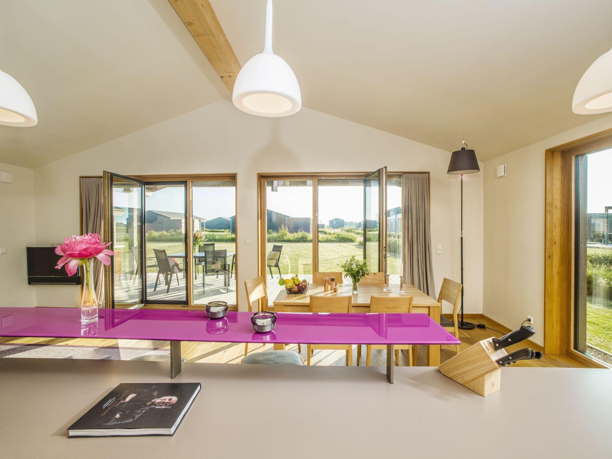 Der großzügige Wohnraum (40 m²) mit Essbereich, offener Küche und Tresen verfügt über einen 40-TV mit SONOS Soundbar. Die Soundanlage kann über Ihr Smartphone mittels SONOS-App gesteuert werden. Die zwei Schlafzimmer verfügen jeweils über ein Doppelbett (160x200) und einen großen Einbauschrank. Bei Bedarf kann ein Zustellbett (80x200, gegen Gebühr) ergänzt werden. Ein Schlafraum ist mit einem 32-TV ausgestattet. Alle Küchengeräte wie Induktionsherd, Spülmaschine und Kühlschrank mit 4-Sterne-Gefrierfach sowie Waschmaschine und Trockner stammen aus dem Hause Miele. Dank eines hochmodernen Glasfaseranschlusses (250 MBit) ist eine leistungsstarke Internetverbindung vorhanden (z.B. für Streaming). Das WLAN im Haus kann auf Wunsch deaktiviert werden.