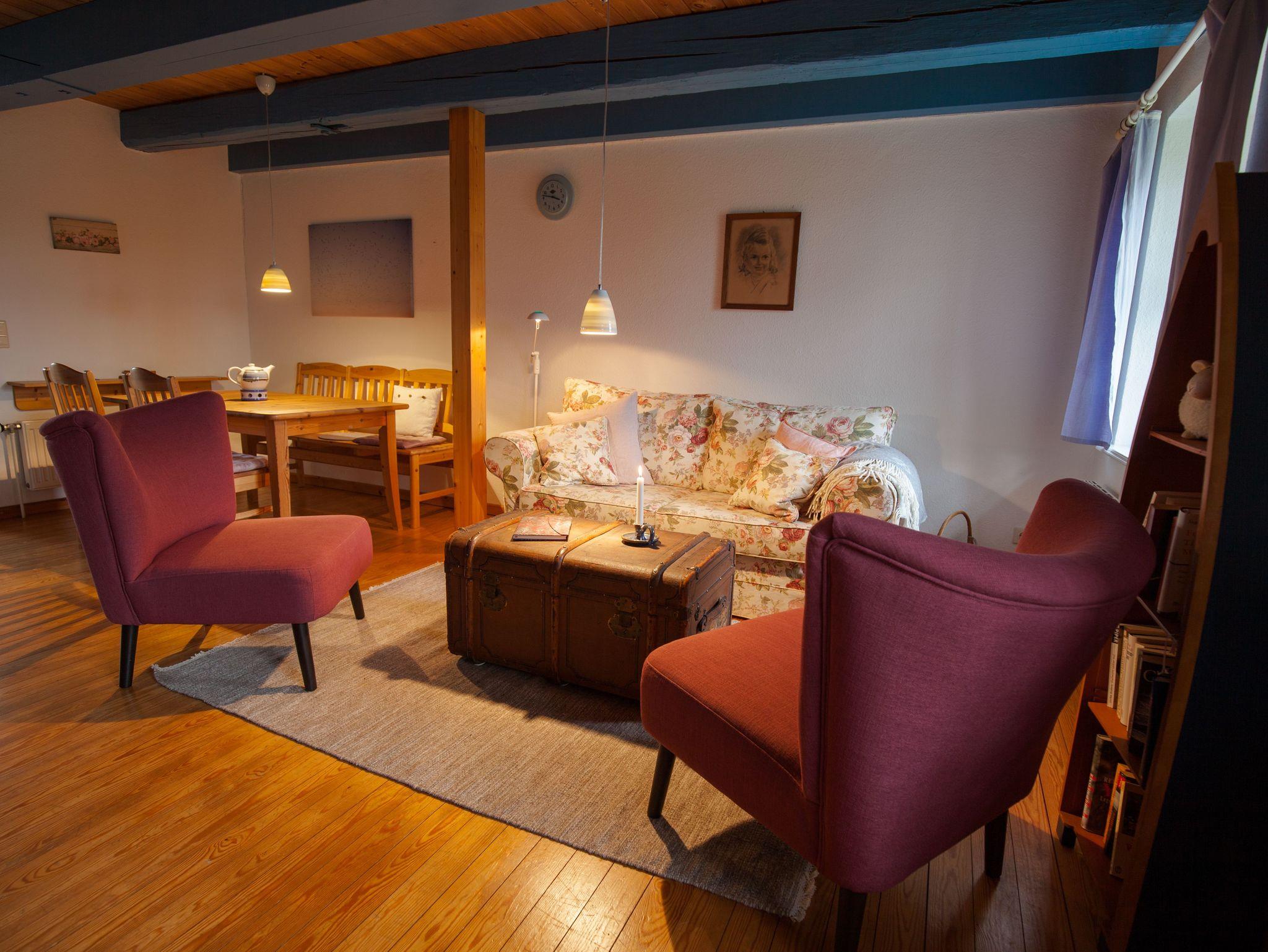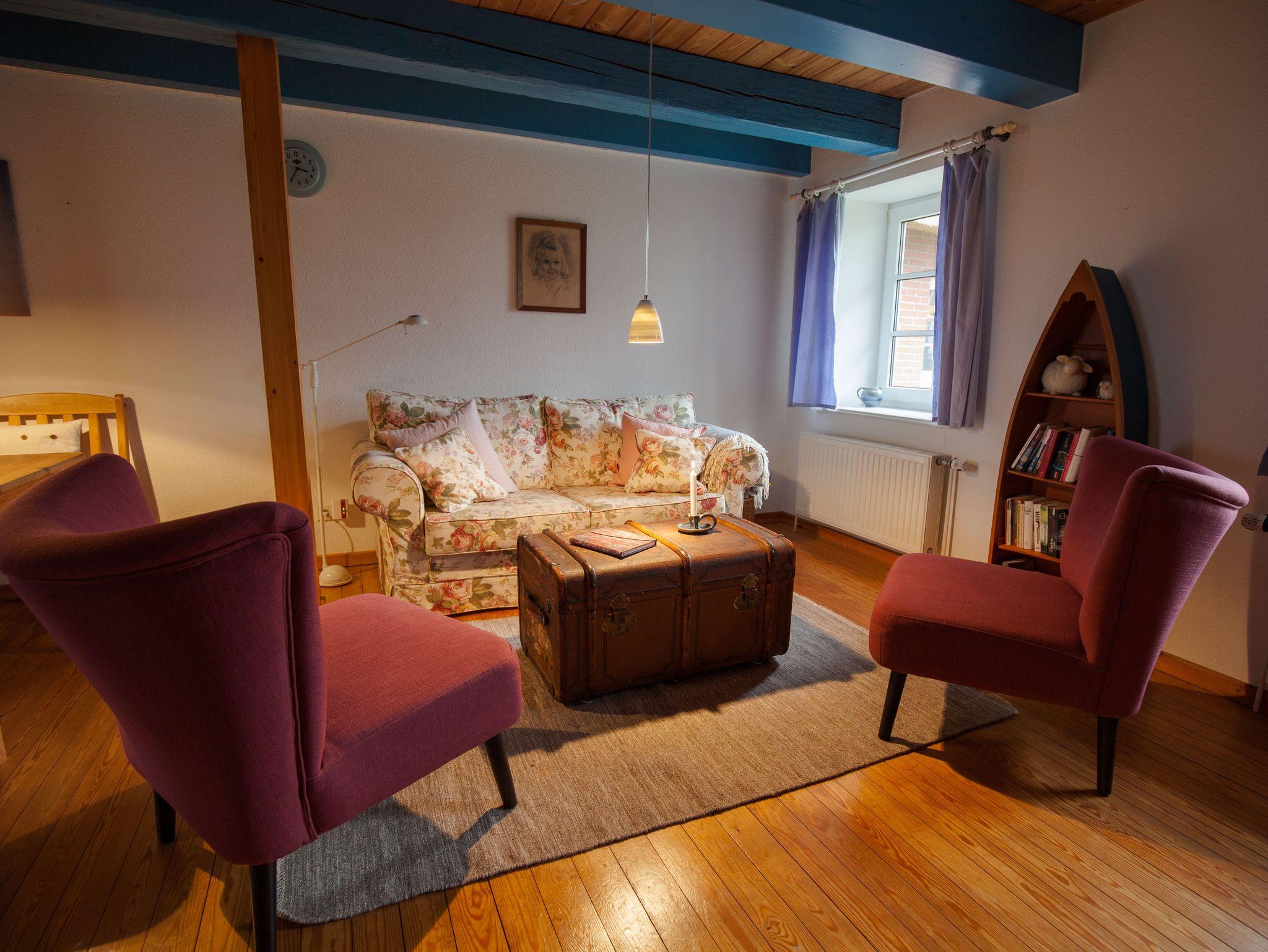 In dem gemütlichen Reetdachhaus finden Sie zwei liebevoll eingerichtete Ferienwohnungen. Jede Wohnung ist ein in sich abgeschlossenes kleines Häuschen mit Platz für vier Personen. Im Erdgeschoss können Sie in der Küche zusammen kochen, am großen Tisch gemeinsam essen oder auf dem Sofa entspannen. Unter den Schrägen des Reetdachs laden zwei Schlafzimmer zum Ausschlafen ein.