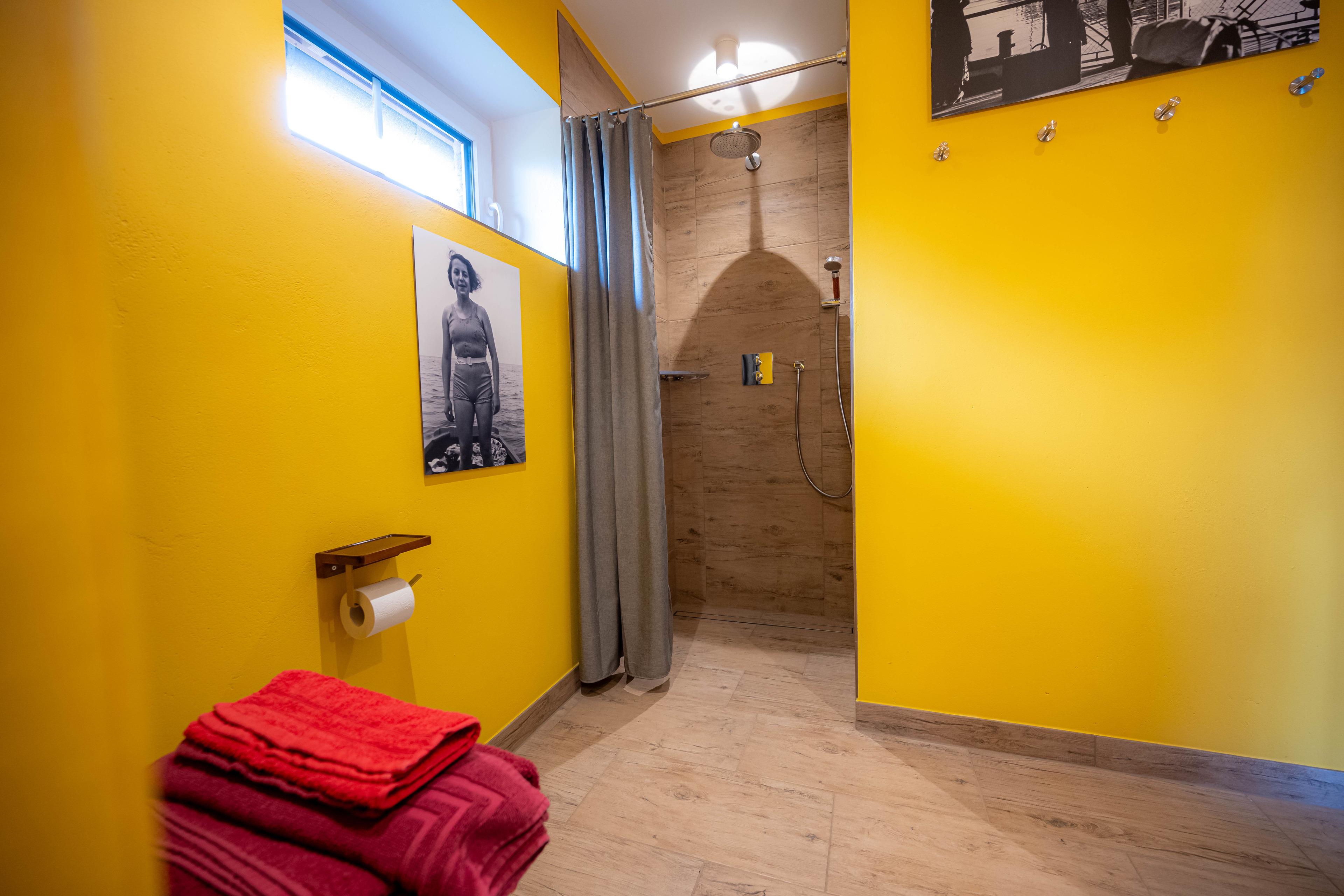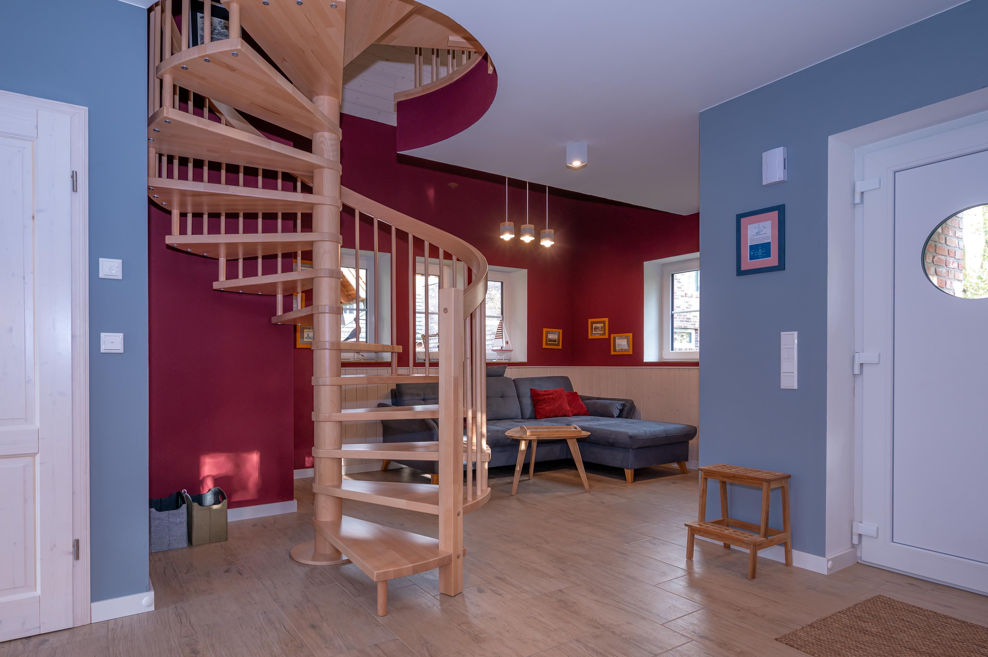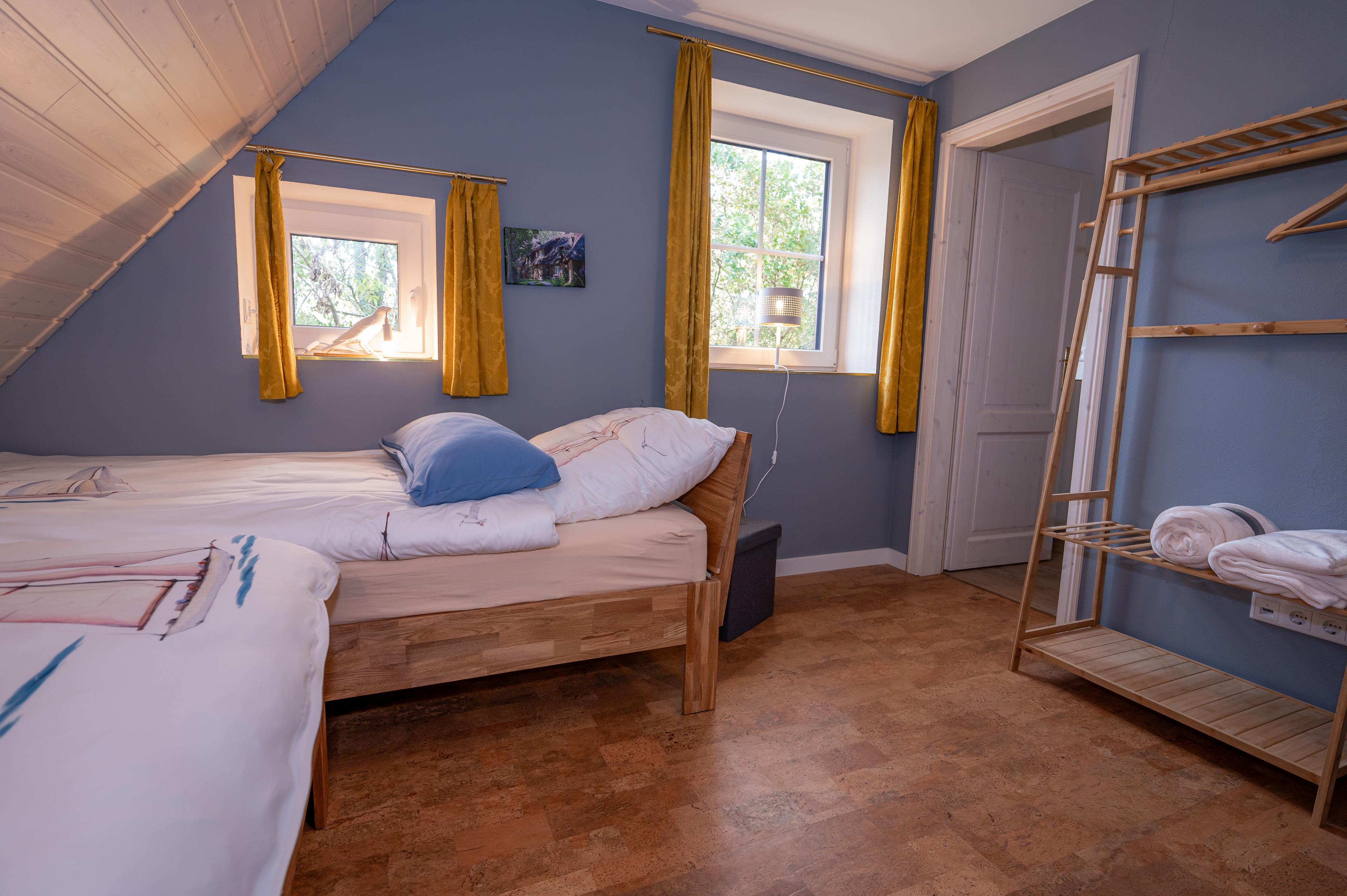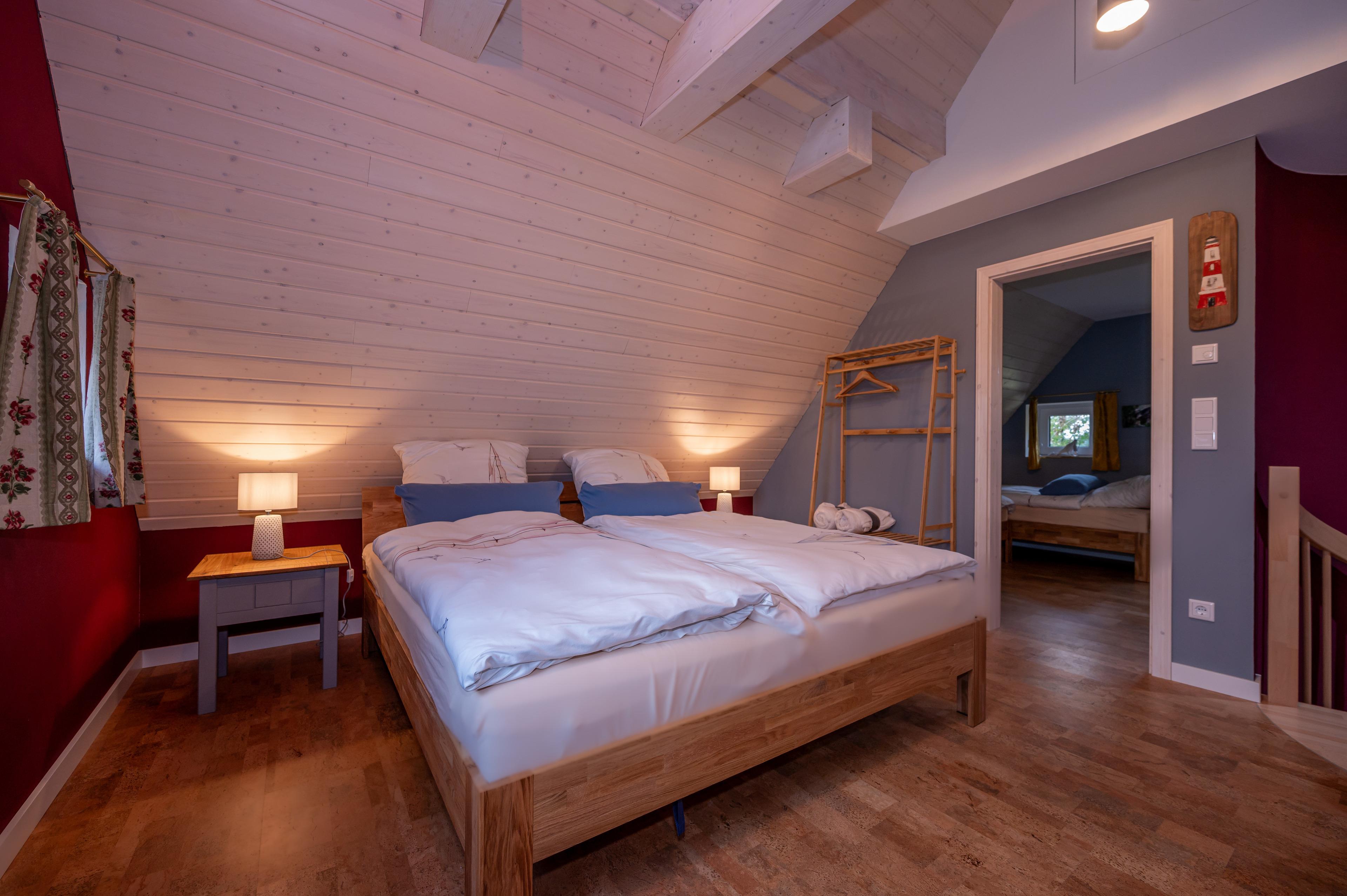 Rückzugsmöglichkeit bietet das große Schlafzimmer, erreichbar über eine Wendeltreppe, die mit dem Erdgeschoss verbunden ist. Dieses Schlafzimmer mit Doppelbett hat eine offene Decke und unterstreicht das Raumerlebnis; alles ist offen gestaltet und bildet mit dem Luftraum zum Erdgeschoss eine Einheit. Lediglich das zweite Schlafzimmer mit den zwei Einzelbetten ist separiert.