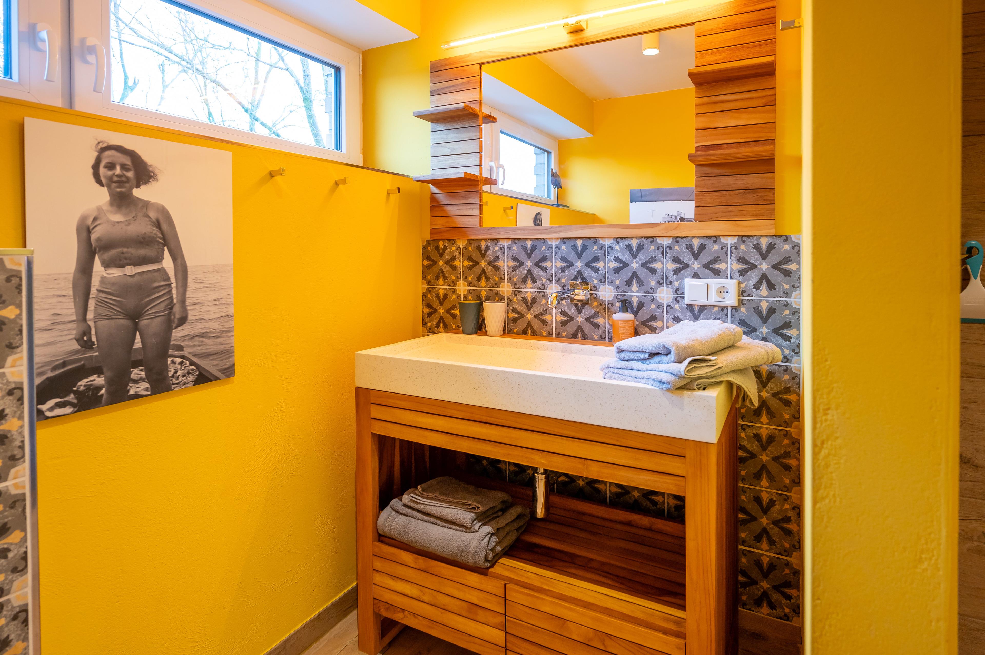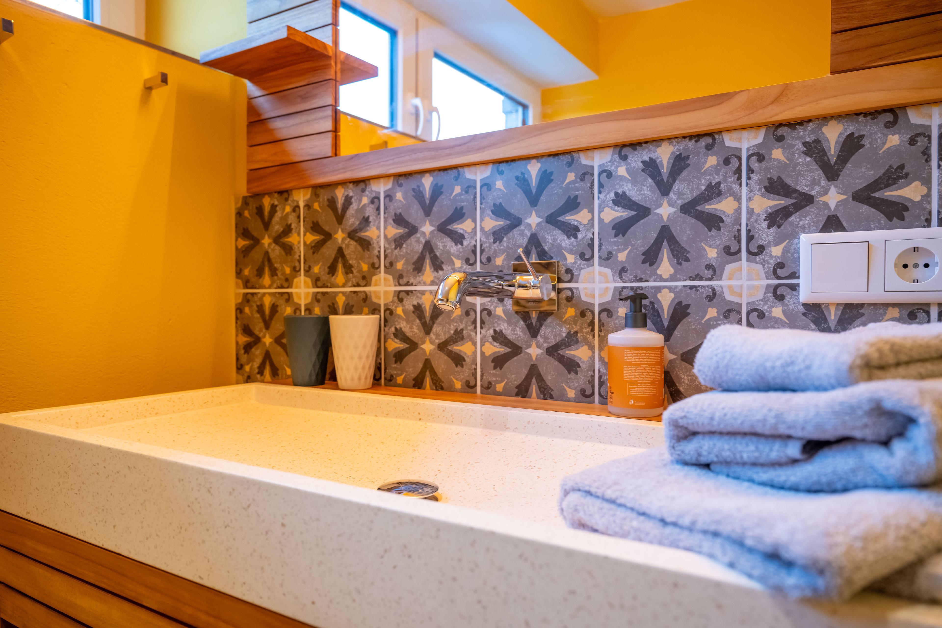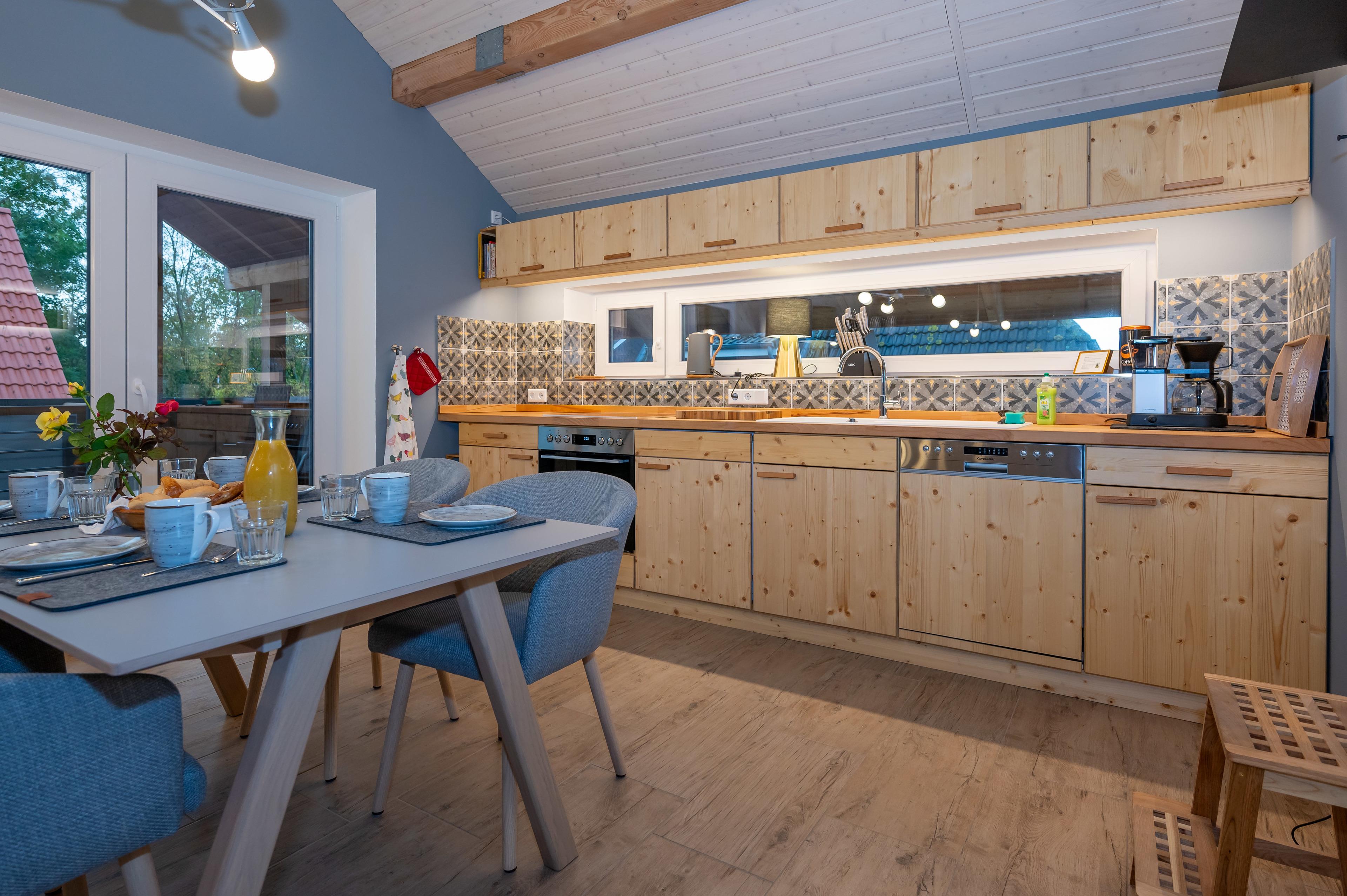 Für das Haus wurden nur hochwertige Materialien wie Lerchenholz verwendet. Die Möbel sind alle massiv (kein Pressspan), auch die Küche ist eine massive Vollholzküche. Im Badezimmer sind hochwertige Armaturen verbaut.