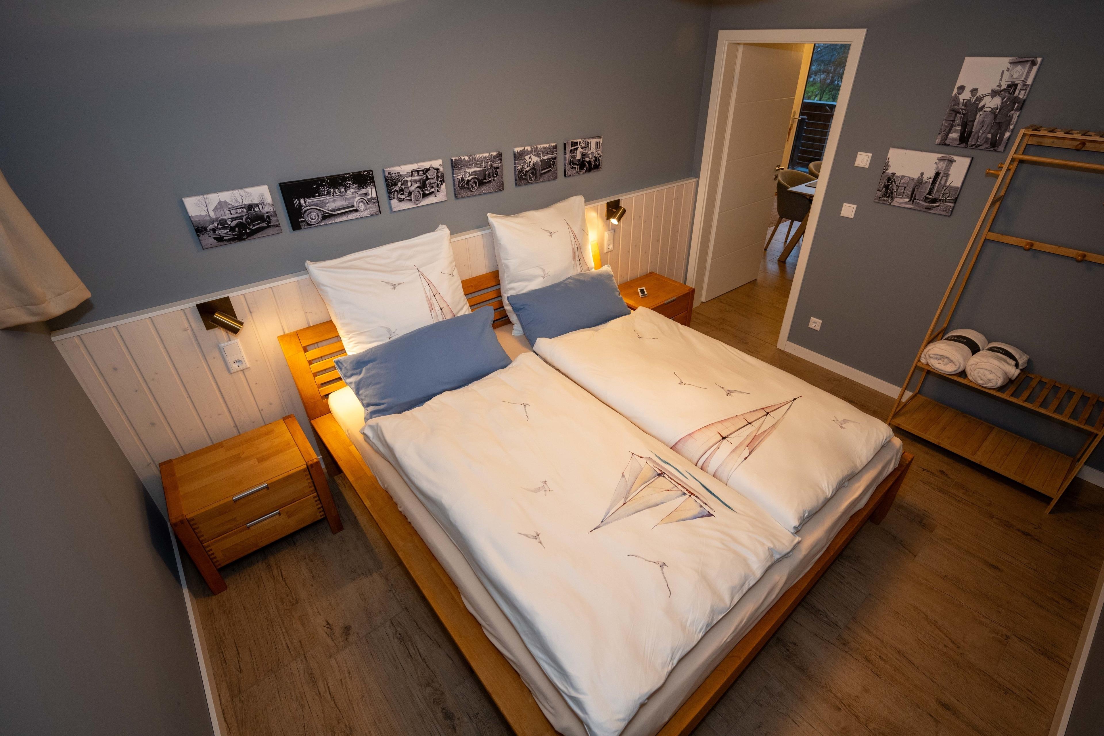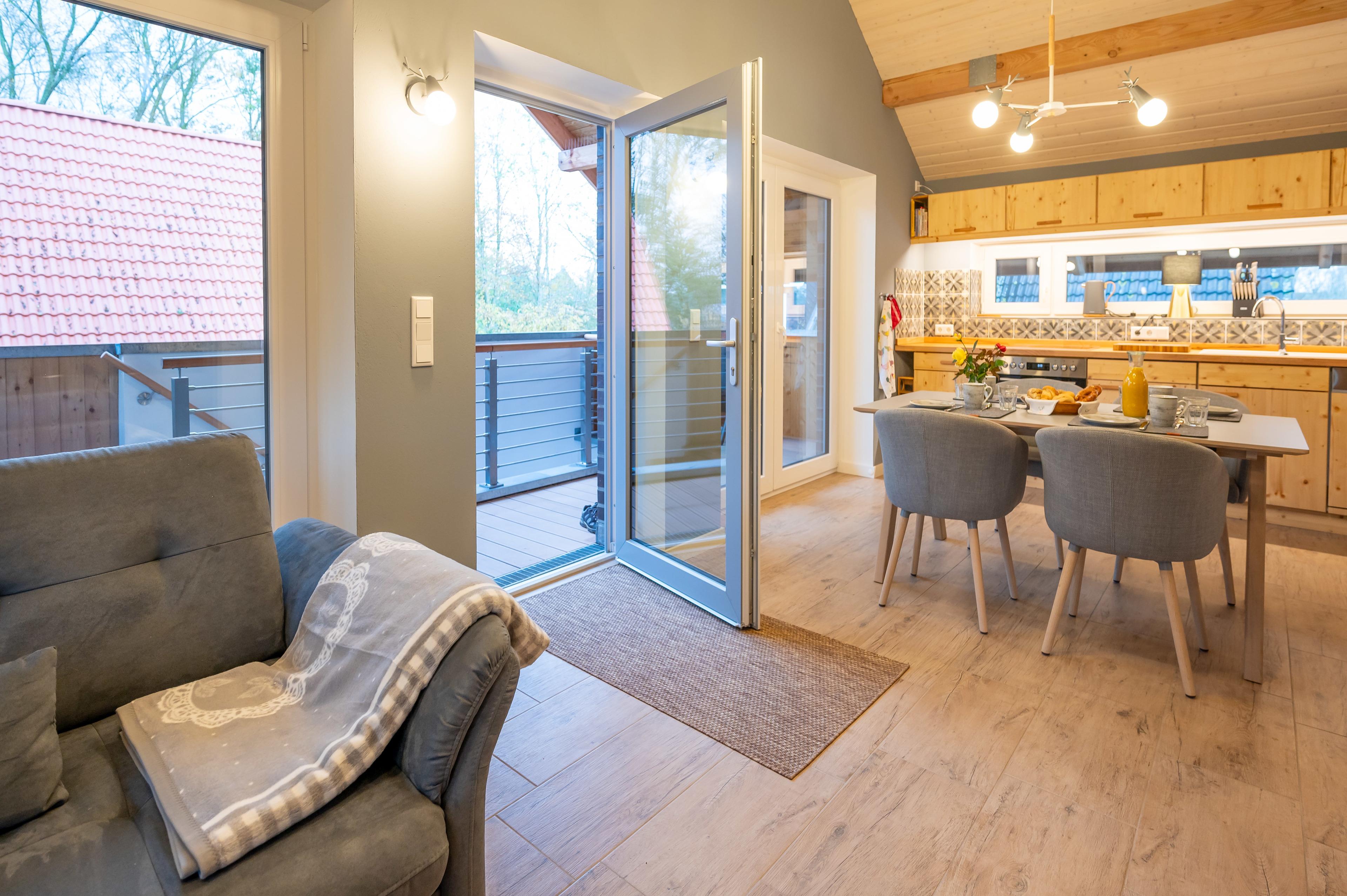 Das Penthouse Captains Bridge wird über eine Außentreppe zum überdachten Balkon erschlossen. Der Penthouse-Balkon ist überdacht und kann bei jedem Wetter genutzt werden. Mit seinem lichten Wohnzimmer mit Essküche von über 35 qm bietet das Penthouse viel Platz zum gemütlichen Zusammensein: Der Raum im ersten Obergeschoss erhält mit der Morgen-, Mittags- und Abendsonne Licht zum sich Wohlfühlen. Der Wohnbereich zeichnet sich durch eine offene Decke über zwei Geschosse aus. Eine Treppe führt zur großen Galerie. Dort oben eröffnet ein rundes Fenster unter dem Giebel den Blick ins Grüne. Dieses Raumerlebnis bestärkt das behagliche Gefühl, dass man an diesem Platz gut aufgehoben ist. Es gibt außerdem noch zwei helle Schlafzimmer mit gemütlichem Doppelbett sowie einem separaten Bad mit begehbarer Regendusche.