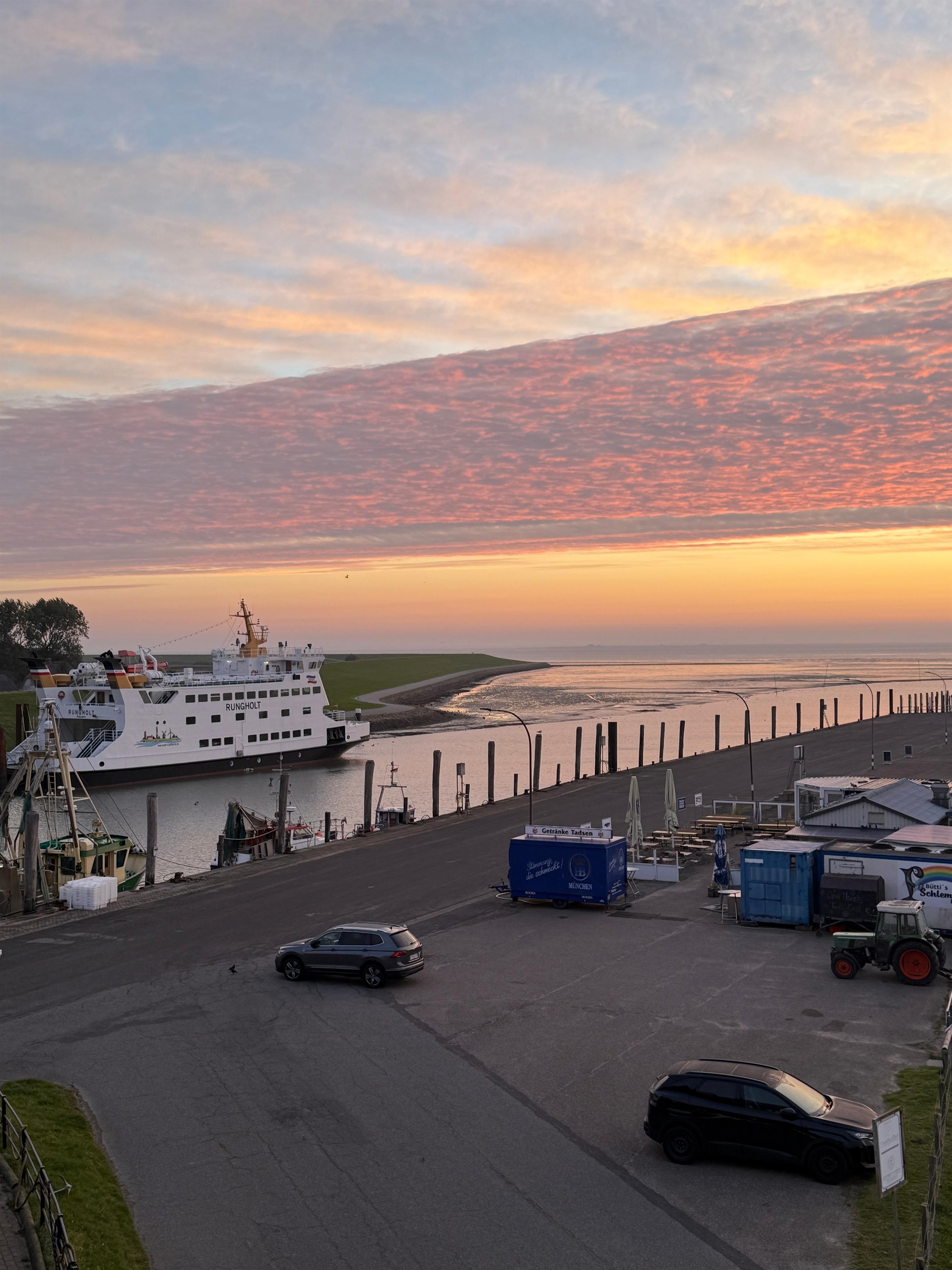 Erlebe deine Auszeit auf Pellworm mit direktem Blick auf das Meer und den Hafen.