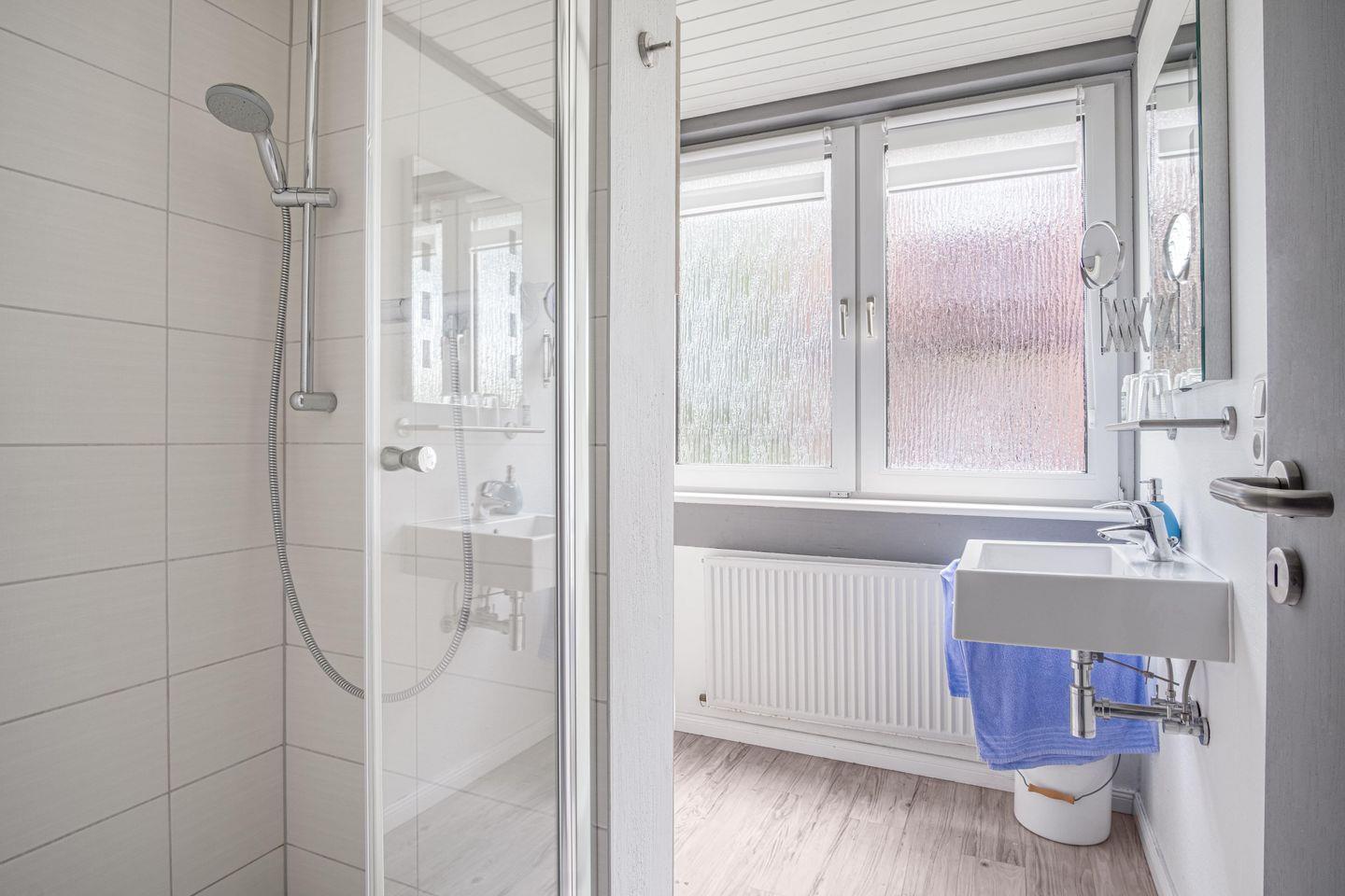 Das moderne Badezimmer ist mit einer Dusche, einem Haartrockner und Pflegeprodukten wie Seife und Shampoo ausgestattet. Ein Ganzkörperspiegel sowie frische Hand- und Badetücher sind selbstverständlich vorhanden und sorgen für zusätzlichen Komfort.