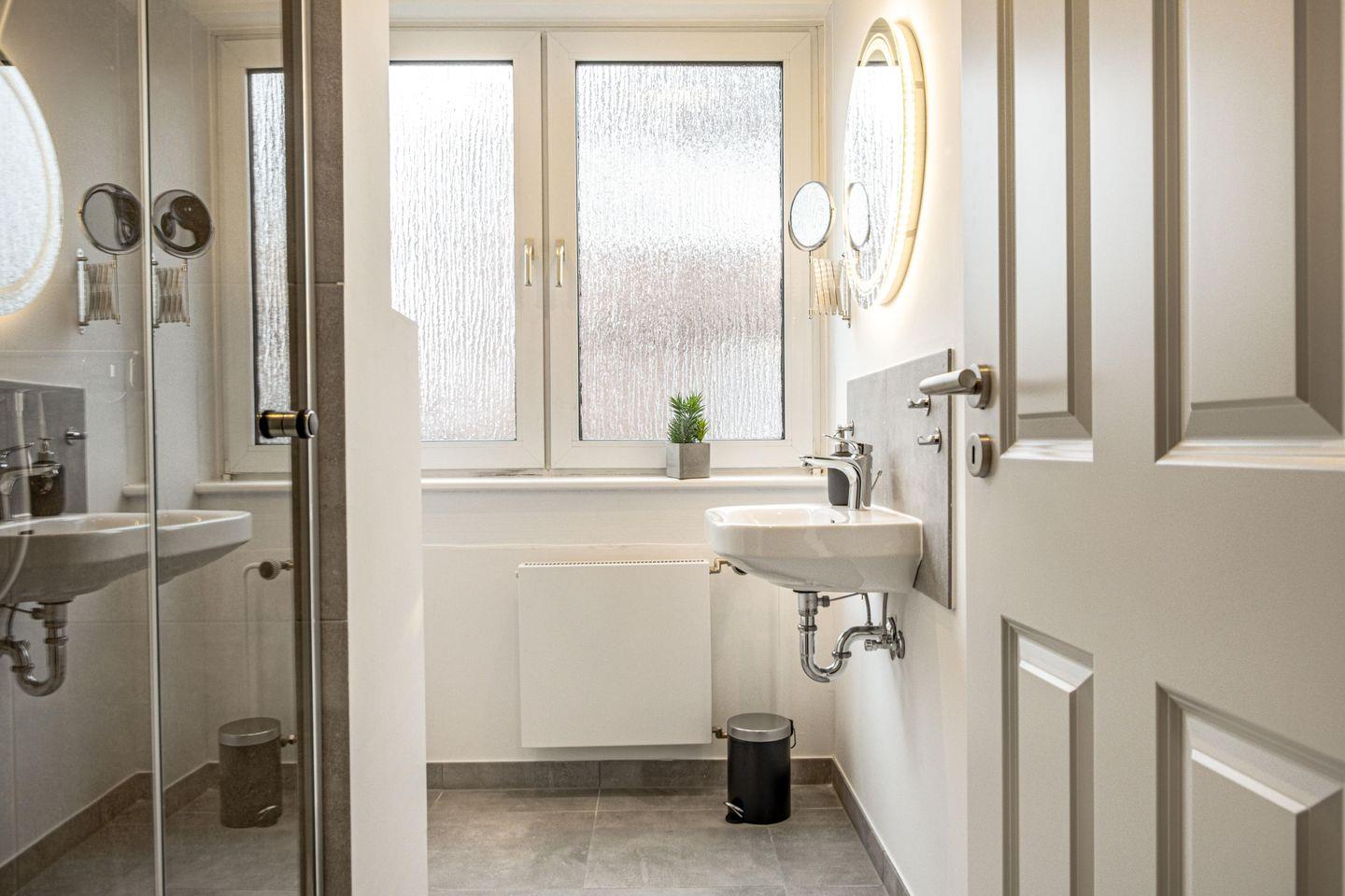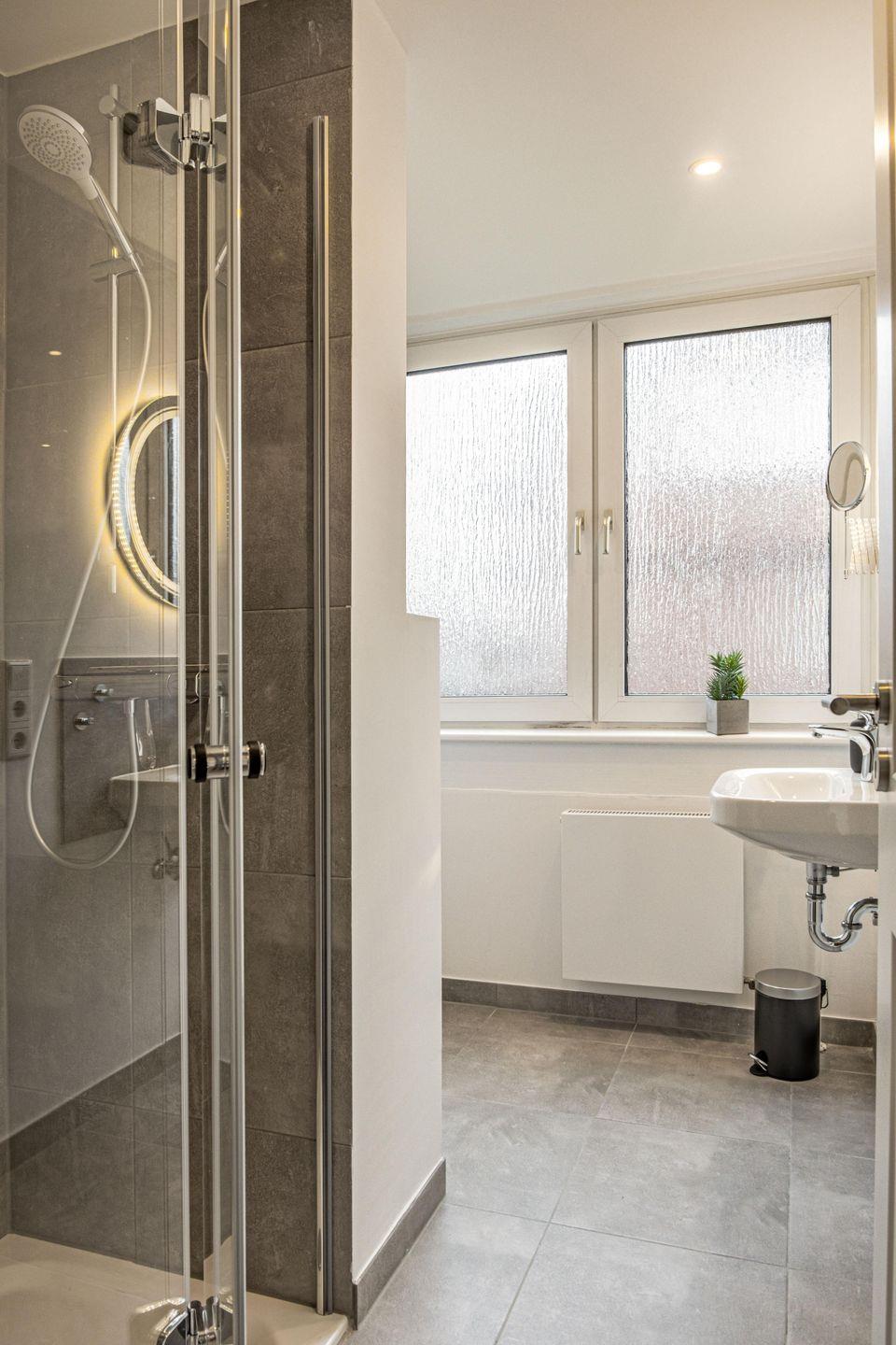 Das moderne Badezimmer ist mit einer Dusche, einem Haartrockner und Pflegeprodukten wie Seife und Shampoo ausgestattet. Ein Ganzkörperspiegel sowie frische Hand- und Badetücher sind selbstverständlich vorhanden und sorgen für zusätzlichen Komfort.