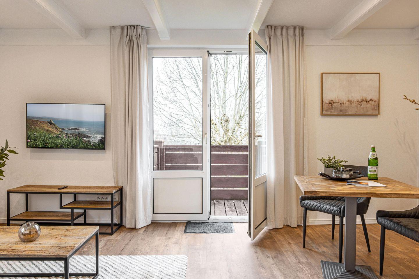 Der Wohnbereich lädt mit einem gemütlichen Sofa und einem Fernseher mit Satellitenanschluss zum Verweilen ein. Ein eigener Balkon mit Gartenmöbeln ermöglicht entspannte Stunden an der frischen Luft.