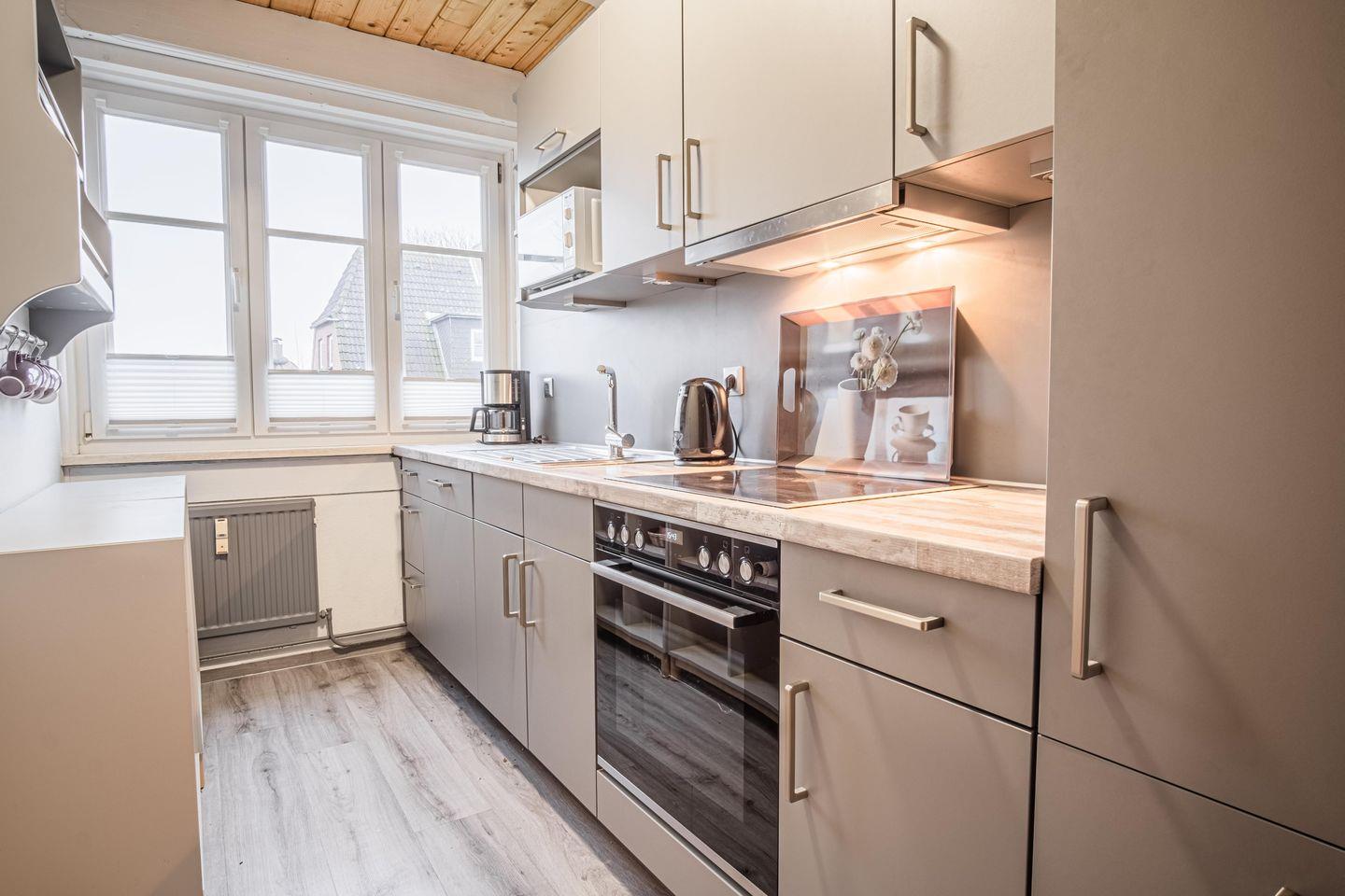 Die separate Küche ist modern ausgestattet und bietet alles, was Sie für die Zubereitung Ihrer Lieblingsgerichte benötigen: ein 4-Platten-Cerankochfeld, Backofen, Mikrowelle, Kühlschrank, Geschirrspüler sowie Kaffeemaschine, Toaster und Wasserkocher – hier bleibt kein Wunsch offen. Im Badezimmer finden Sie eine Dusche, WC und einen Fön vor – alles, was Sie für einen entspannten Start in den Tag brauchen.