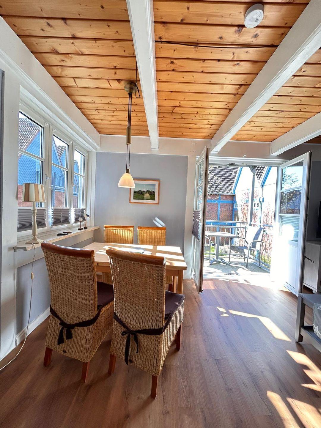 Die großzügige Ferienwohnung "Deichbrise" befindet sich im Obergeschoss des Haus Möwe auf Pellworm und bietet auf ca. 58 m² ausreichend Platz für bis zu vier Personen. Ideal für Familien, Paare oder kleine Gruppen. Das separate Schlafzimmer ist mit einem Doppelbett ausgestattet, ein Kinderbett kann bei Bedarf zusätzlich bereitgestellt werden. Im Wohnraum befinden sich eine Schlafcouch, ein Esstisch und ein SAT-TV. WLAN ist vorhanden.