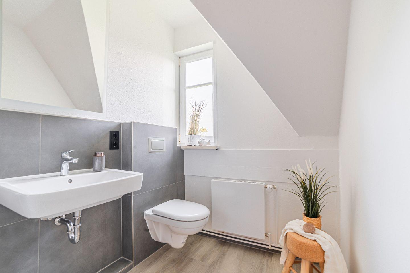 Das moderne Badezimmer ist mit einer bodengleichen Dusche, WC, Waschbecken, Spiegel, Kosmetikspiegel sowie einem Ganzkörperspiegel ausgestattet. Handtücher, Badetücher sowie Pflegeutensilien wie Seife und Shampoo werden als Erstausstattung bereitgestellt. Für Ihren Komfort stehen ein Haartrockner sowie ein Staubsauger zur Verfügung. Die gemeinsame Waschmaschinennutzung im Haus ermöglicht es Ihnen, auch längere Aufenthalte angenehm zu gestalten.