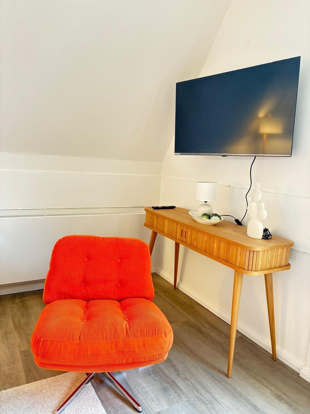 Der Wohnbereich der Ferienwohnung ist mit einem gemütlichen Sofa, TV (Satellitenanschluss), Rauch- und Feuermeldern sowie Zentralheizung ausgestattet. WLAN und Internetzugang sind selbstverständlich ebenso vorhanden wie ein kostenloser Parkplatz direkt am Haus. Für Gäste mit eBikes steht eine Ladestation zur Verfügung. Ein Brötchenservice versüßt Ihnen den Morgen auf Wunsch mit frischen Backwaren.