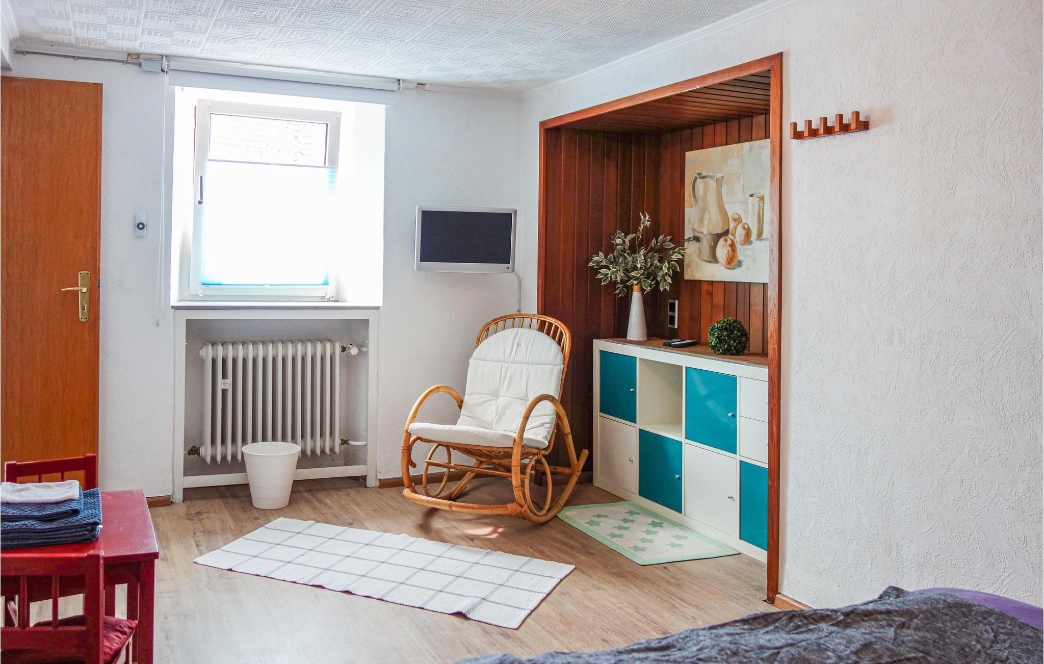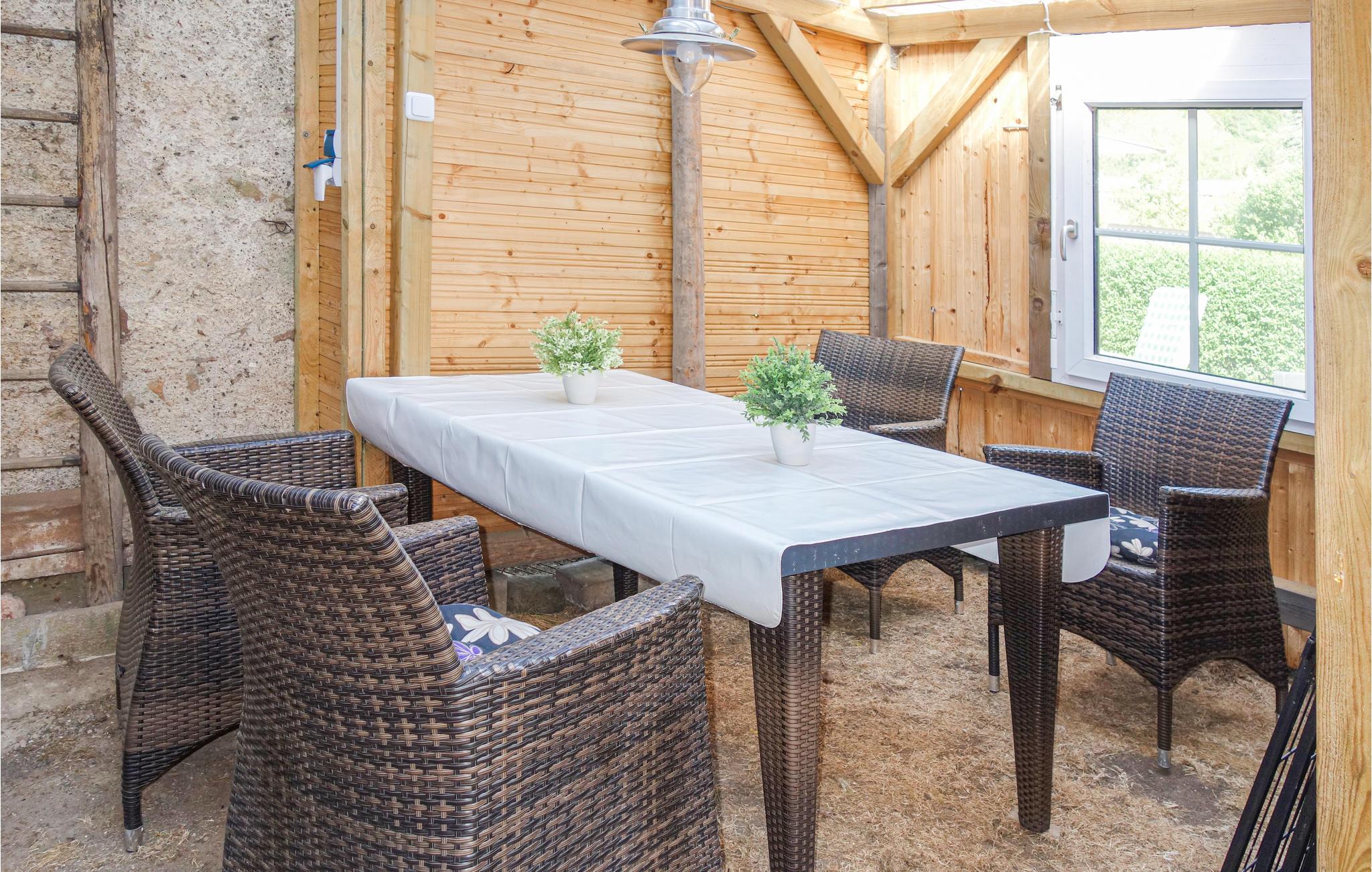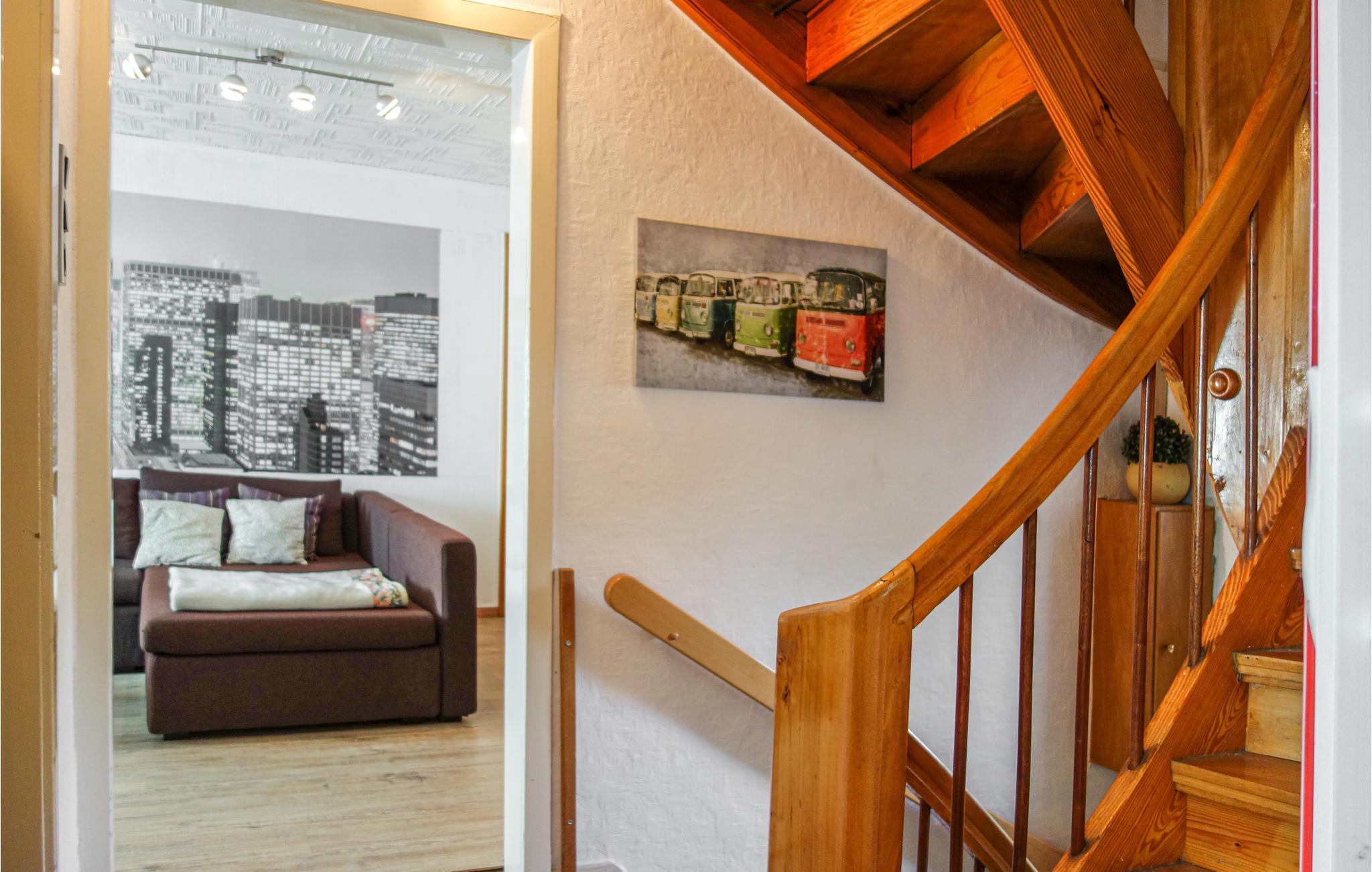 Nyd en ubesværet ferie i Eifel med familien eller venner. Denne dejlige ferielejlighed ligger kun et stenkast fra Kasselburg, ikke langt fra den populære by Gerolstein. Den restaurerede feriebolig rummer et soveværelse og et børneværelse i stueetagen. I indgangsområdet står en pejs. På 1. sal er de restende soveværelser, badeværelset, stuen og det rummelige køkken, hvor der bl.a. er en Senseo kaffemaskine (medbring selv jeres yndlingskaffepuder). Ved siden af er et aflåseligt rum til cykler samt vaskemaskine og tørretumbler.
