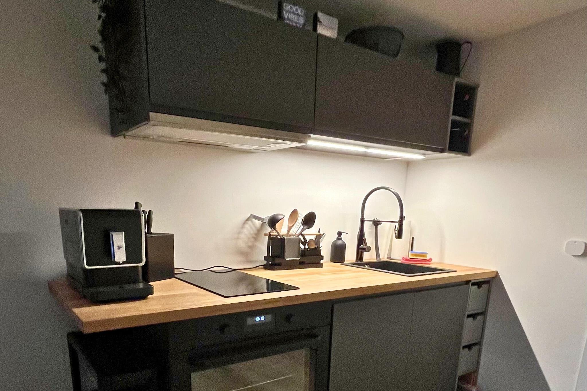 Stueetage: (åbent køkken(elkedel, brødrister, komfur(Komfur med to kogeplader, glaskeramisk), kaffemaskine, espressomaskine, ovn, opvaskemaskine , køleskab), Stue/soveværelse(dobbeltseng(boxmadras, 180 x 200 cm), Fjernsyn, spisebord, sofahjørne), badeværelse(bruser, håndvask, toilet), sauna(sauna(privat)), tagterrasse, havemøbler, grill, loungemøbler) parkering, Ladestation til el-biler