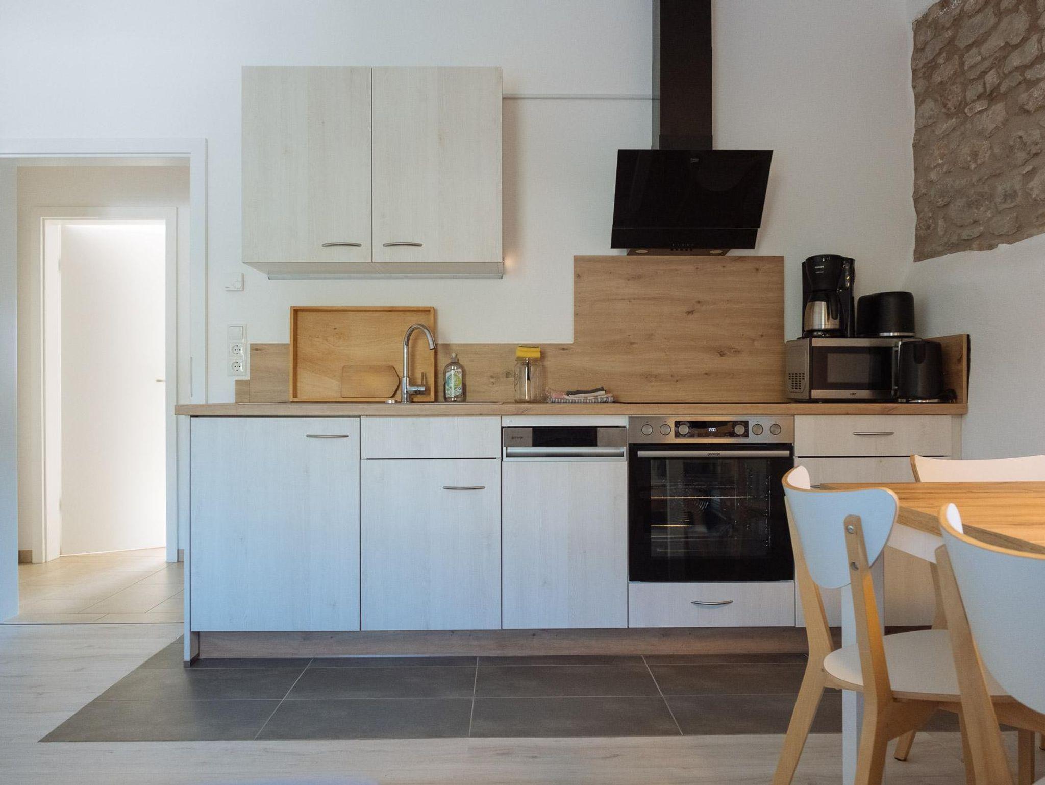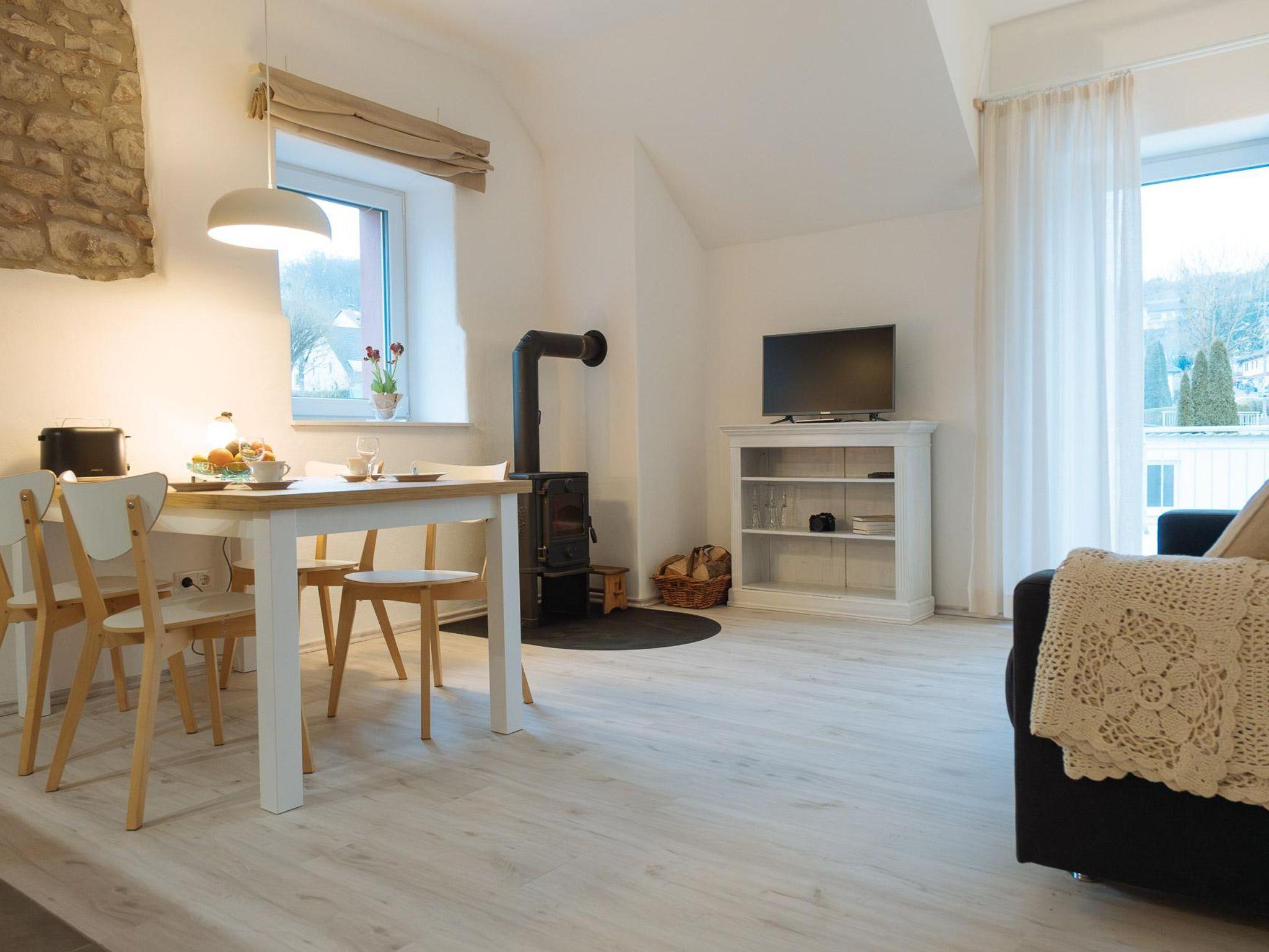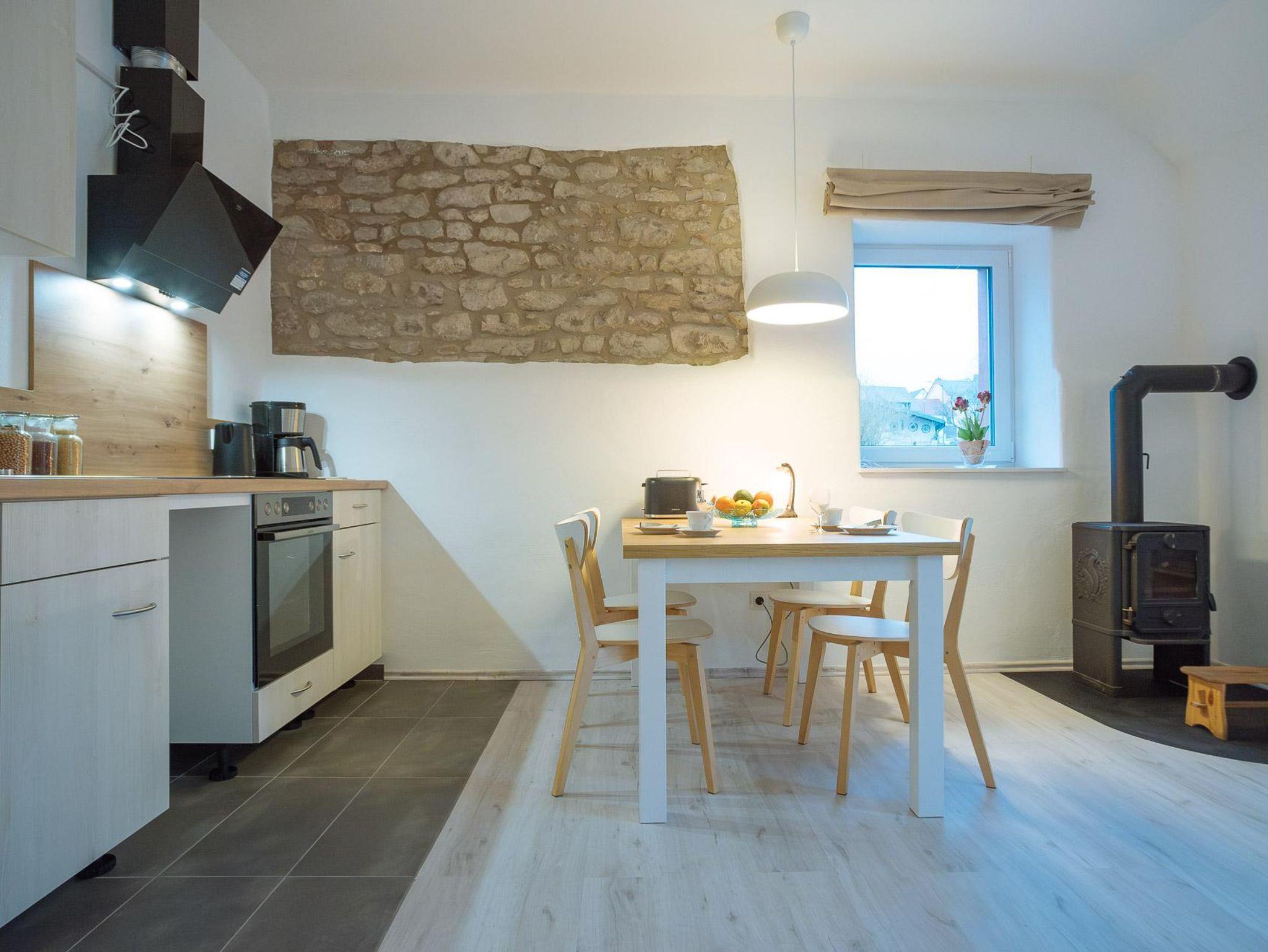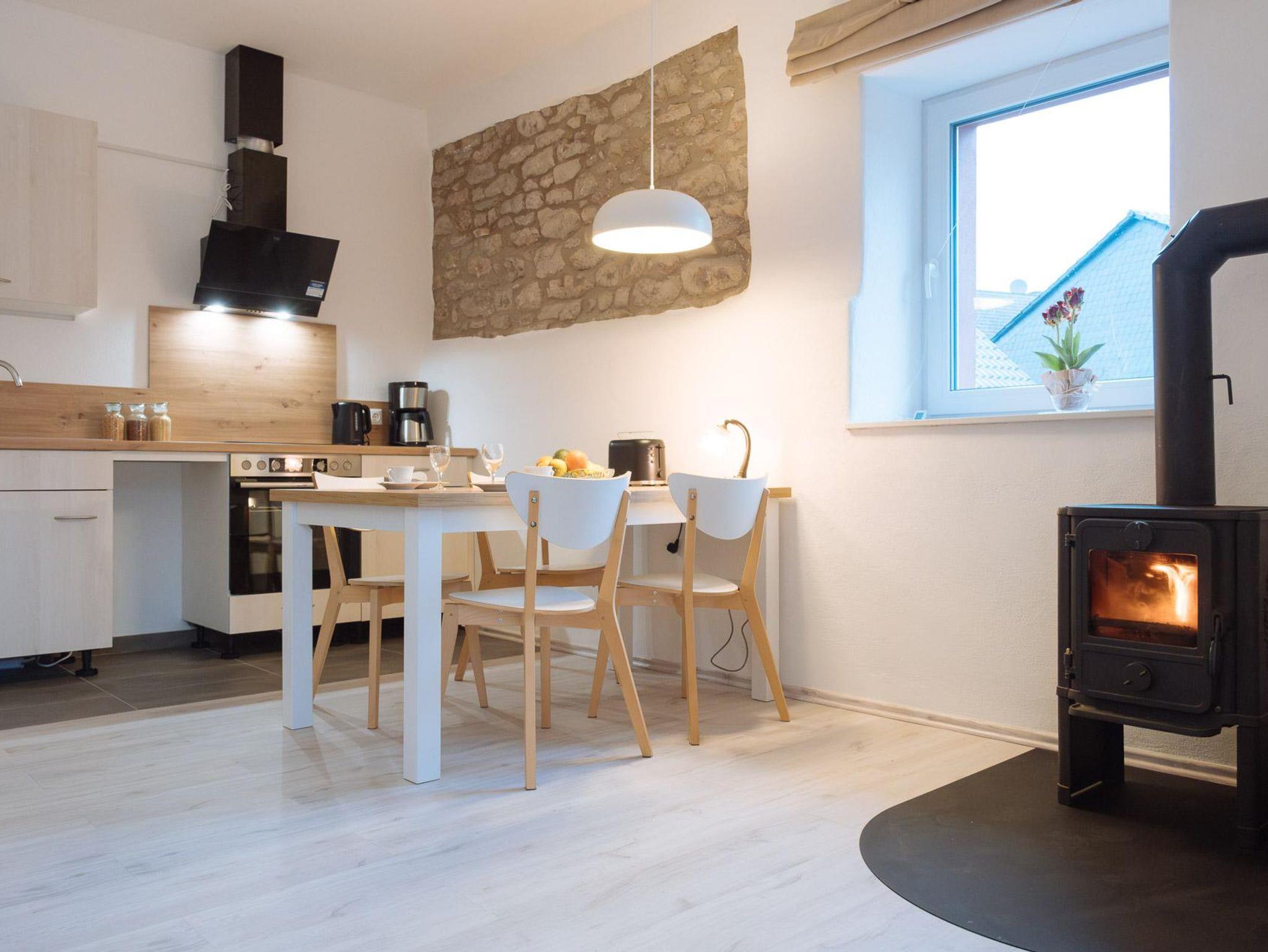 Diese liebevoll eingerichtete, helle Ferienwohnung im ersten Obergeschoss einer umgebauten Bruchsteinscheune (Baujahr 1807) verbindet rustikalen Charme mit moderner Einrichtung und Komfort. Die 40-Quadratmeter-Wohnfläche mit charmantem Schlafzimmer (Bett 180 cm breit), einem hellen Duschbad mit Tageslicht und einer freundlichen Wohnküche lädt zum Wohlfühlen ein. Die moderne Einbauküche hat einen Backofen, eine Spülmaschine und alles, was man zum Kochen braucht. Auf dem gemütlichen Sofa können Sie es sich vor dem Kaminofen bequem machen. Oder vor dem Fernseher, der einen Satelittenanschluss hat und auch ans Internet angeschlossen ist. Von der Wohnküche gehen Sie direkt auf Ihre 20 Quadratmeter große, eigene Terrasse (Sonnenseite), die mit einem großen Sonneschirm und Gartenmöbel ausgestattet ist. Von der Terrasse kommen Sie über eine Treppe direkt in auf eine große Wiese, wo ein Holzhaus für Kinder steht und sich ein großer, überdachter Grill-/Feuerplatz befindet. Kinder dürfen auch im Garten vor der Terrasse zelten.