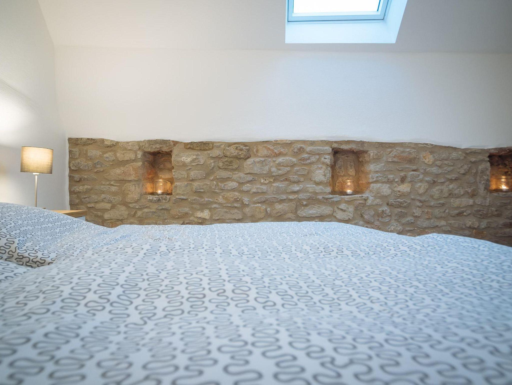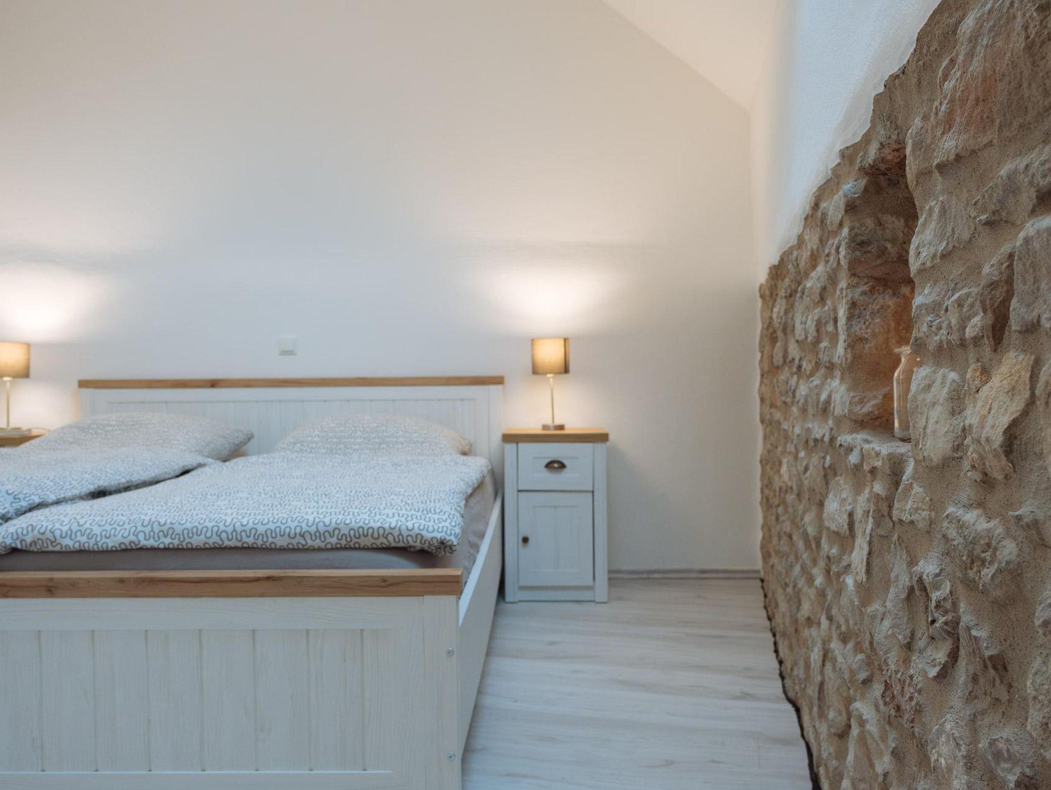 Diese liebevoll eingerichtete Ferienwohnung im ersten Obergeschoss einer umgebauten Bruchsteinscheune (Baujahr 1807) verbindet rustikalen Charme mit moderner Einrichtung und Komfort. Die 40-Quadratmeter-Wohnung hat ein traumhaft schönes, großzügiges Schlafzimmer (Bett 180 cm breit) mit einer Bruchsteinwand und einem Fenster mit Aussicht auf den Himmel.Daneben befindet sich ein helles Duschbad mit Tageslicht. In der Wohnküche befindet sich eine moderne Einbauküche mit Backofen, Spülmaschine und allem, was man zum Kochen braucht. Auf dem gemütlichen Sofa können Sie es sich mit einem Buch bequem machen. Oder vor dem Fernseher, der einen Satelittenanschluss hat und auch ans Internet angeschlossen ist. Von der Wohnküche gehen Sie direkt auf Ihre 20 Quadratmeter große, eigene Terrasse (Sonnenseite), die mit einem großen Sonneschirm und Gartenmöbel ausgestattet ist. Von der Terrasse kommen Sie über eine Treppe direkt in auf eine große Wiese, wo ein Holzhaus für Kinder steht und sich ein großer, überdachter Grill-/Feuerplatz befindet. Kinder dürfen auch im Garten vor der Terrasse zelten.