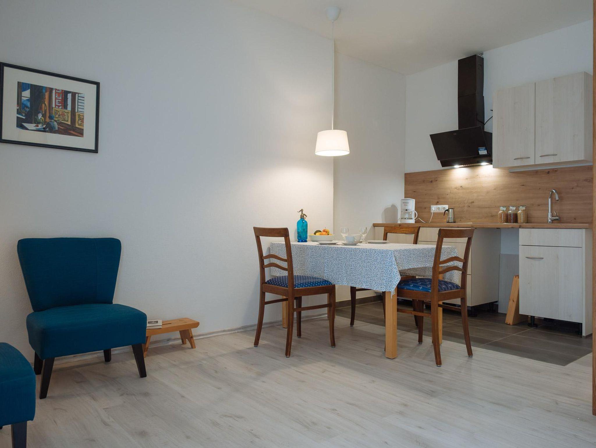 Sind Sie mehr als zwei Leute, können sie - soweit frei - auch eine oder zwei der anderen beiden Ferienwohnungen Wohnungen (Nr. 1 und 3) direkt nebenan dazumieten. Den 38 qm großen Gesellschaftraum, ebenfalls mit moderner Einbauküche und Kaminofen, können Sie direkt bei der Vermieterin mieten.
