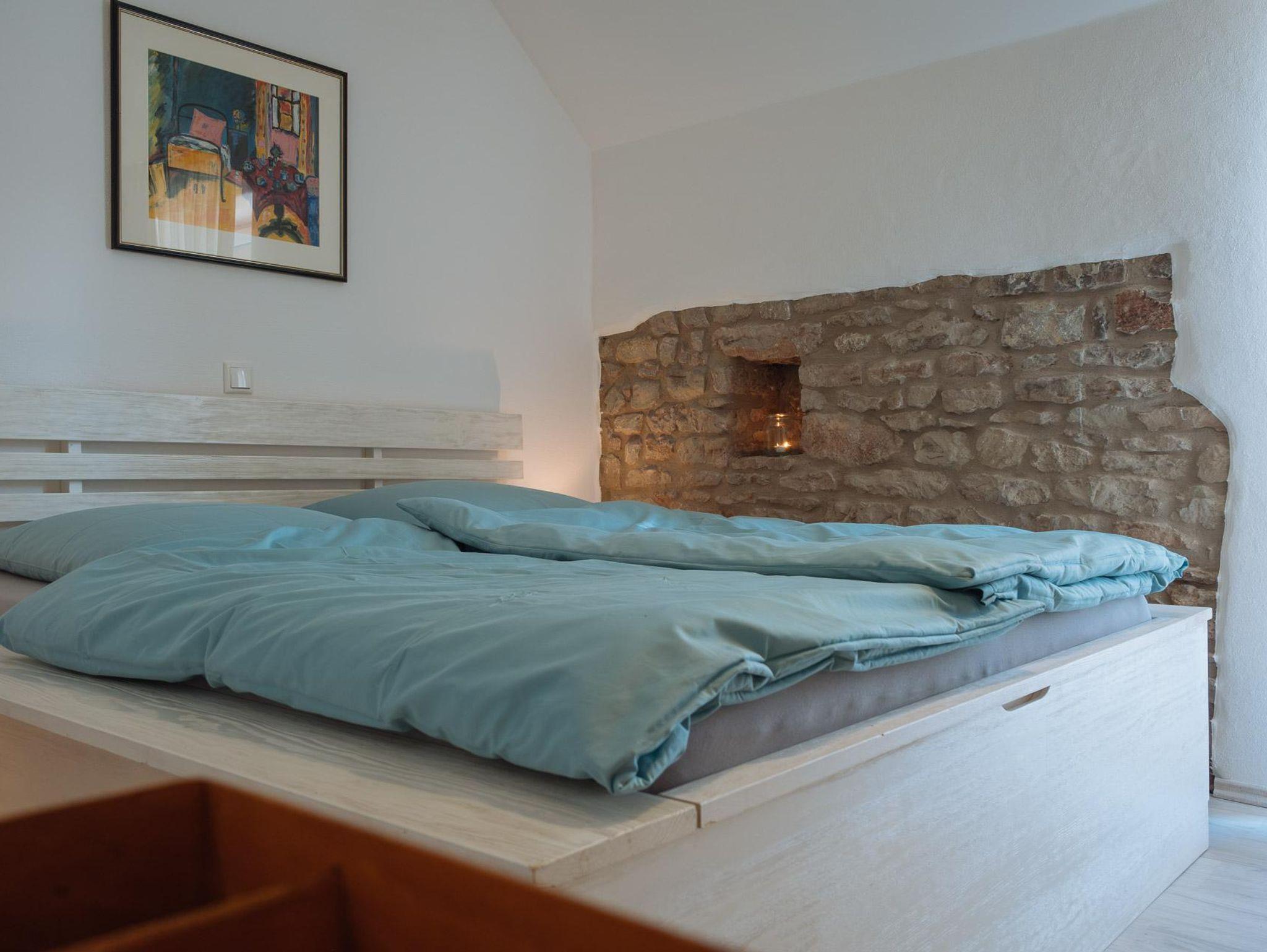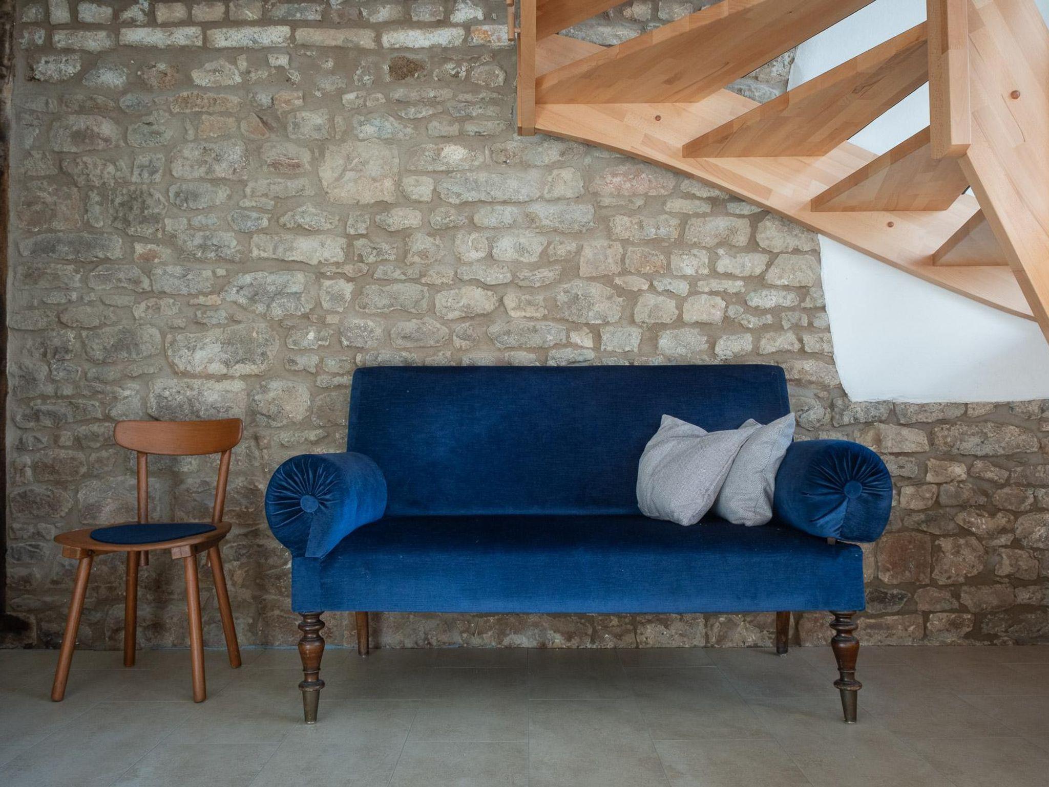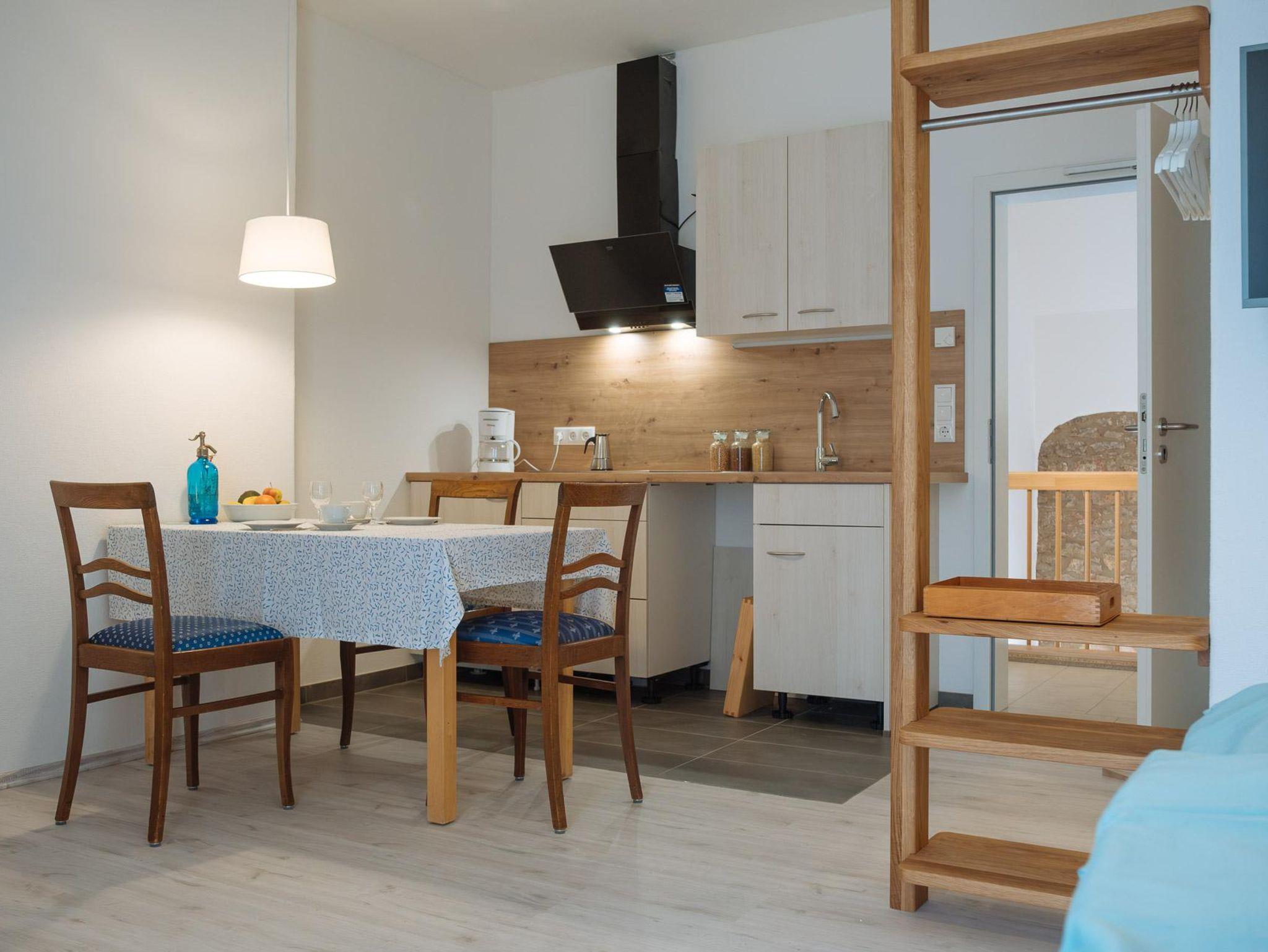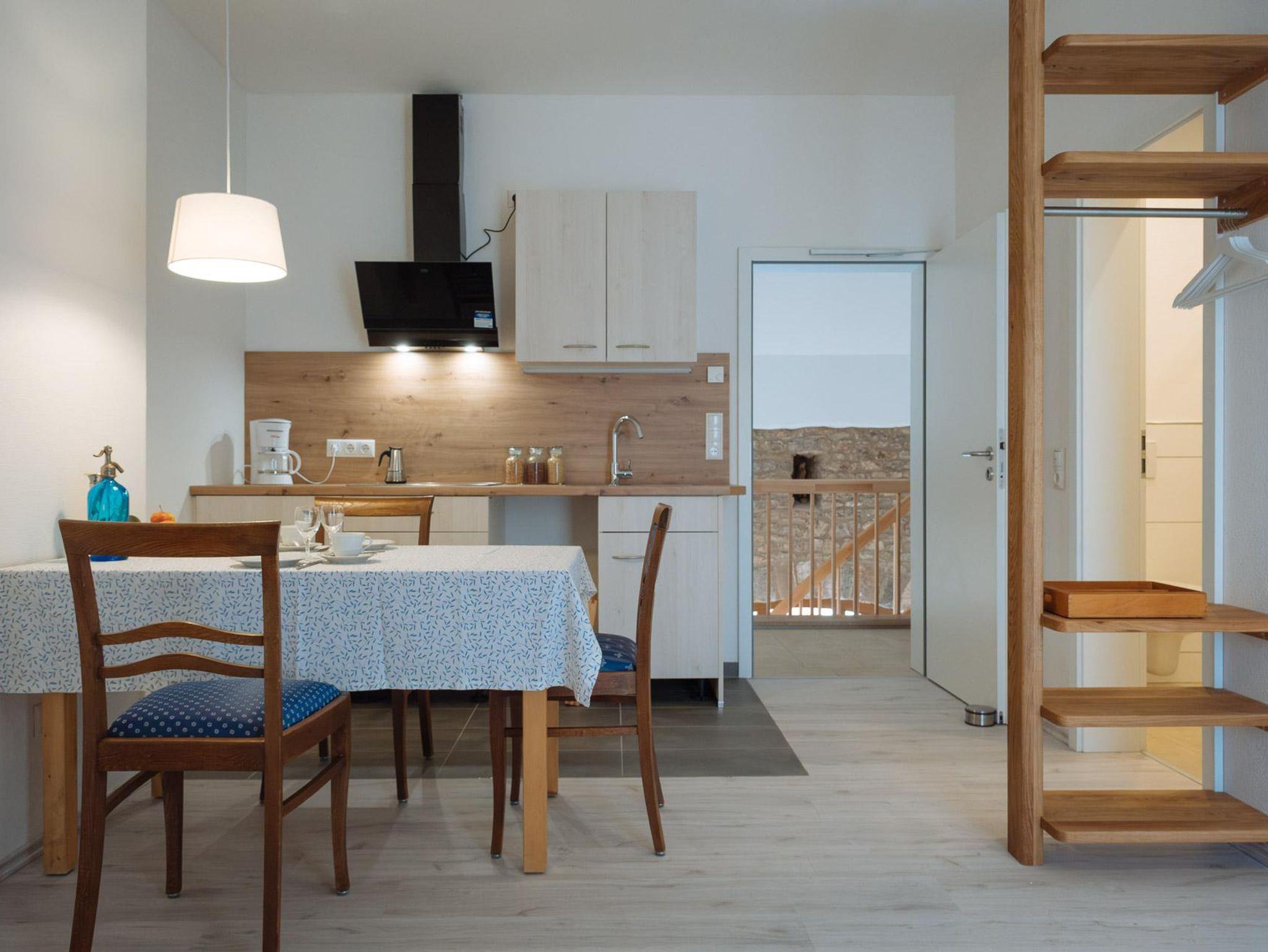 Dieses liebevoll eingerichtete Ferien-Appartment im ersten Obergeschoss einer umgebauten Bruchsteinscheune (Baujahr 1807) verbindet rustikalen Charme mit moderner Einrichtung und Komfort. Die 30-Quadratmeter-Wohnung ist ideal für Pärchen und Singles. In der kuscheligen Schlafnische mit Bruchsteinelementen steht ein gemütliches Doppelbett (160 cm breit). Daneben befindet sich ein modern eingerichtetes Duschbad. Im Hauptraum befindet sich eine moderne Einbauküche mit Spülmaschine und allem, was man zum Kochen braucht. In der Sitzecke mit zwei Sofas können Sie es sich mit einem Buch bequem machen. Oder vor dem Fernseher, der einen Satelittenanschluss hat und auch ans Internet angeschlossen ist. Von der Wohnküche gehen Sie direkt auf Ihre 20 Quadratmeter große, eigene Terrasse (Sonnenseite), die mit einem großen Sonneschirm und Gartenmöbel ausgestattet ist. Von der Terrasse kommen Sie über eine Treppe direkt in auf eine große Wiese, wo ein Holzhaus für Kinder steht und sich ein großer, überdachter Grill-/Feuerplatz befindet.