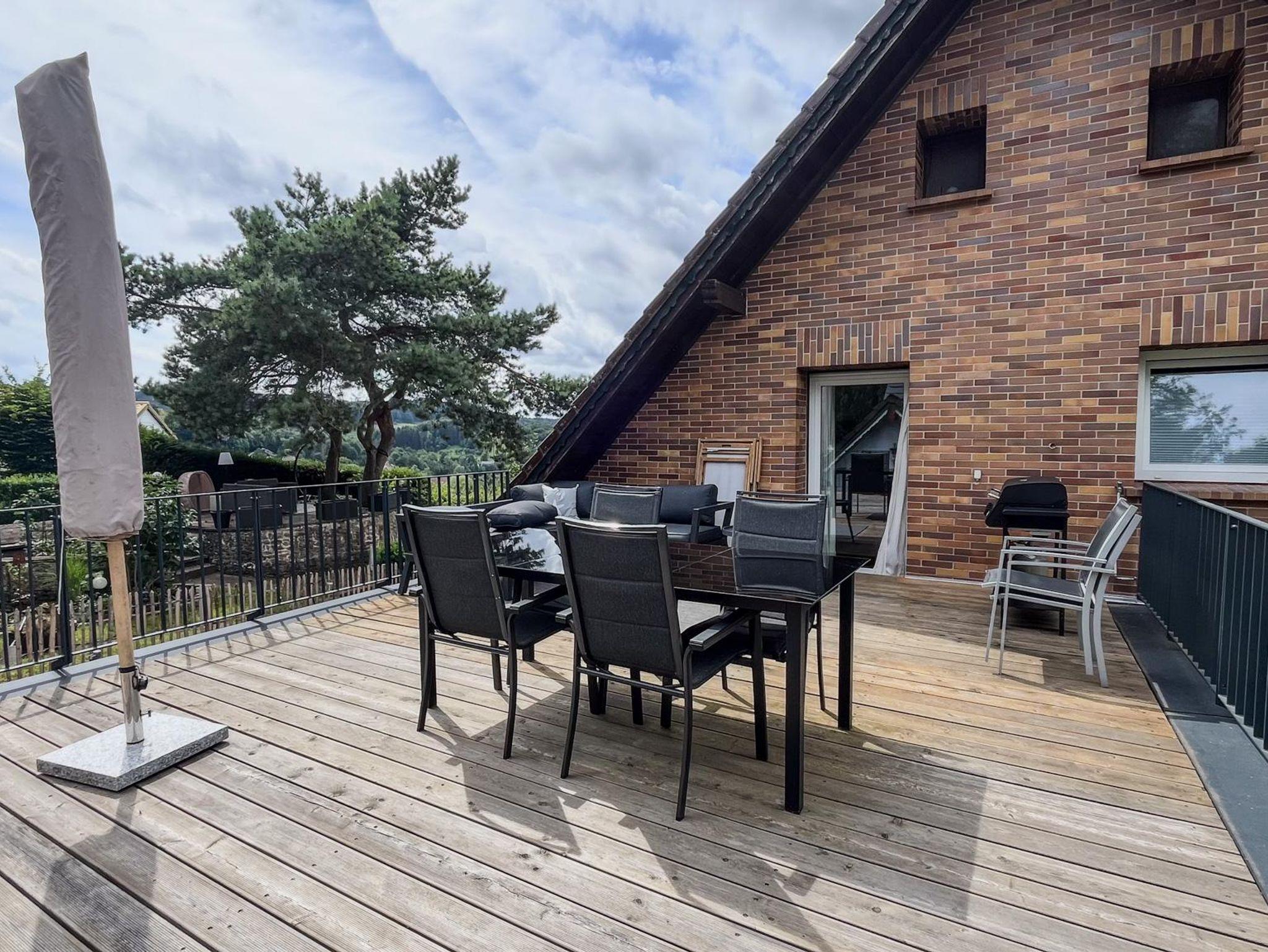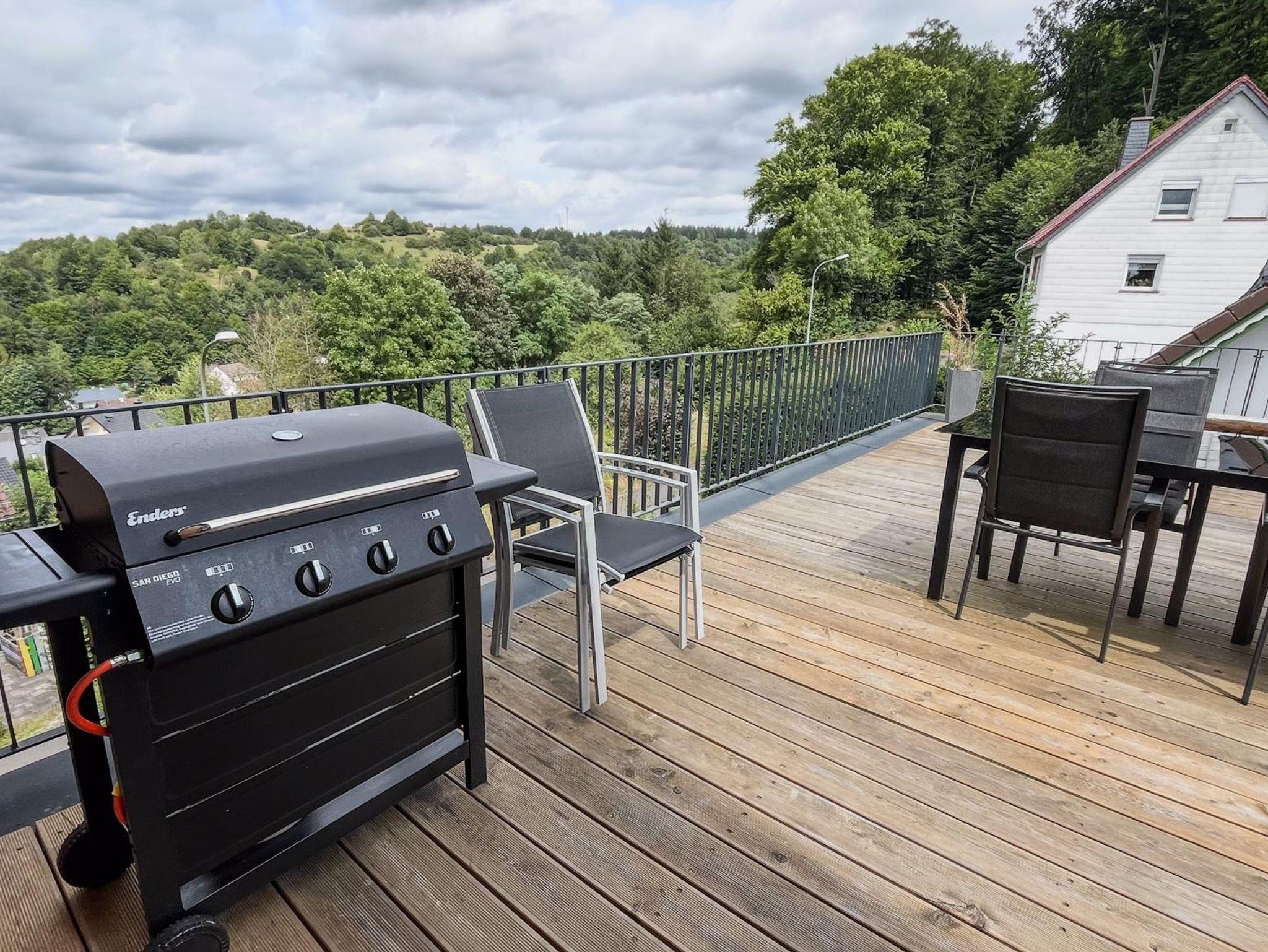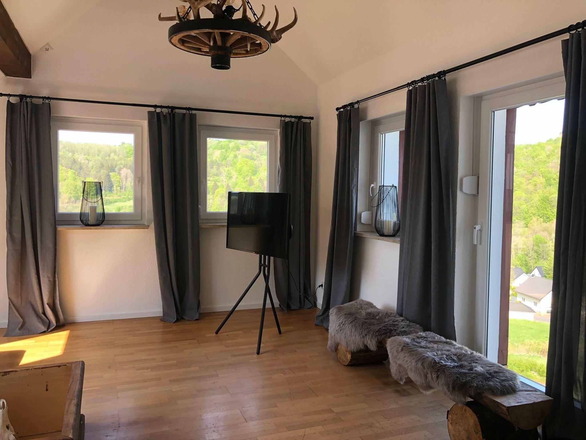 Wohnzimmer Machen Sie es sich gemütlich mit einem Glas Wein oder Bier und genießen Sie die Aussicht über die Eifel. Sehen Sie die Kasselburg? Und haben Sie schon die Wölfe heulen gehört?