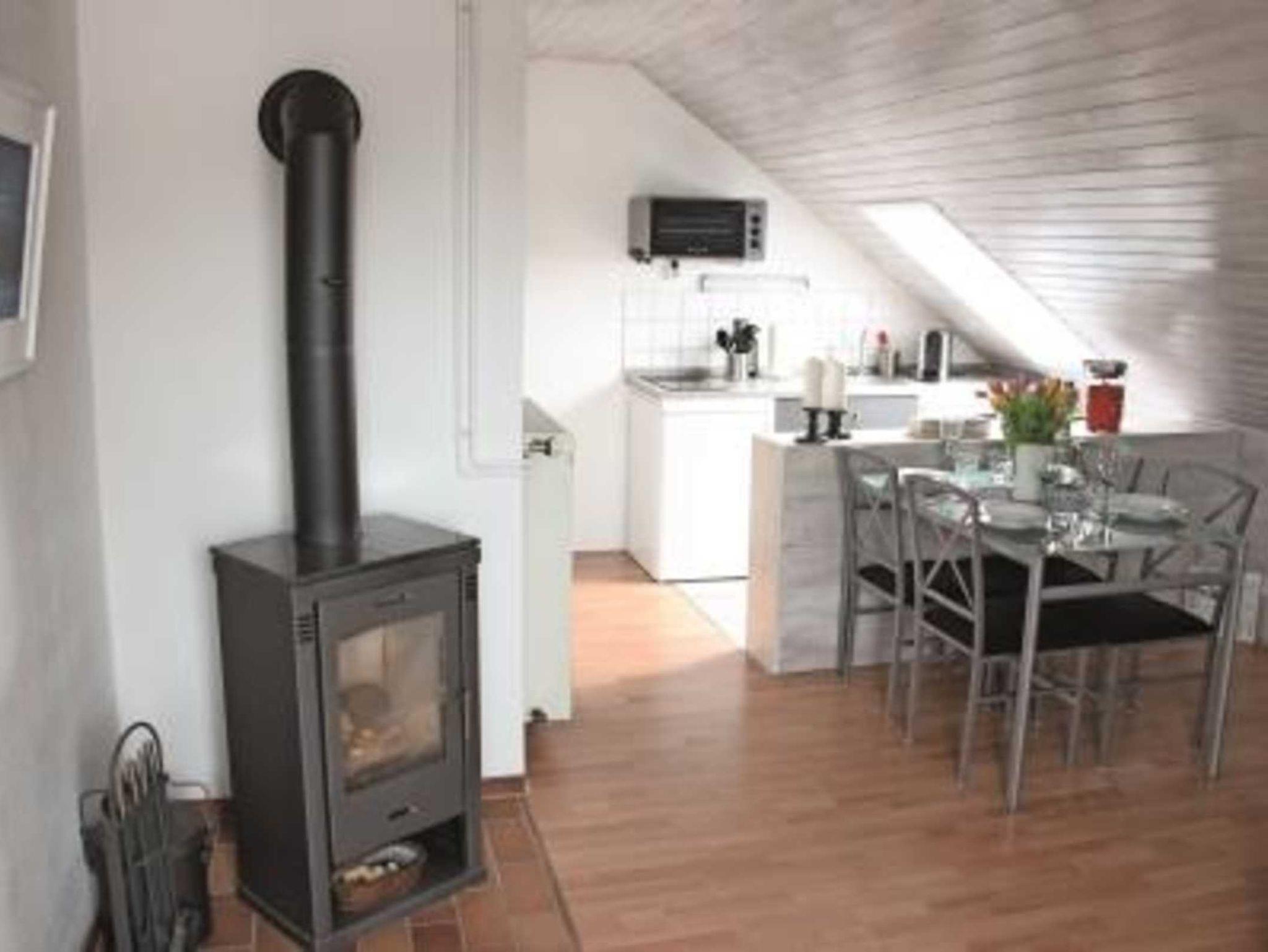 Das Wohnzimmer ist ausgestattet mit einem TV-Gerät und CD-Radio. Für gemütliche Stunden an kalten Tagen sorgt der Kaminofen.