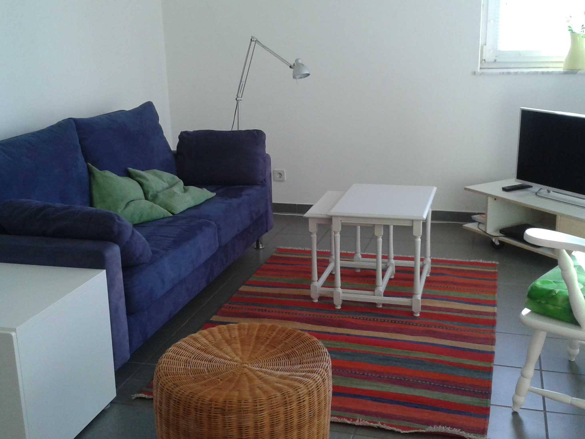Die gesamte Wohnung ist weiß gestrichen und grau gefliest. Im Flur finden die Gäste einen Einbauschrank für Garderobe und Schuhe. Das Schlafzimmer verfügt über große, weiße Einbauschränke, zwei zusammenstehende Einzelbetten mit Nachtschränkchen, ein Kinderbett, eine Kommode sowie einen kleinen Balkon (mit zwei Stühlen) zur Straße. Das Wohnzimmer ist zum Flur offen und ist folgendermaßen eingerichtet: blaue Schlafcouch mit Federkern