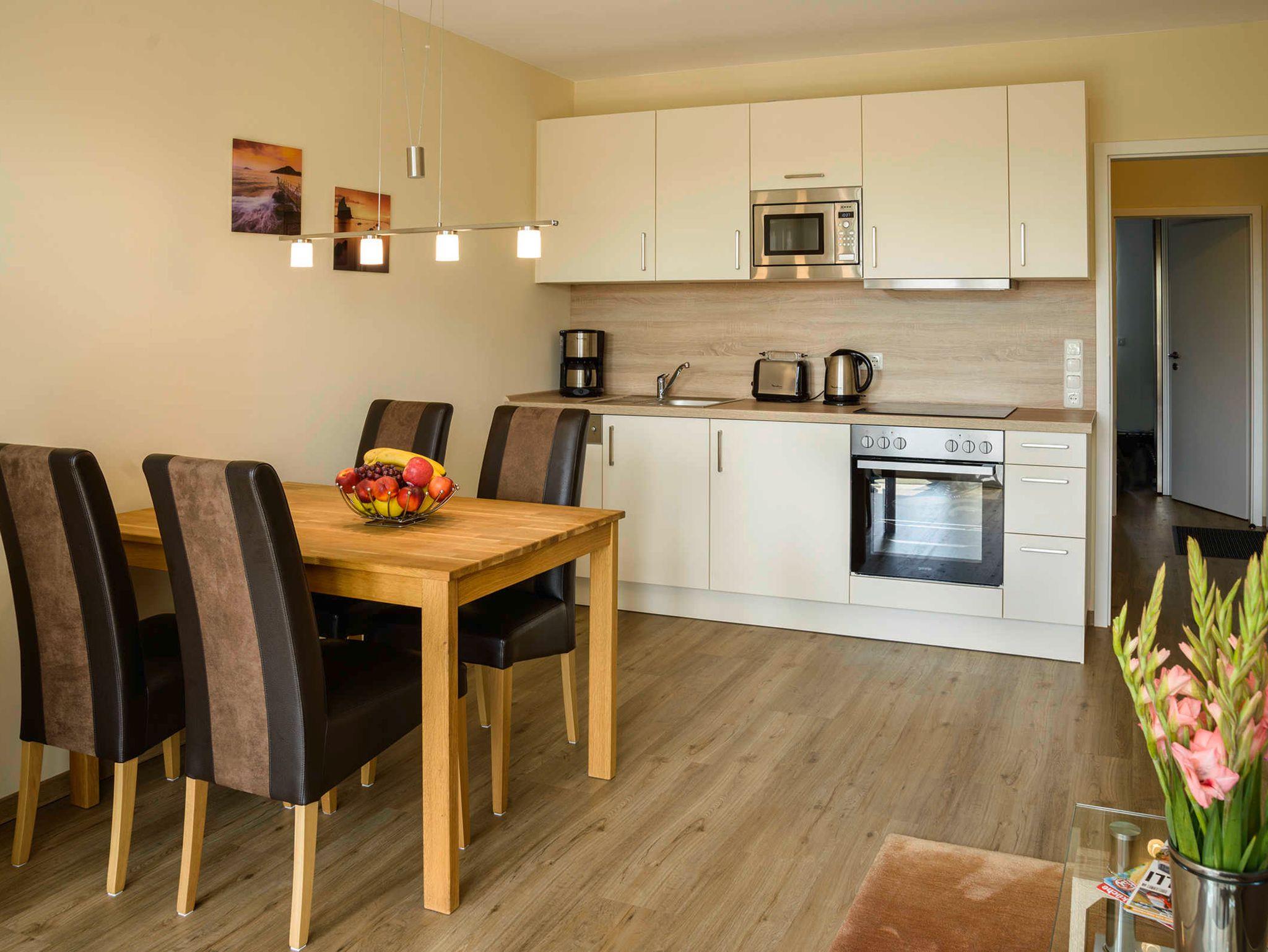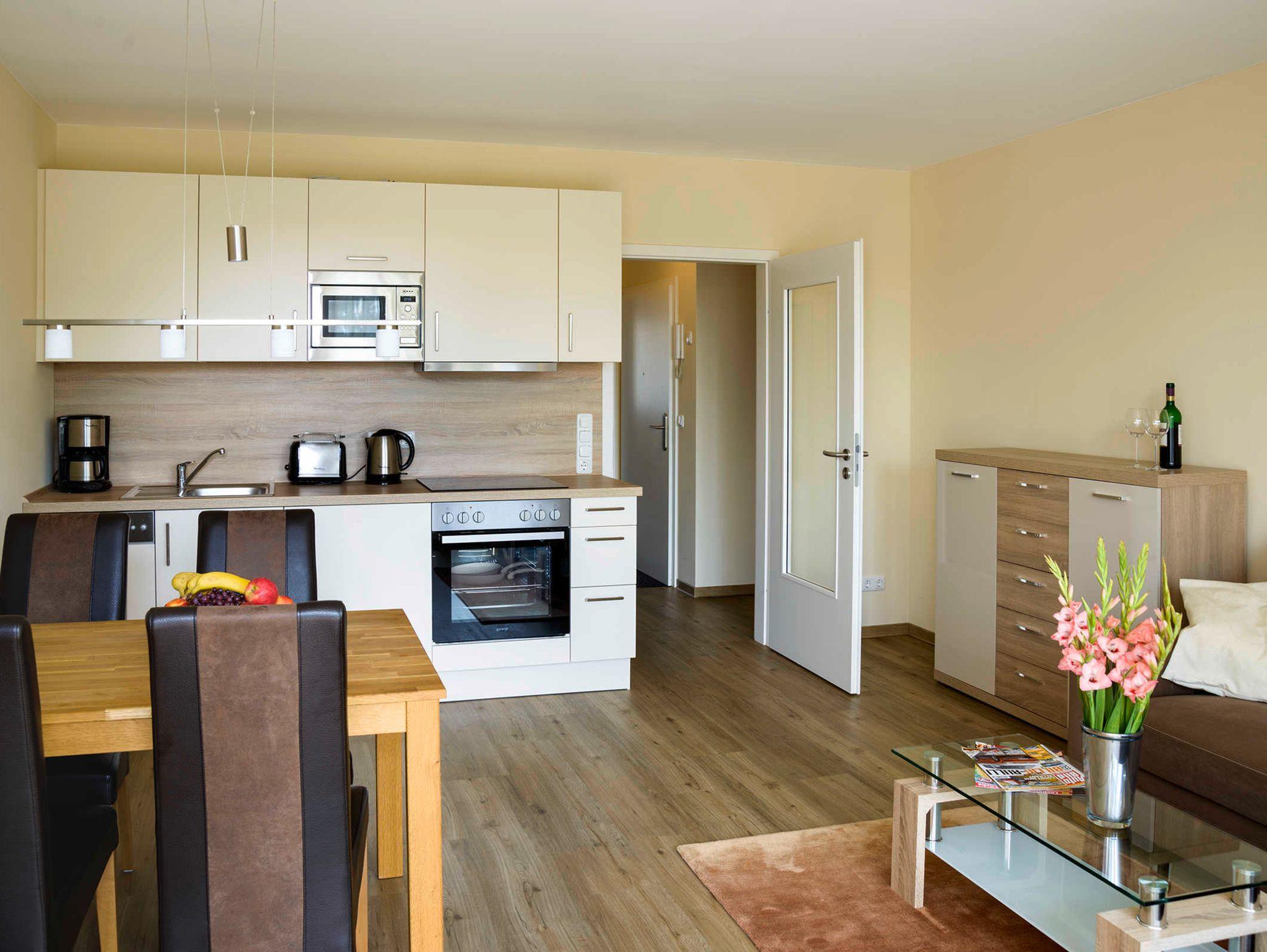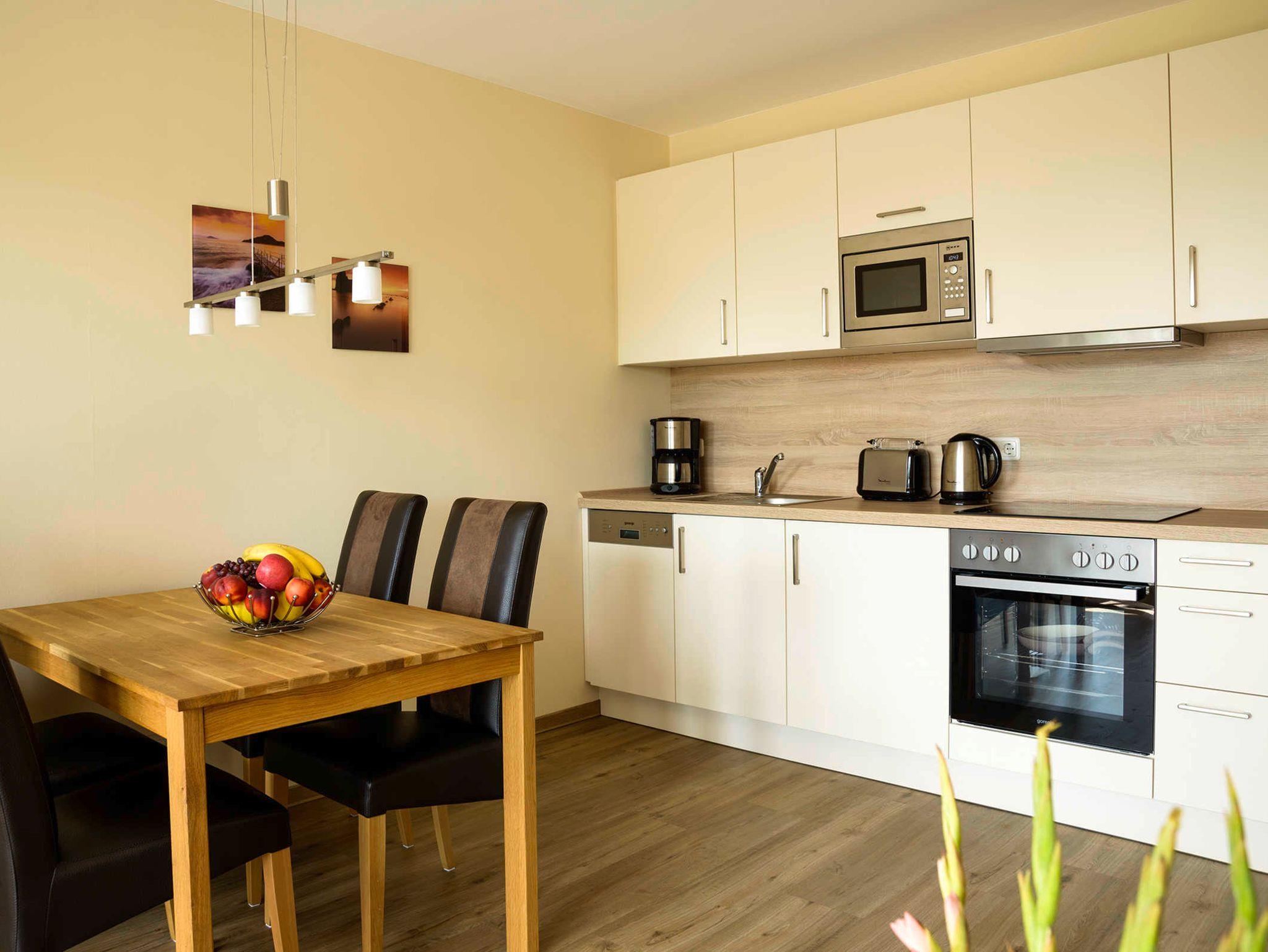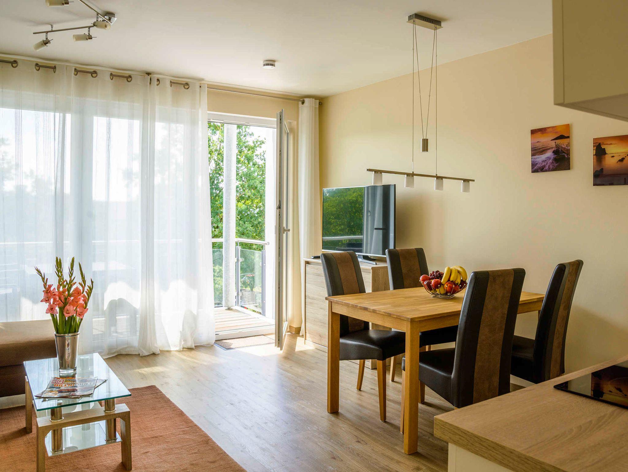 Küche: die offene Wohnküche integriert sich nahtlos in den Wohnbereich. Hier findet sich alles, was man braucht. Geschirrspüler, Herd, Mikrowelle, Kaffeemaschine, Wasserkocher sowie ausreichend Geschirr, Töpfe, Gläser und Besteck sind vorhanden. Badezimmer: das freundliche Badezimmer ist funktional eingerichtet. Eine große ebenerdige Duschecke und reichlich Ablagefläche für persönliche Dinge machen das Bad zu einem Wohlfühlbereich. Ein Fön ist natürlich vorhanden.Eine Waschmaschine ergänzt den Komfort. Schlafzimmer: ein Doppelbett mit Kaltschaum-Matratzen lässt unsere Gäste gut zur Ruhe kommen. Ein großer Kleiderschrank bietet Platz für mitgebrachte Sachen. Die Beschattung durch elektrische Rollläden ist inklusive. Balkon: der halbüberdachte Balkon wurde mit Bangkirai belegt. Von hier kann man auch ein bißchen die Ostsee sehen. Eine Sitzgruppe, bestehend aus einem Tisch mit 4 Stühlen, sorgt für einen schönen Urlaubstag.
