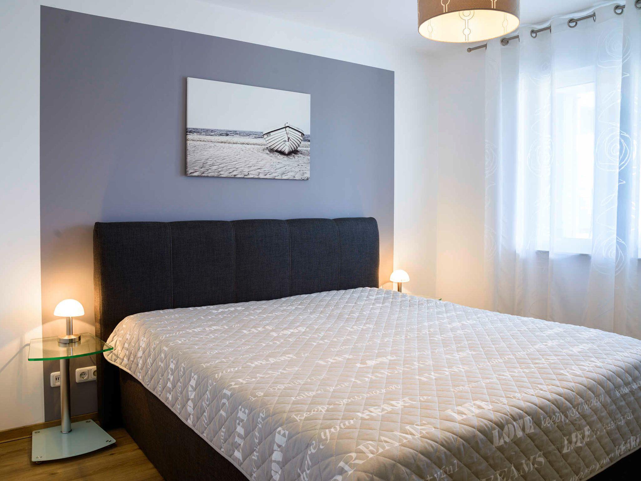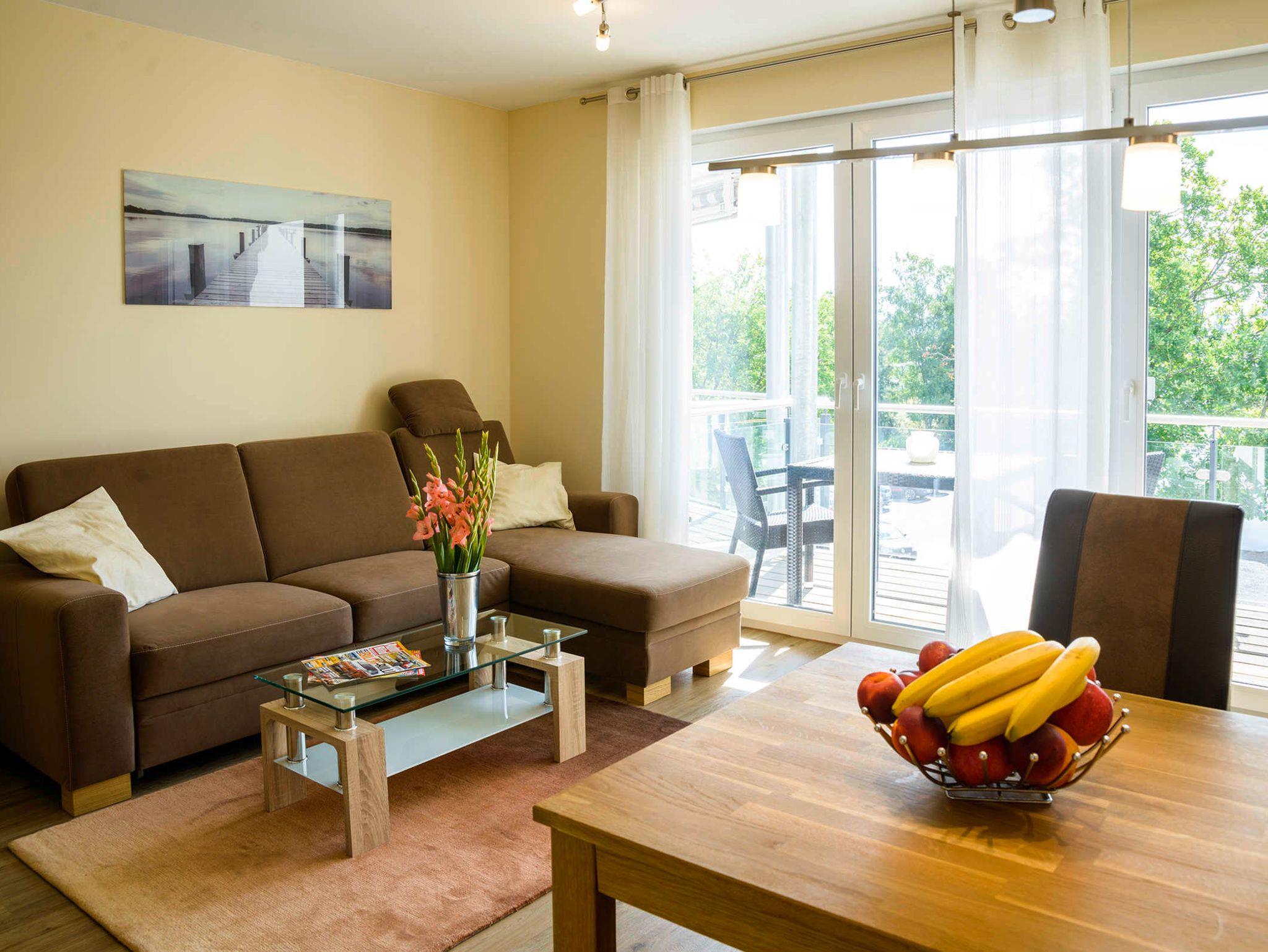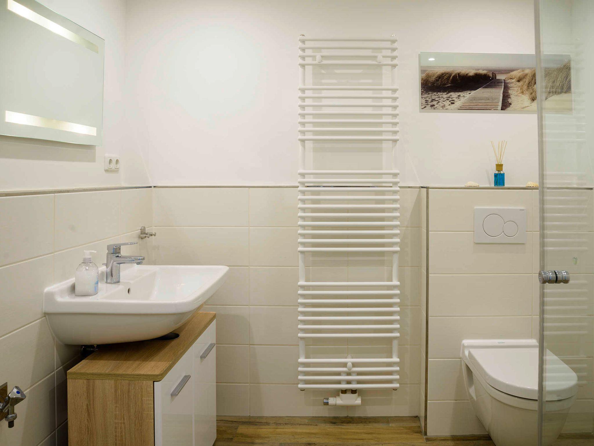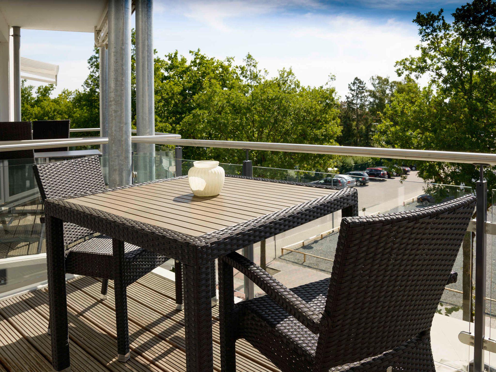 Küche: die offene Wohnküche integriert sich nahtlos in den Wohnbereich. Hier findet sich alles, was man braucht. Geschirrspüler, Herd, Mikrowelle, Kaffeemaschine, Wasserkocher sowie ausreichend Geschirr, Töpfe, Gläser und Besteck sind vorhanden. Badezimmer: das freundliche Badezimmer ist funktional eingerichtet. Eine große ebenerdige Duschecke und reichlich Ablagefläche für persönliche Dinge machen das Bad zu einem Wohlfühlbereich. Ein Fön ist natürlich vorhanden.Eine Waschmaschine ergänzt den Komfort. Schlafzimmer: ein Doppelbett mit Kaltschaum-Matratzen lässt unsere Gäste gut zur Ruhe kommen. Ein großer Kleiderschrank bietet Platz für mitgebrachte Sachen. Die Beschattung durch elektrische Rollläden ist inklusive. Balkon: der halbüberdachte Balkon wurde mit Bangkirai belegt. Von hier kann man auch ein bißchen die Ostsee sehen. Eine Sitzgruppe, bestehend aus einem Tisch mit 4 Stühlen, sorgt für einen schönen Urlaubstag.