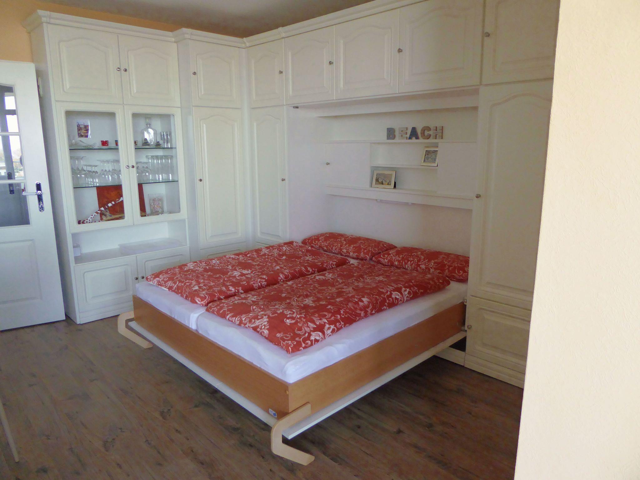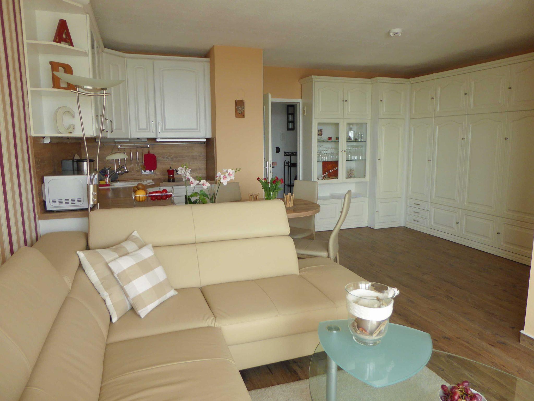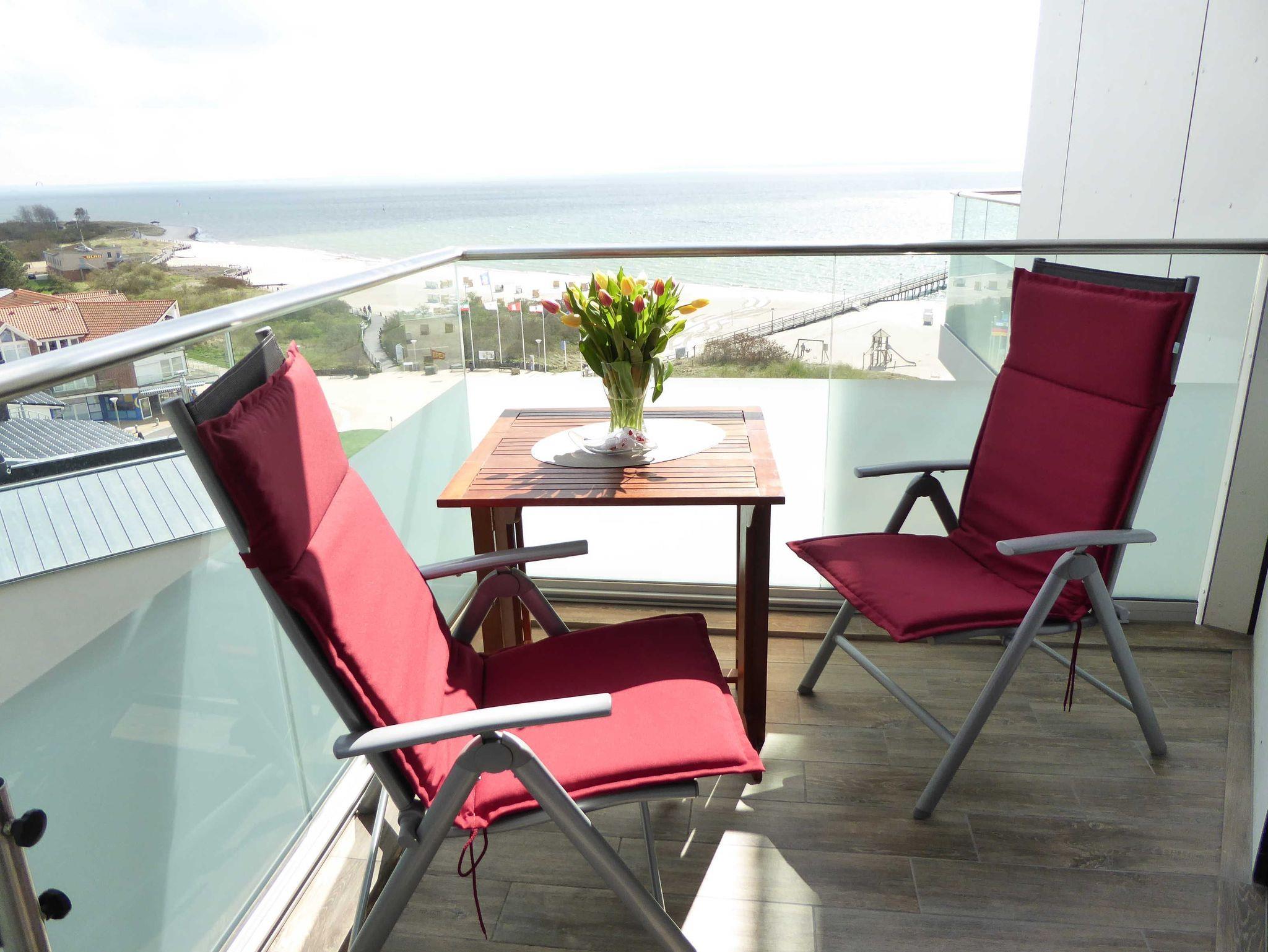 Das sehr geschmackvoll eingerichtete Appartement bietet einen fantastischen Blick über den langen weißen Sandstrand und das Meer. Die mit viel Liebe zum Detail ausgestattete helle Wohnung besteht aus einem kombinierten Wohn-/Schlafraum mit einem komfortablen Schrankdoppelbett (1,60 x 2 m), einer hochwertigen, komplett eingerichteten weißen Einbauküche (inkl. Spülmaschine und Mikrowelle) sowie integriertem Essplatz. Das Ledersofa im Wohnbereich lädt zum gemütlichen Lesen oder Fernsehen ein. Das kleine charmante Schlafzimmer ist mit einem französischen Bett eingerichtet (1,40 x 1,90 m), der optimal eingepasste Kleiderschrank bietet viel Stauraum. Natürlich verfügt die Wohnung auch über ein schönes Duschbad mit WC. Vom Balkon im 7. Stock genießen unsere Gäste den herrlichen Ausblick über die Lübecker Bucht bis nach Rettin.