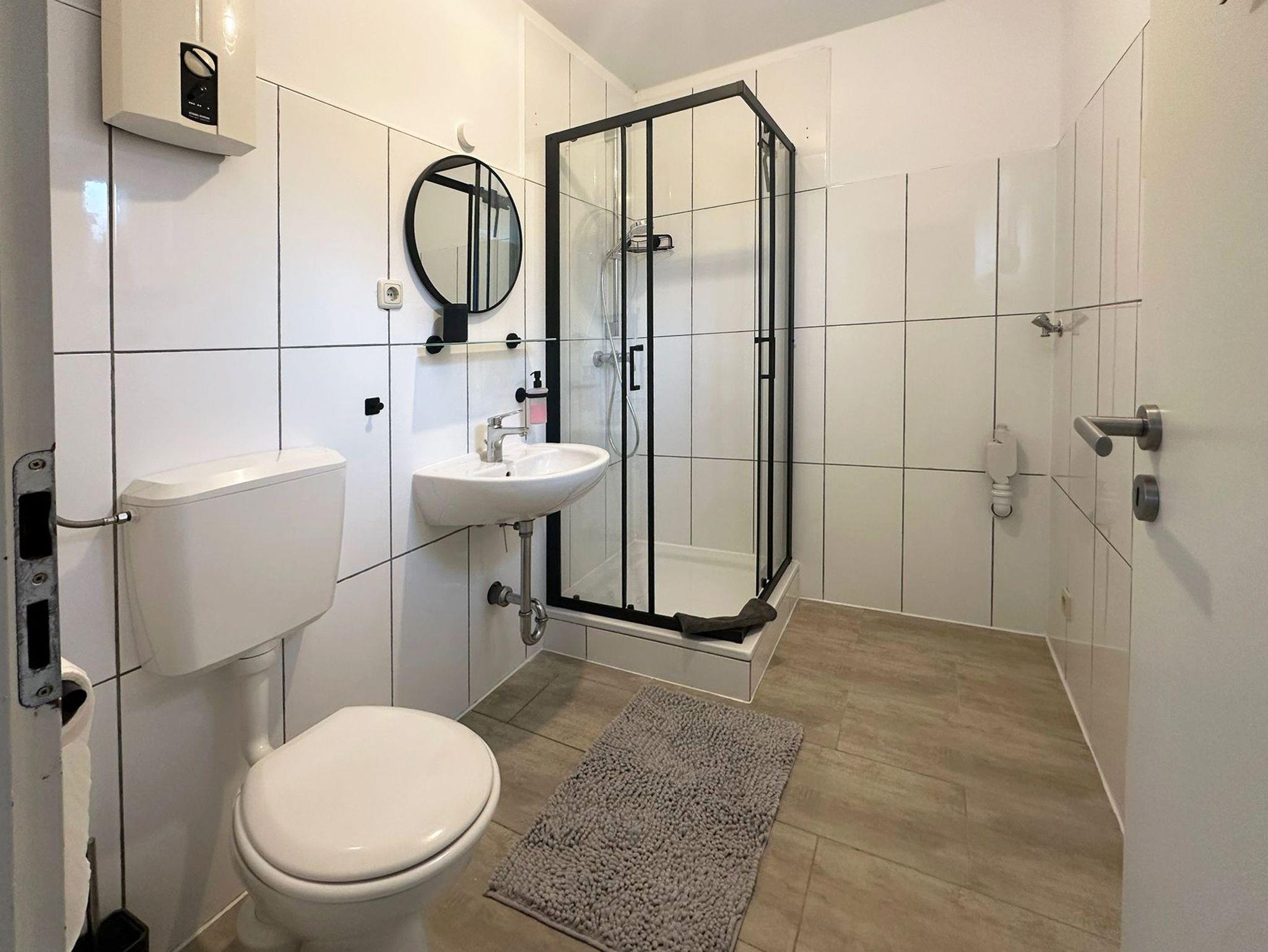 Auf der anderen Seite des Flurs befindet sich das Bad mit Dusche und WC.
