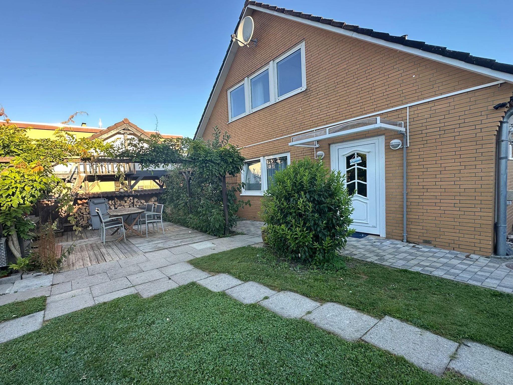Der kleine Gartenbereich lädt mit seiner Sitzecke zum Verweilen ein. Auch ein Grill kann genutzt werden.