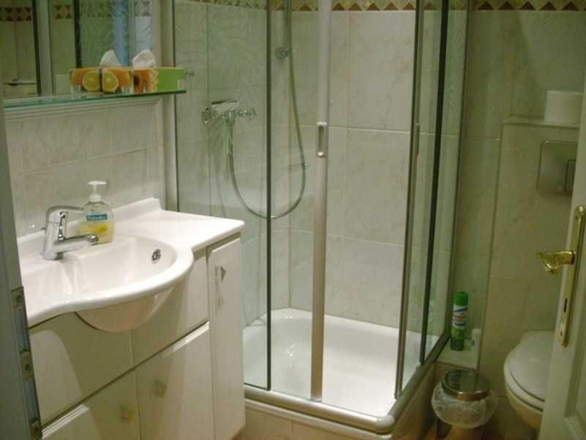 Das geschmackvolle Duschbad mit terrakottafarbenem Boden und weiß gefliesten Wänden sorgt für Entspannung nach einem anstrengenden Urlaubstag. Sowohl Dusche als auch WC und Waschtisch sind in dezentem weiß gehalten.